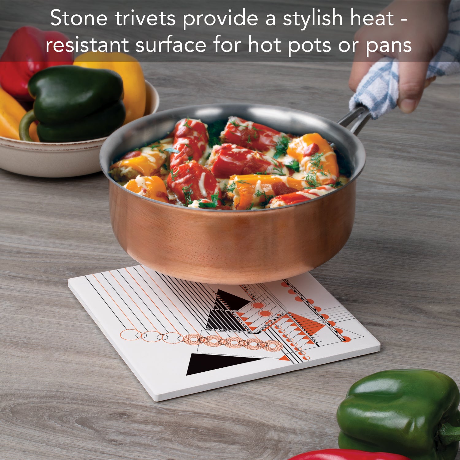 DURABLE-Trivet is made from strong durable ceramic stone. Stone absorbs heat and distributes it throughout the Trivet to keep from damaging your favorite pots and surfaces.