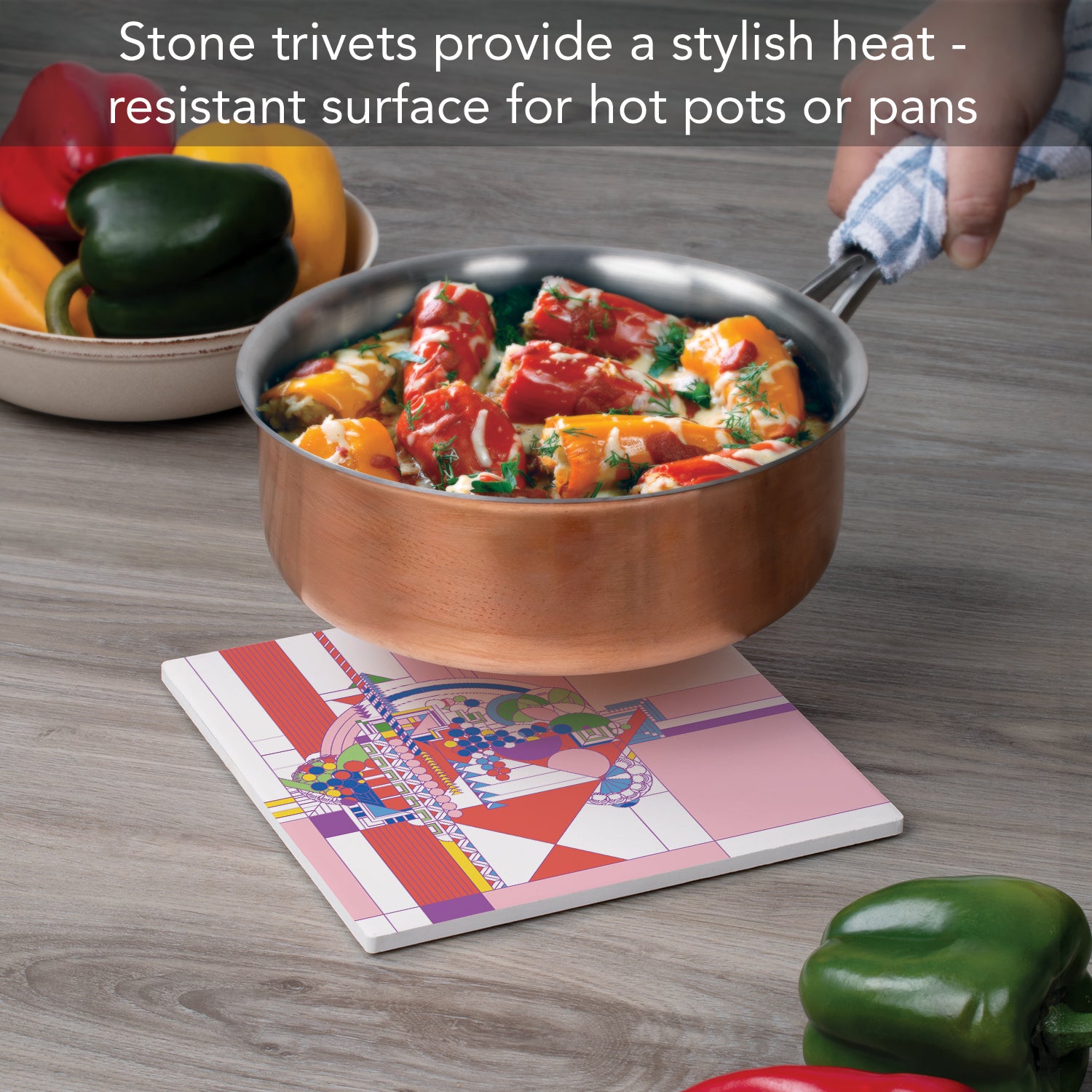 DURABLE-Trivet is made from strong durable ceramic stone. Stone absorbs heat and distributes it throughout the Trivet to keep from damaging your favorite pots and surfaces.
