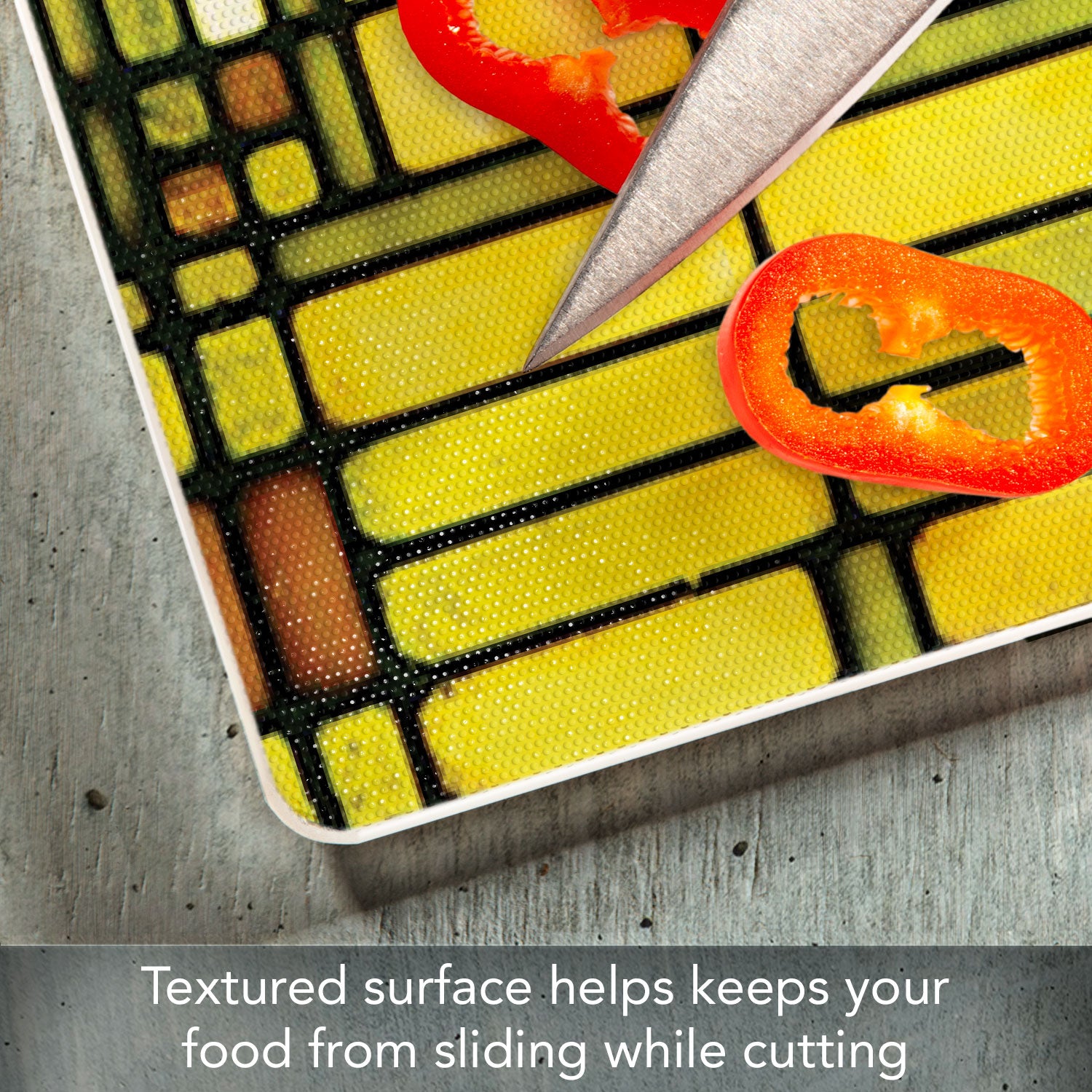 - FEATURES- Surface of Cutting Board is slightly textured to help keep foods stable as they are being chopped and diced. Rubber Non-Skid feet on bottom of the board protects your surfaces from scratches and stains.