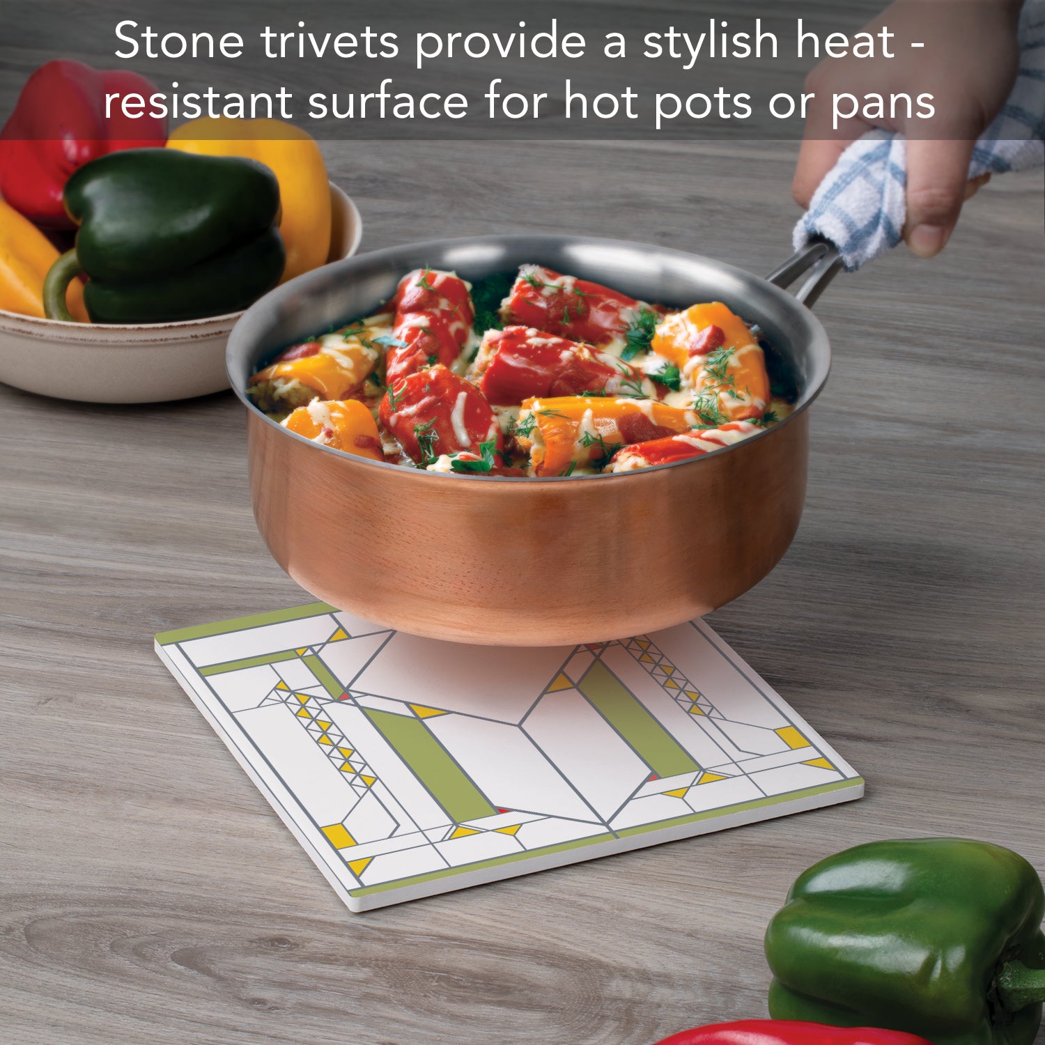 DURABLE-Trivet is made from strong durable ceramic stone. Stone absorbs heat and distributes it throughout the Trivet to keep from damaging your favorite pots and surfaces.