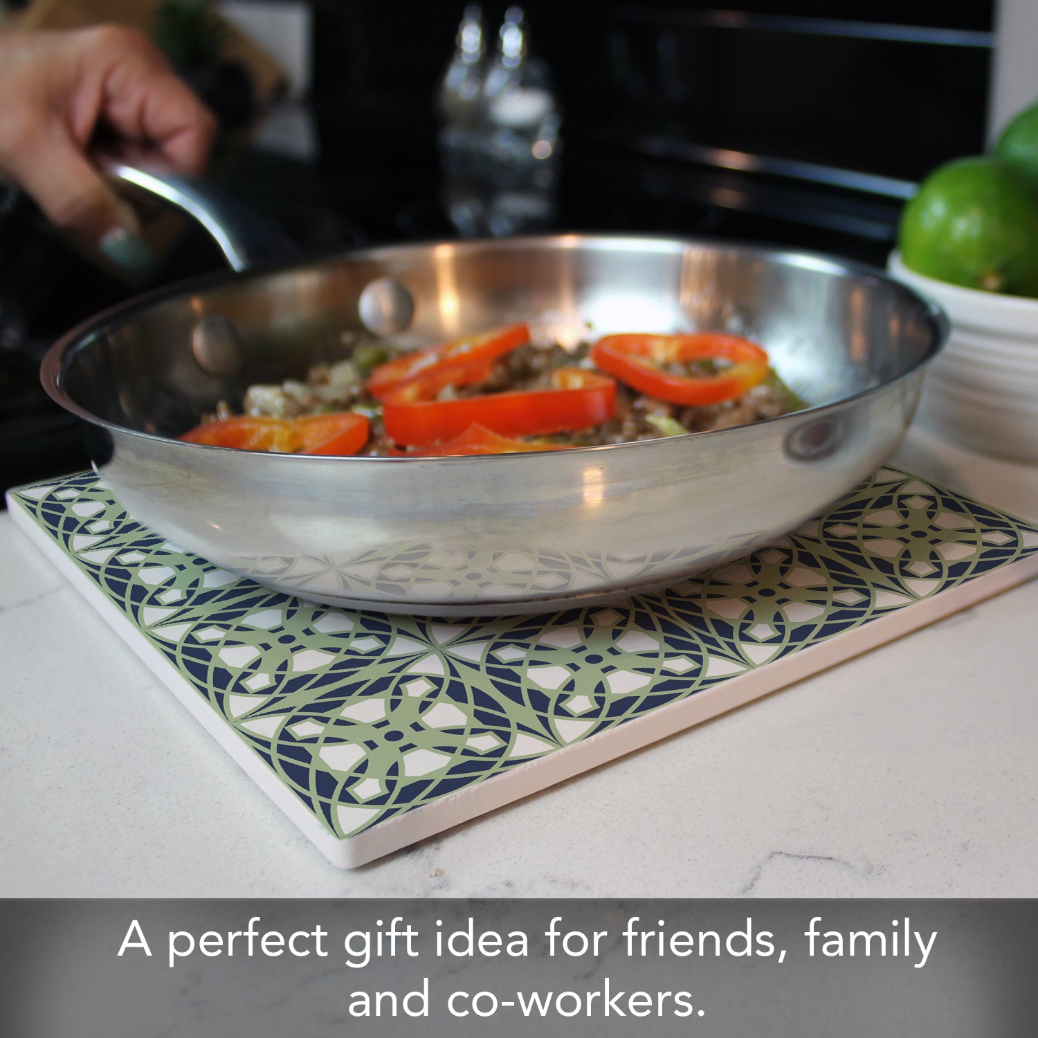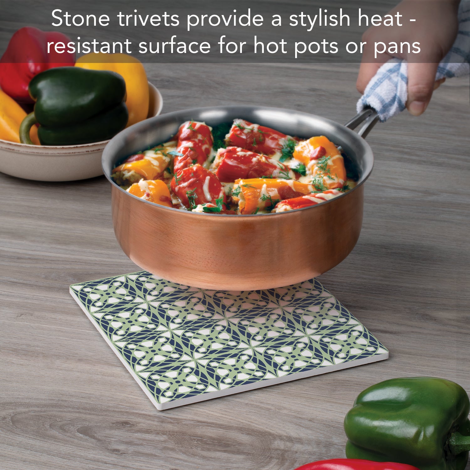 DURABLE-Trivet is made from strong durable ceramic stone. Stone absorbs heat and distributes it throughout the Trivet to keep from damaging your favorite pots and surfaces.
