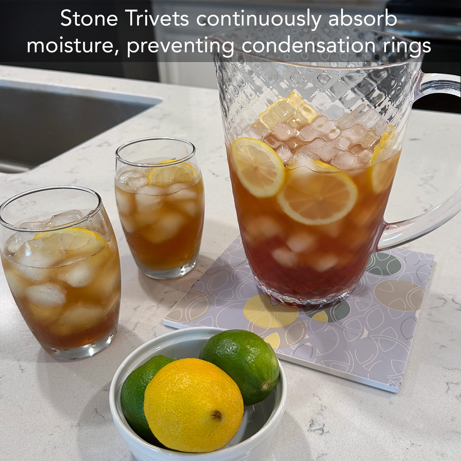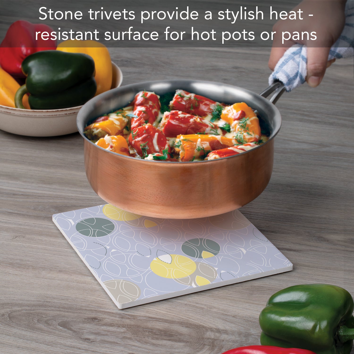 DURABLE-Trivet is made from strong durable ceramic stone. Stone absorbs heat and distributes it throughout the Trivet to keep from damaging your favorite pots and surfaces.