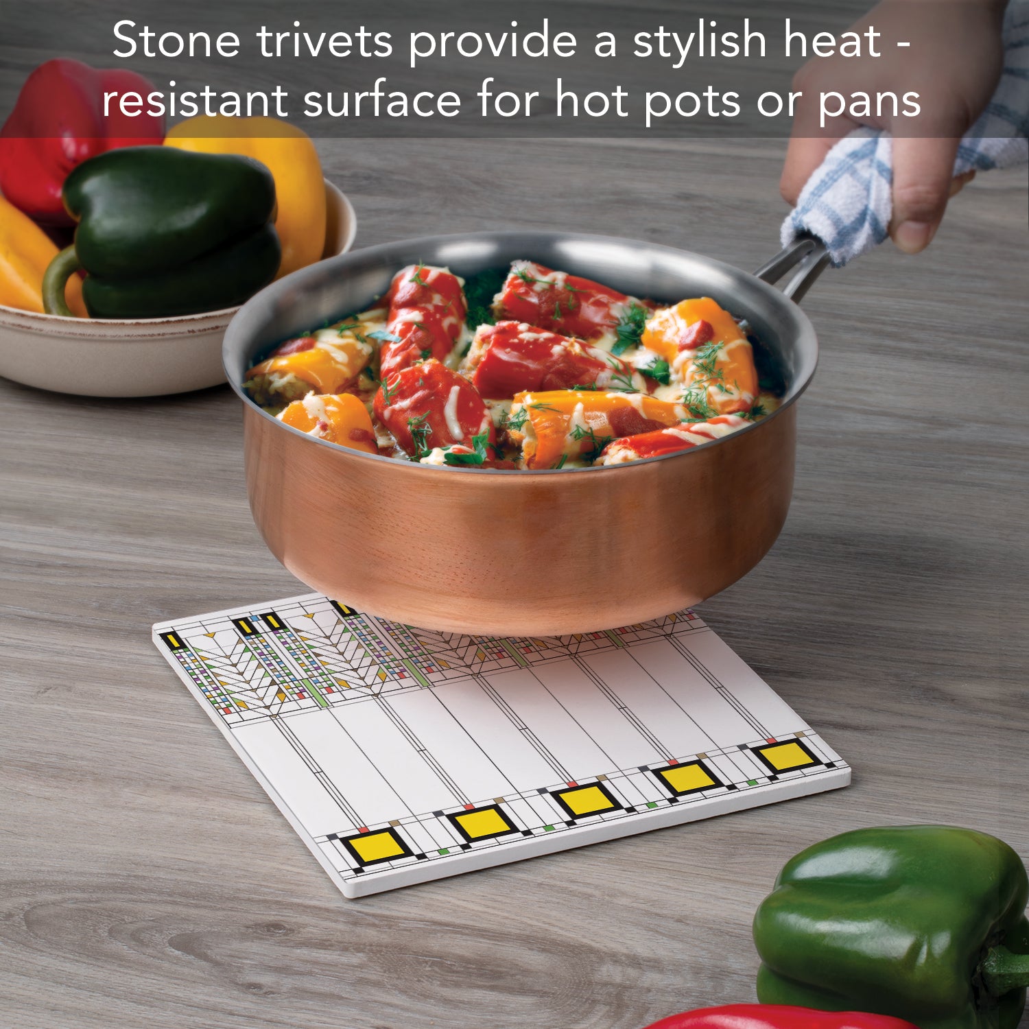 DURABLE-Trivet is made from strong durable ceramic stone. Stone absorbs heat and distributes it throughout the Trivet to keep from damaging your favorite pots and surfaces.