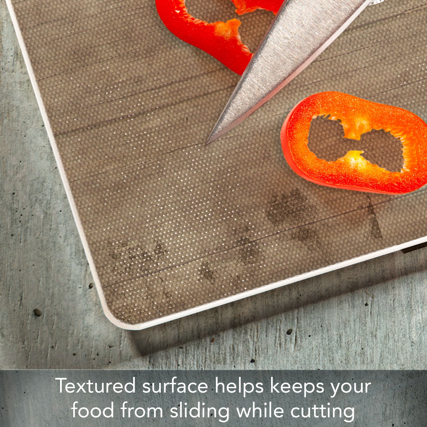 - FEATURES- Surface of Cutting Board is slightly textured to help keep foods stable as they are being chopped and diced. Rubber Non-Skid feet on bottom of the board protects your surfaces from scratches and stains.