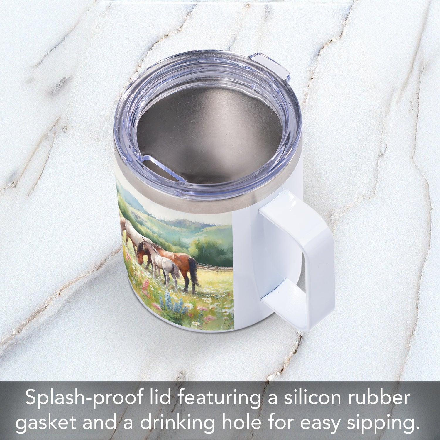 FEATURES-Mug features a full-size handle for a comfortable and safe grip. Includes lid that secures with a rubber ring. Non-porous surface prevents staining. Mug is dishwasher safe.