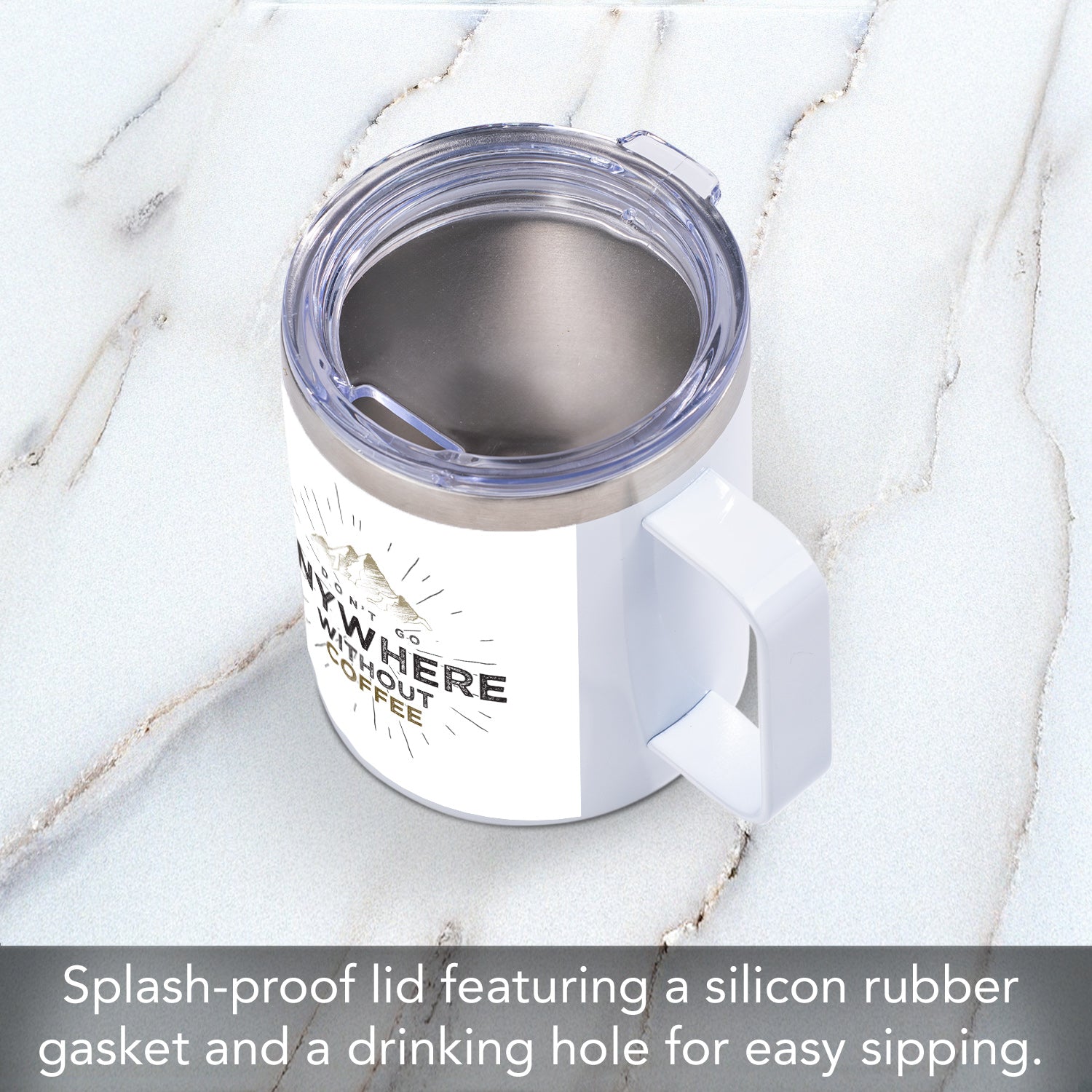 FEATURES-Mug features a full-size handle for a comfortable and safe grip. Includes lid that secures with a rubber ring. Non-porous surface prevents staining. Mug is dishwasher safe.