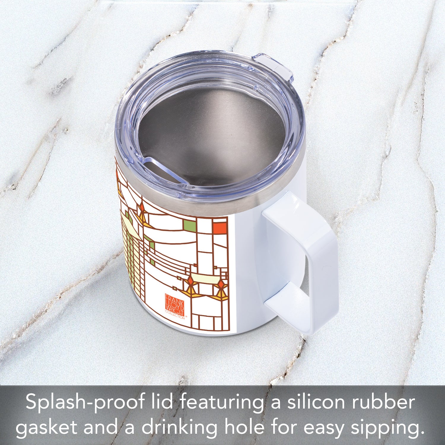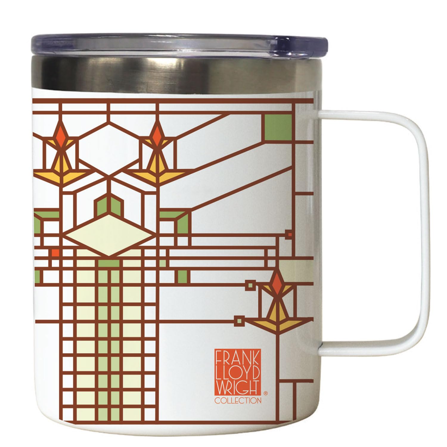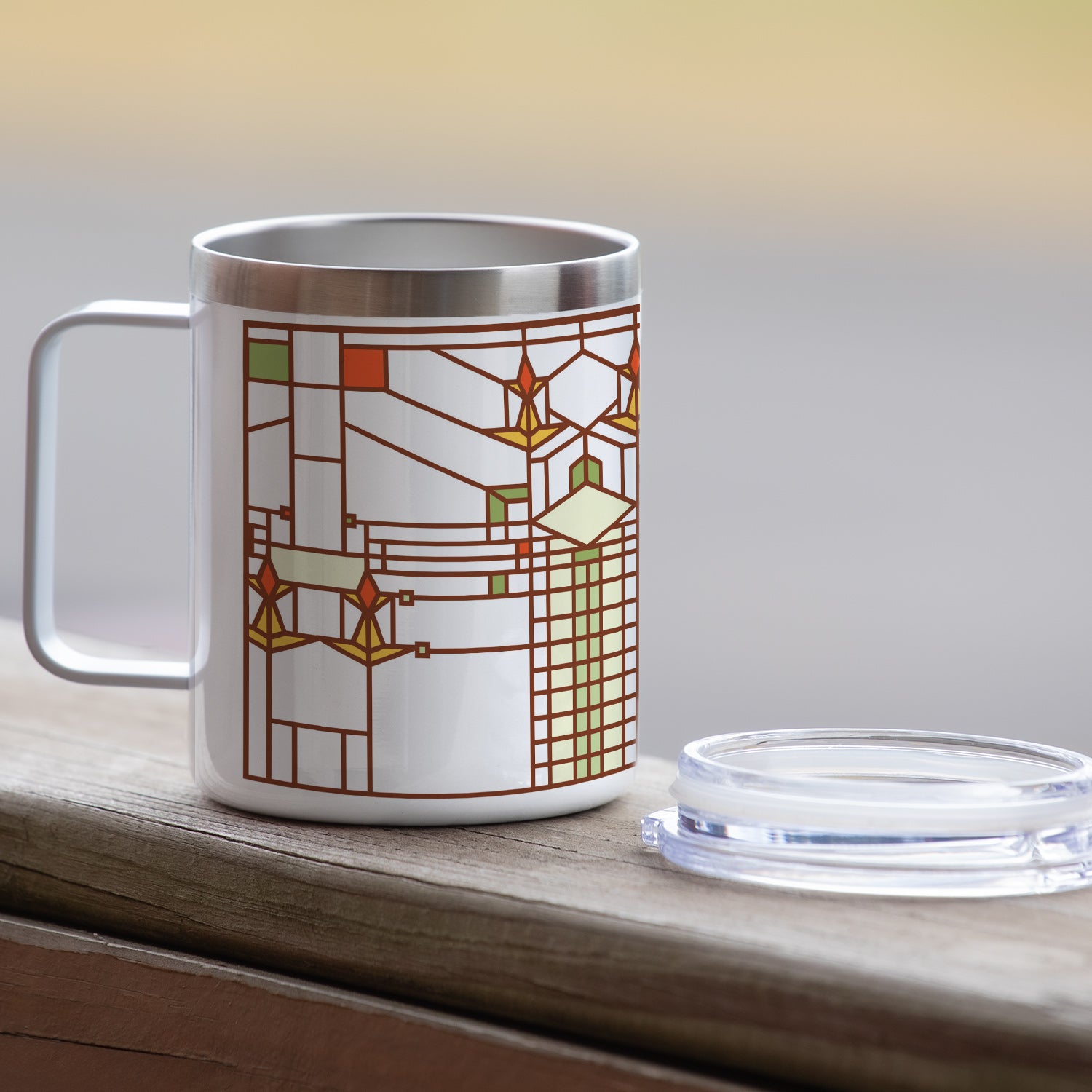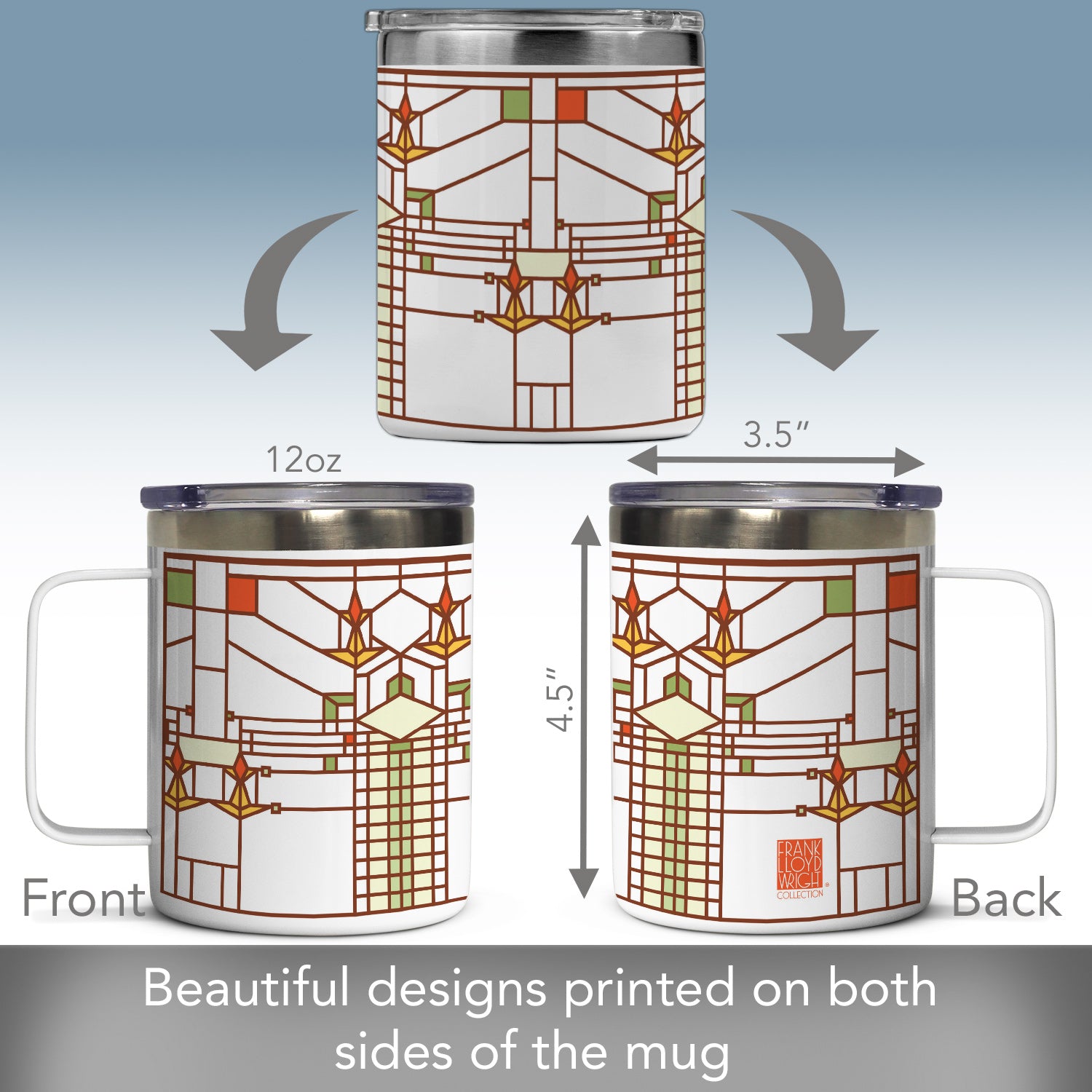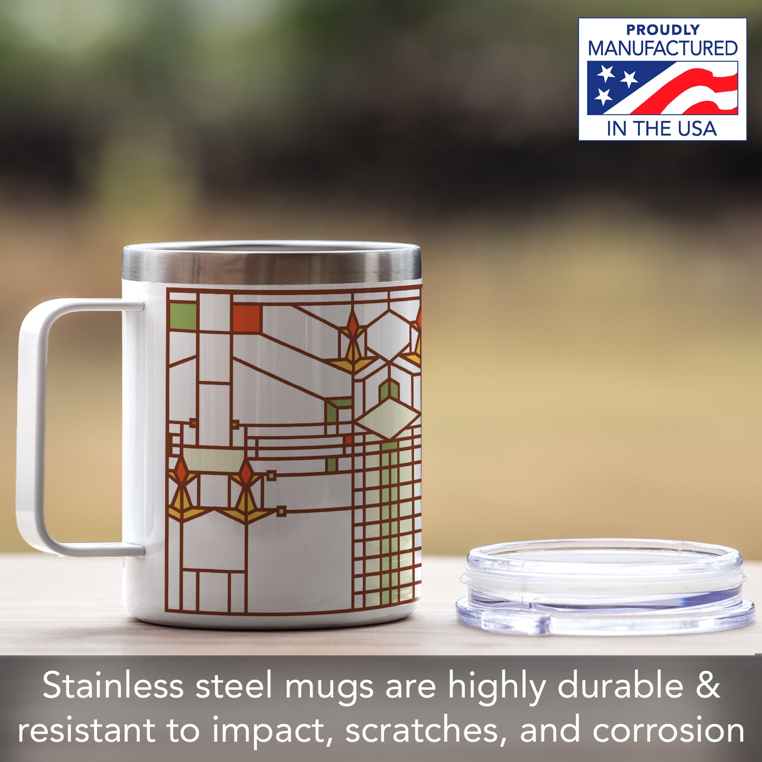 Frank Lloyd Wright's B. Harley Bradley House Design on Stainless Steel Mug with Lid 12 oz. Manufactured in the USA