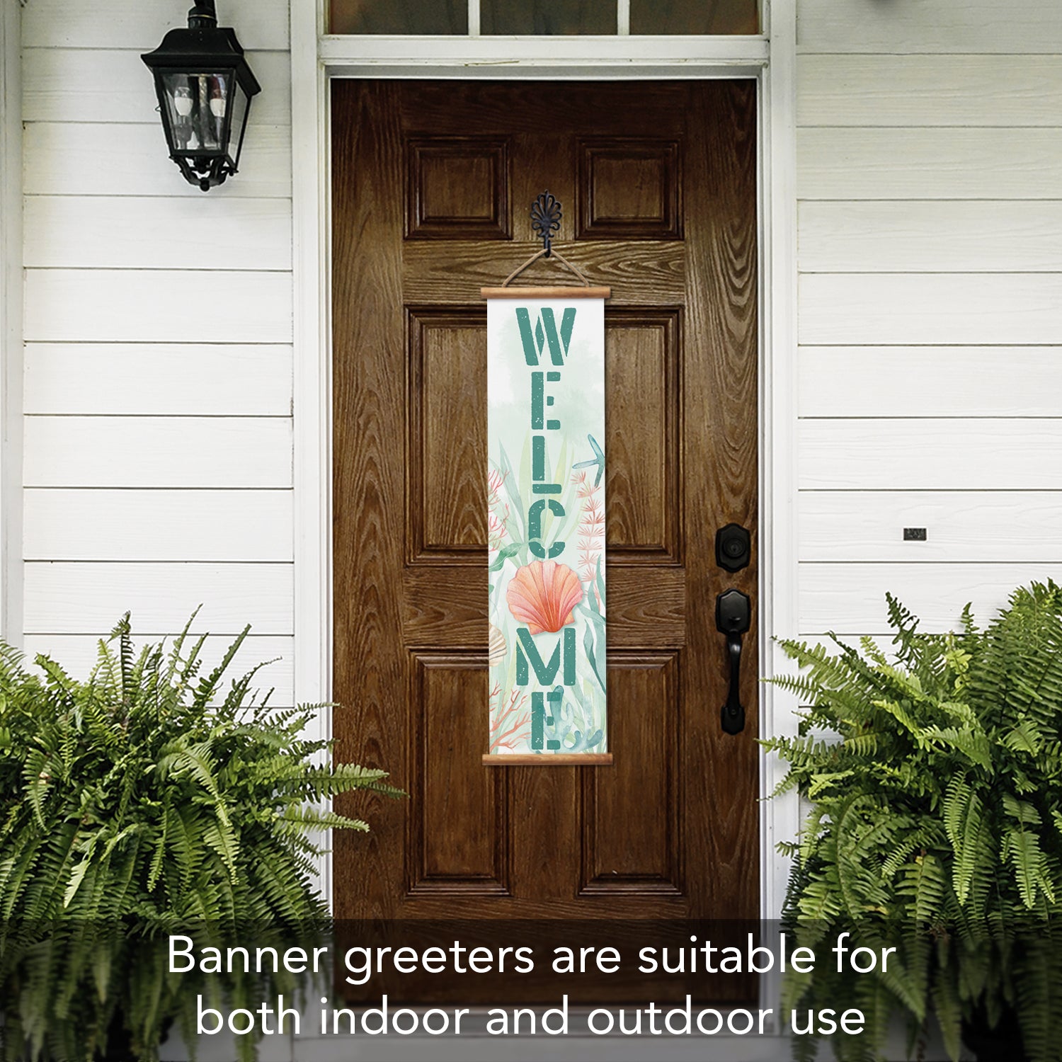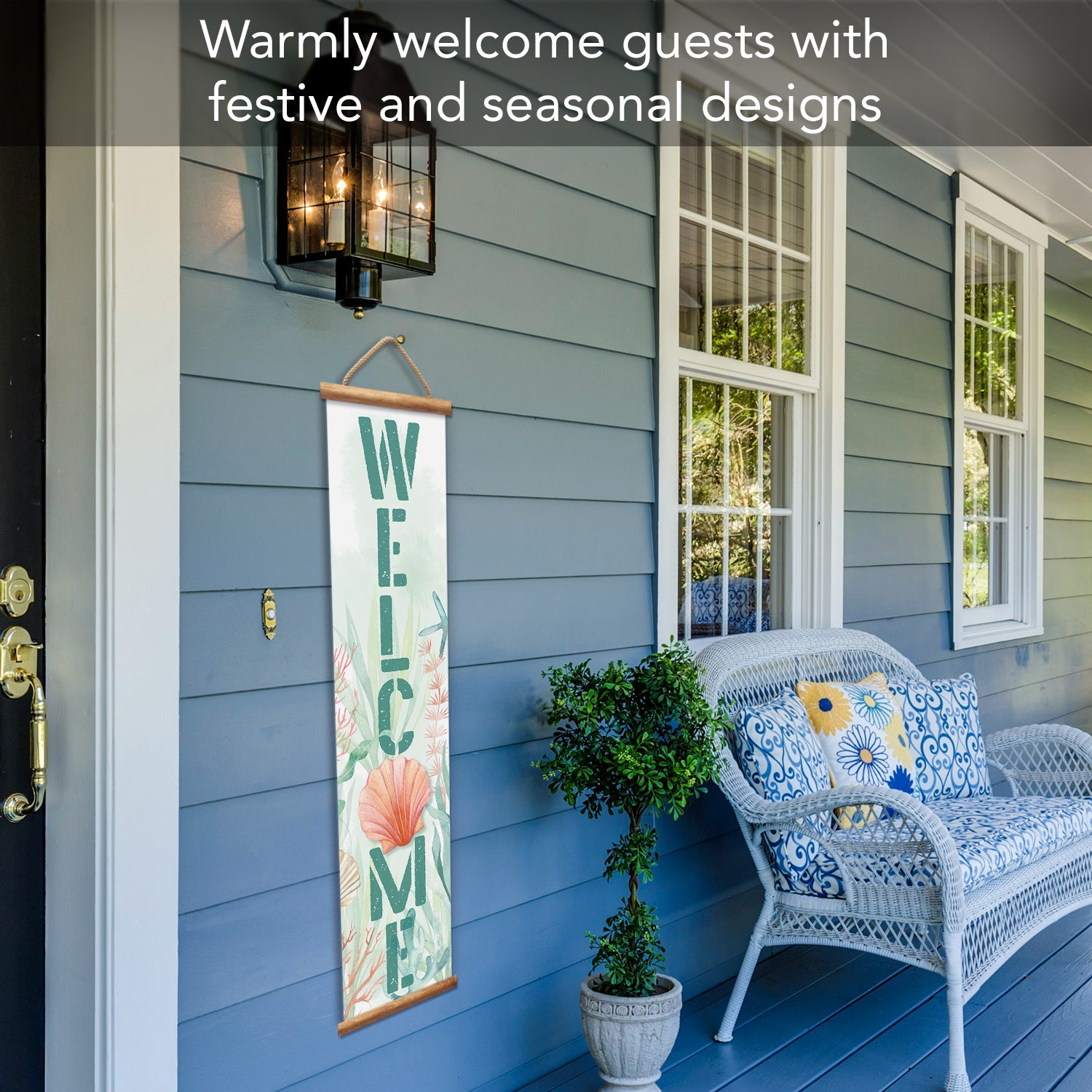 HANGING WELCOME SIGN-Decorative Indoor/Outdoor Hanging Signs are printed on white vinyl with attractive welcoming designs.