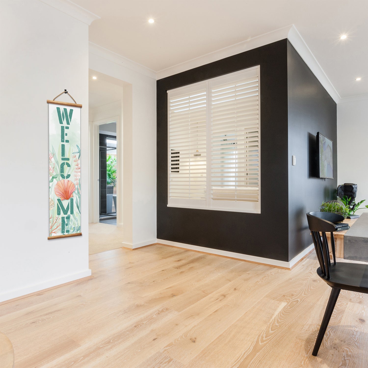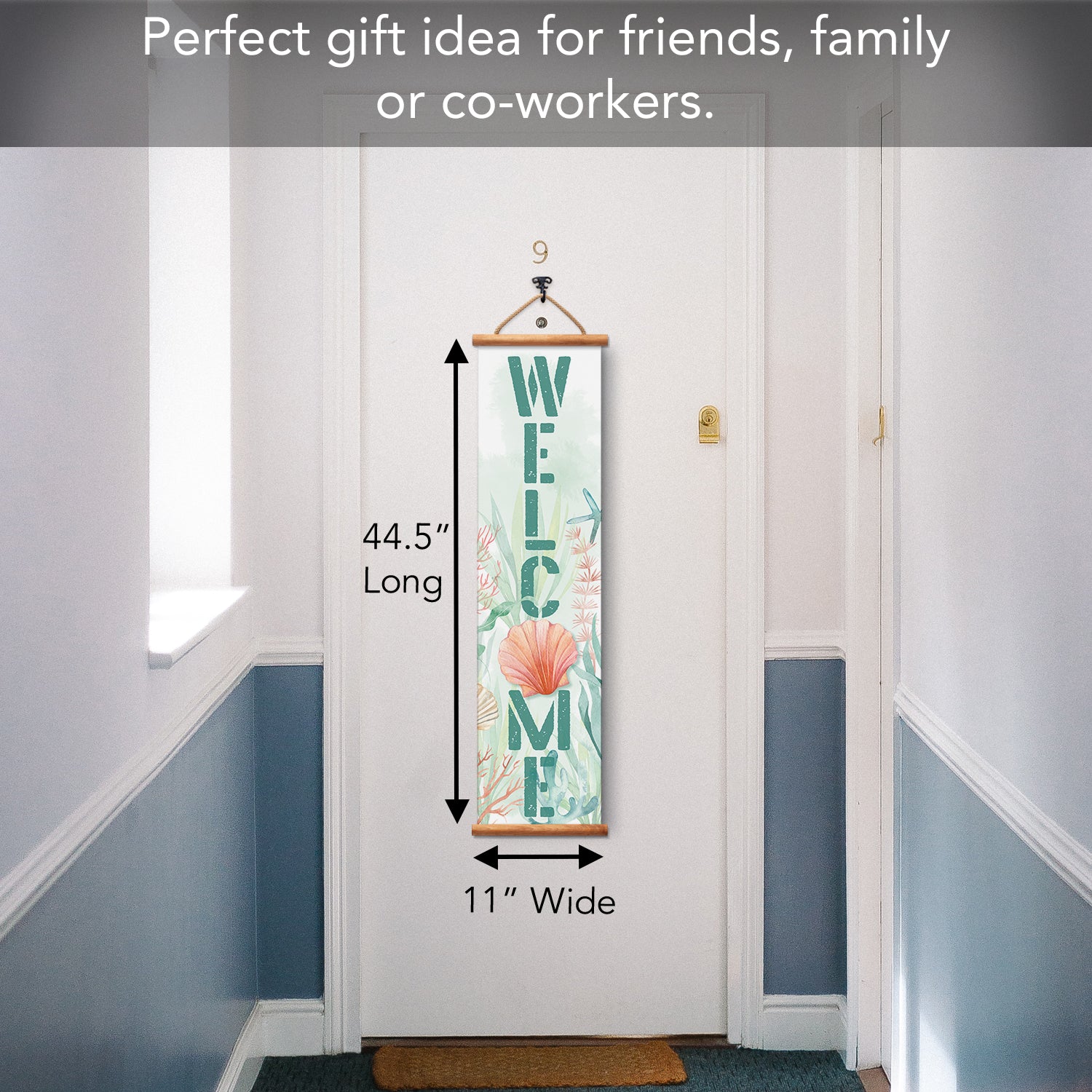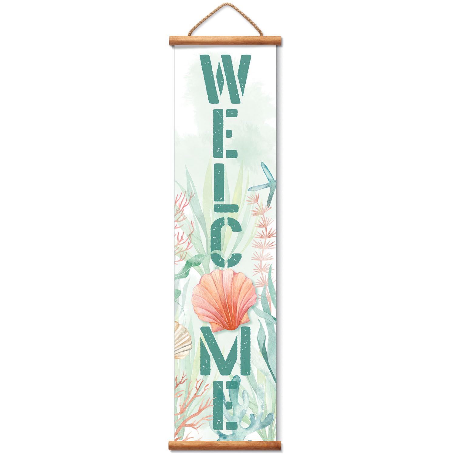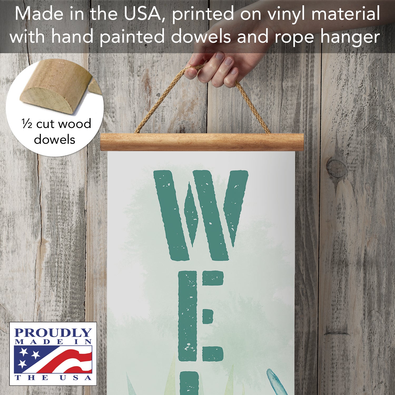 FEATURES-Each Sign features a wooden dowel at the top and bottom to stabilize it when in place. Vinyl rope hanger makes it easy to hang in that perfect spot you want to fill.