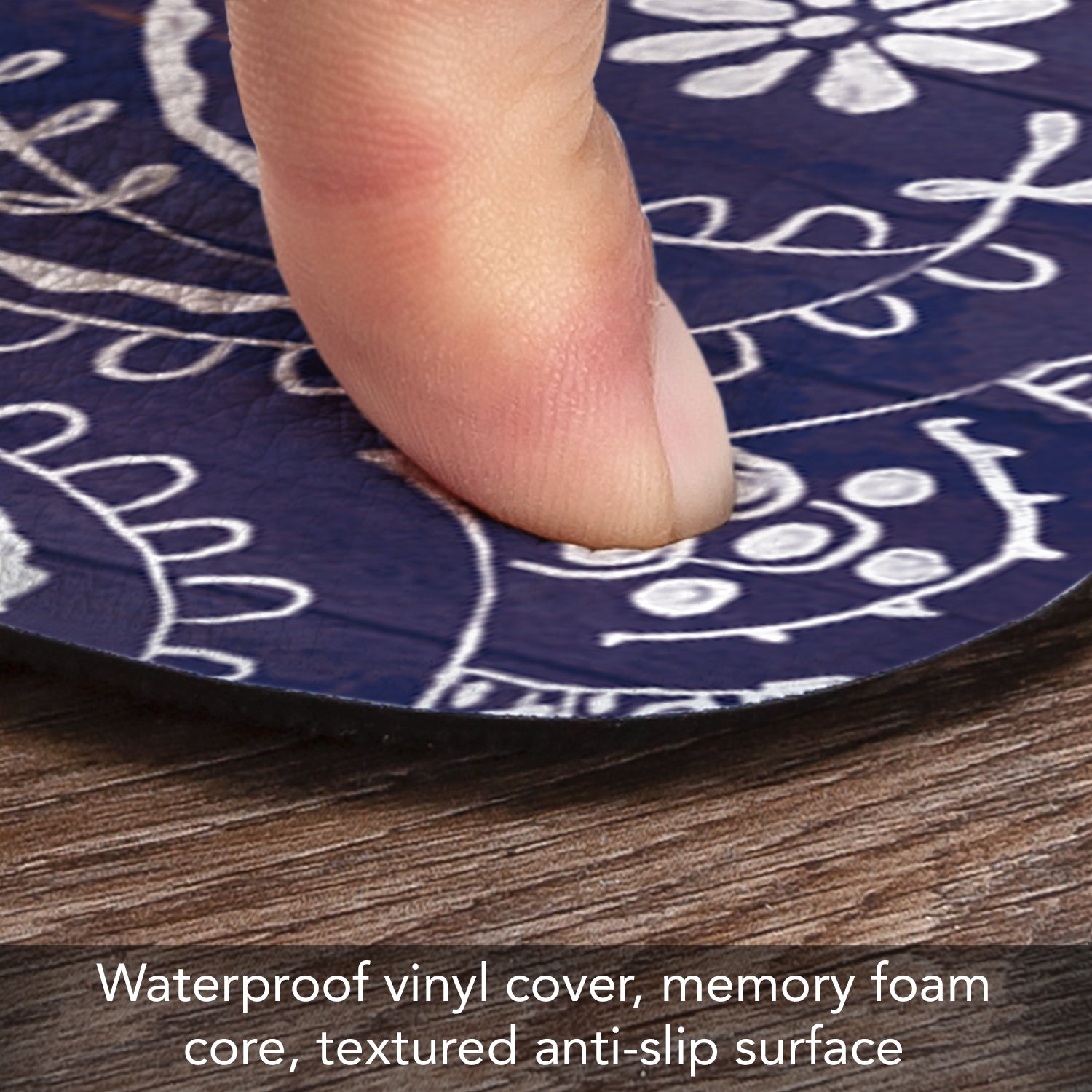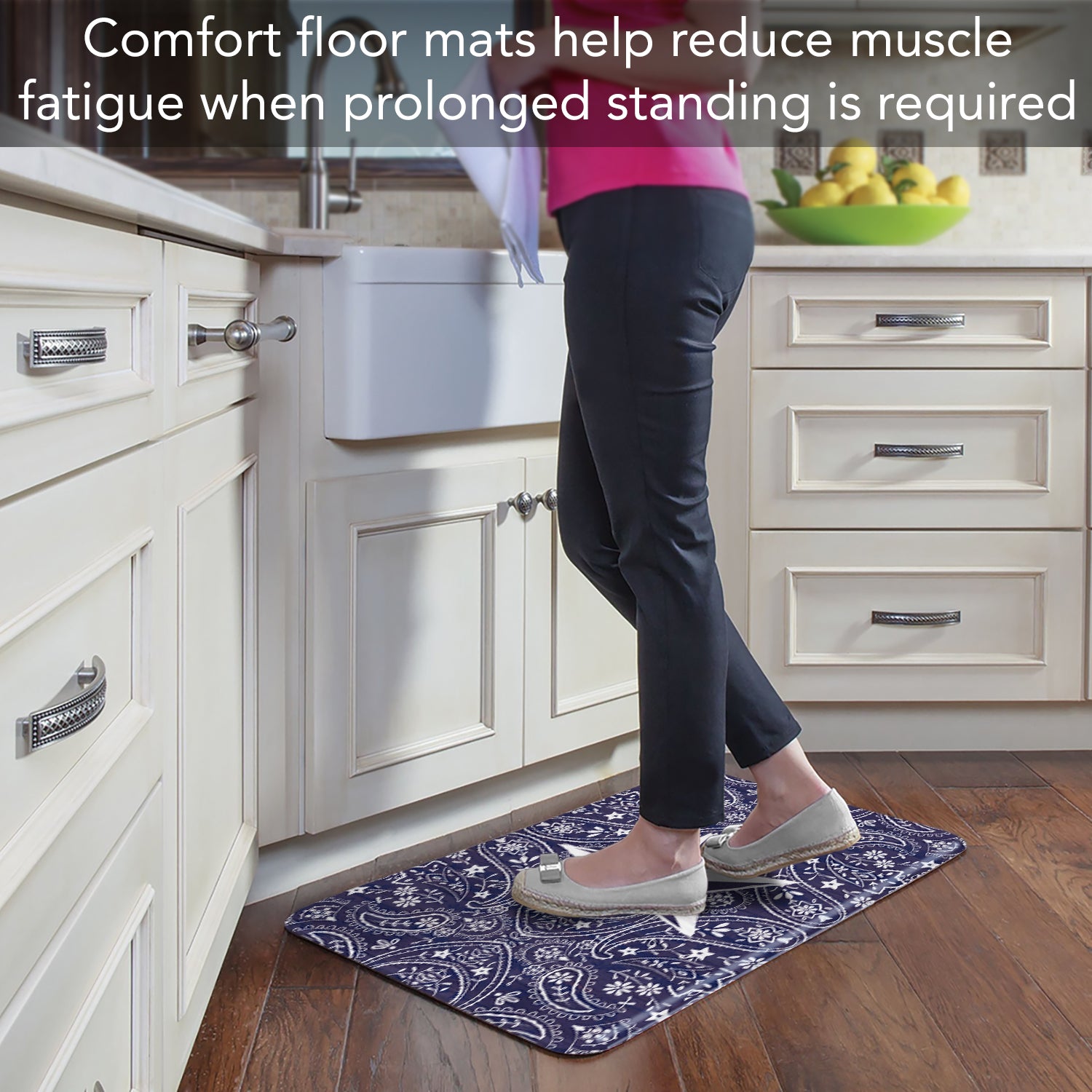 ALL FLOOR TYPES-Vinyl textured backing allows the Floor Mat to be placed on any type of floor, whether it be tile, wood, or carpet. These Comfort Mats are easy to maintain. Wipe with damp cloth or spray off lightly with garden hose and lay flat to dry.