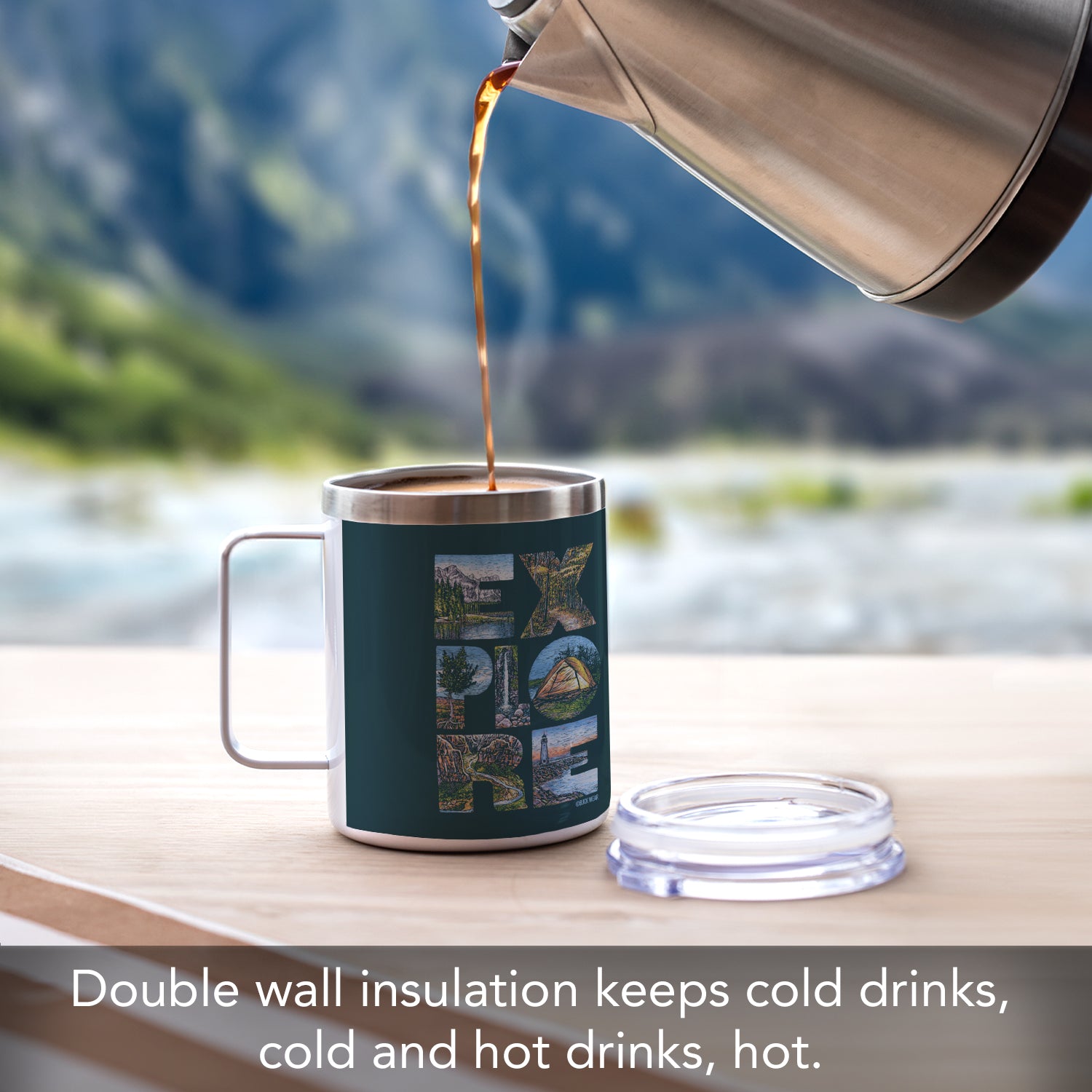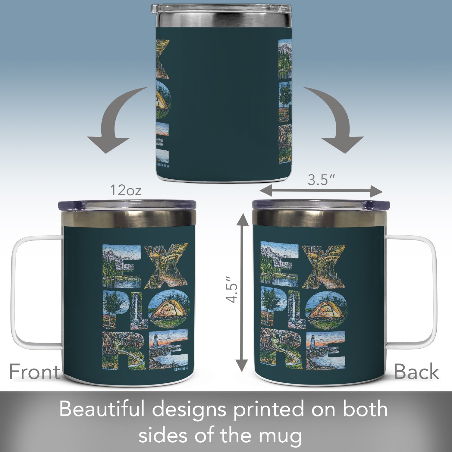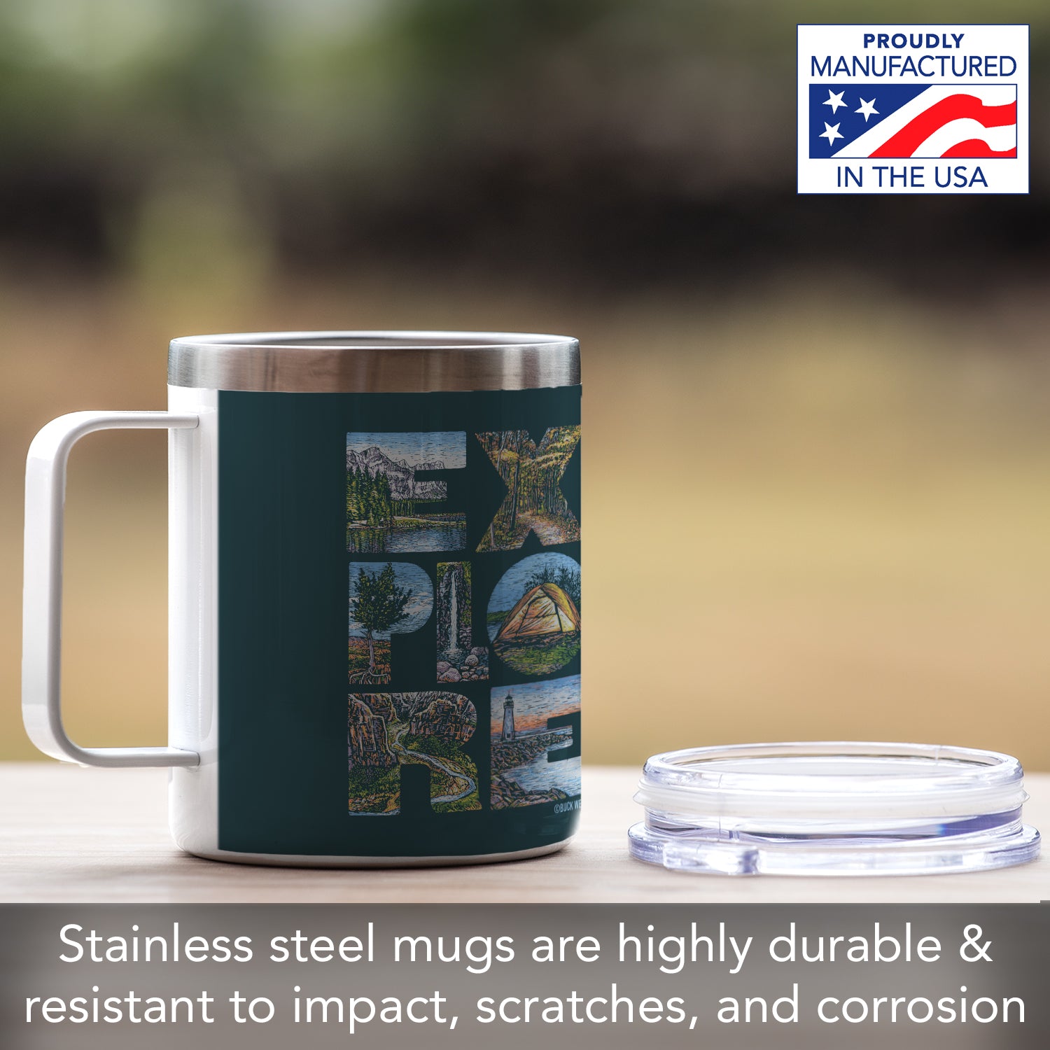 Explore Decorative Stainless Steel Insulated Travel Mug with Lid 12 oz. Manufactured in the USA