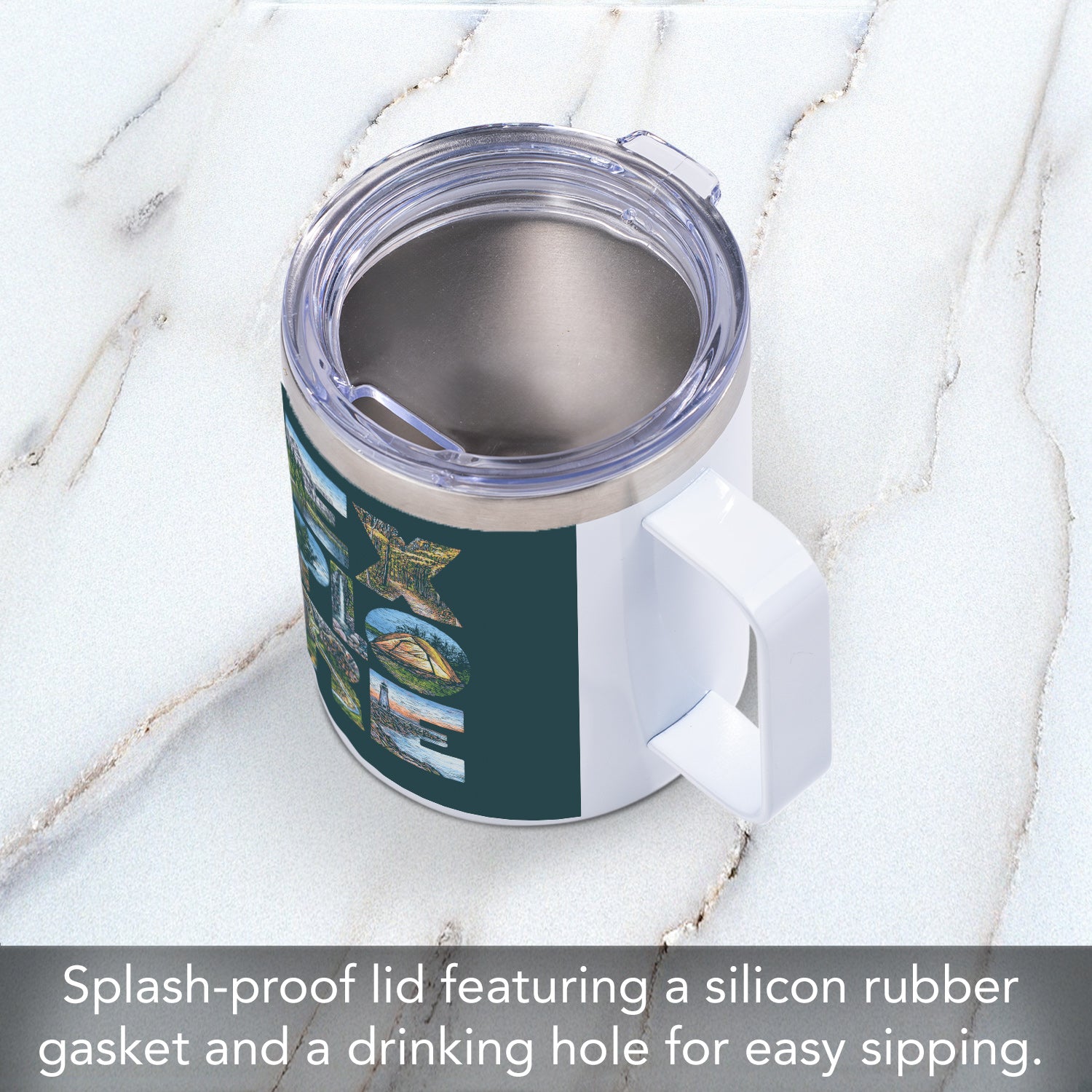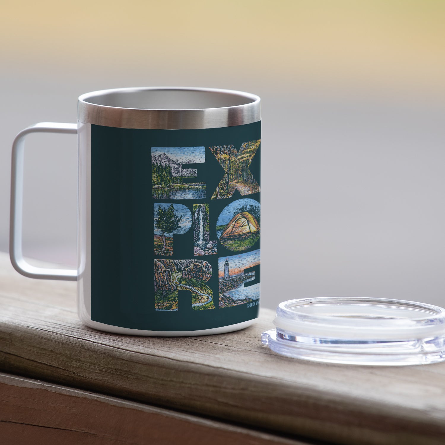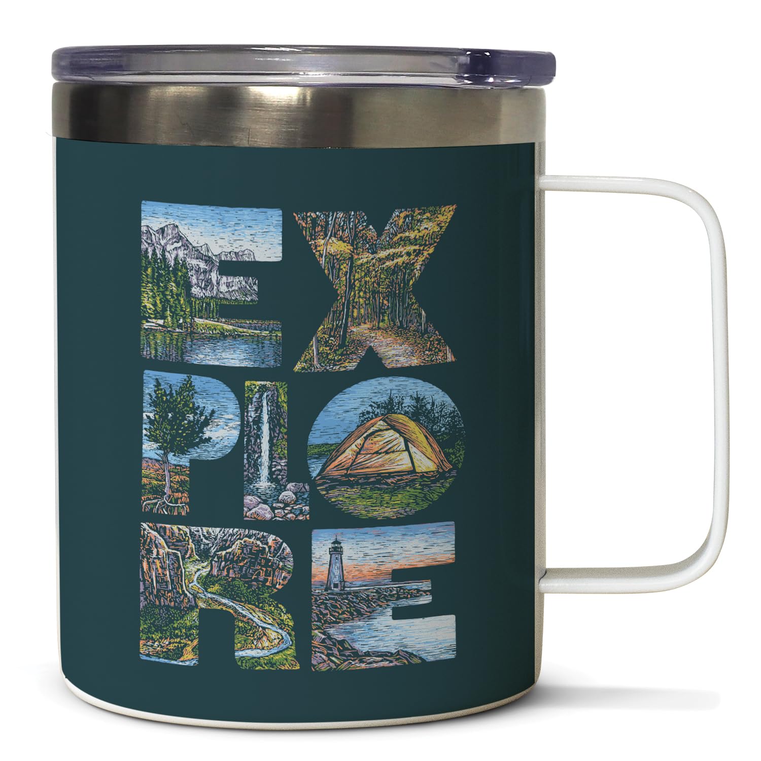Explore Decorative Stainless Steel Insulated Travel Mug with Lid 12 oz. Manufactured in the USA