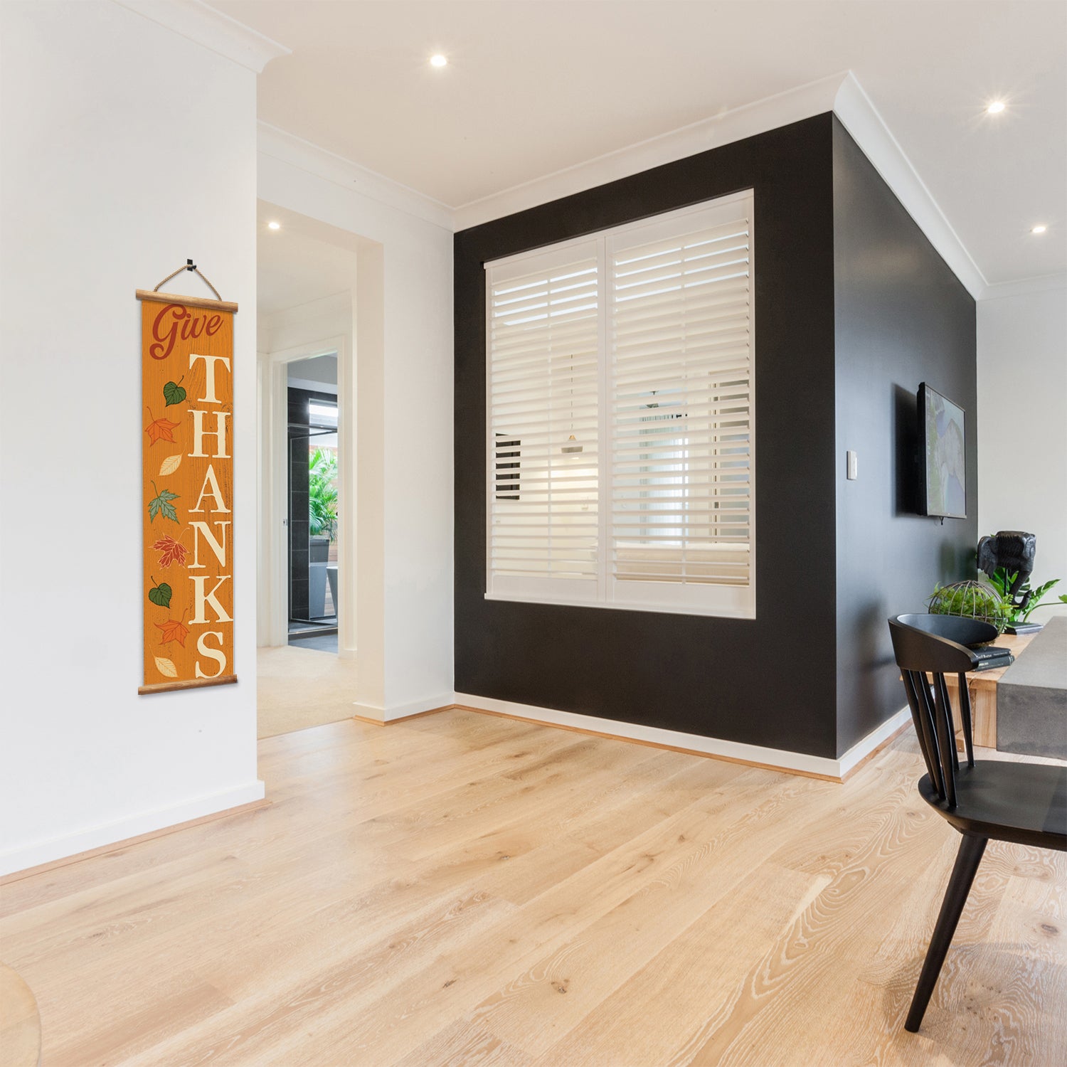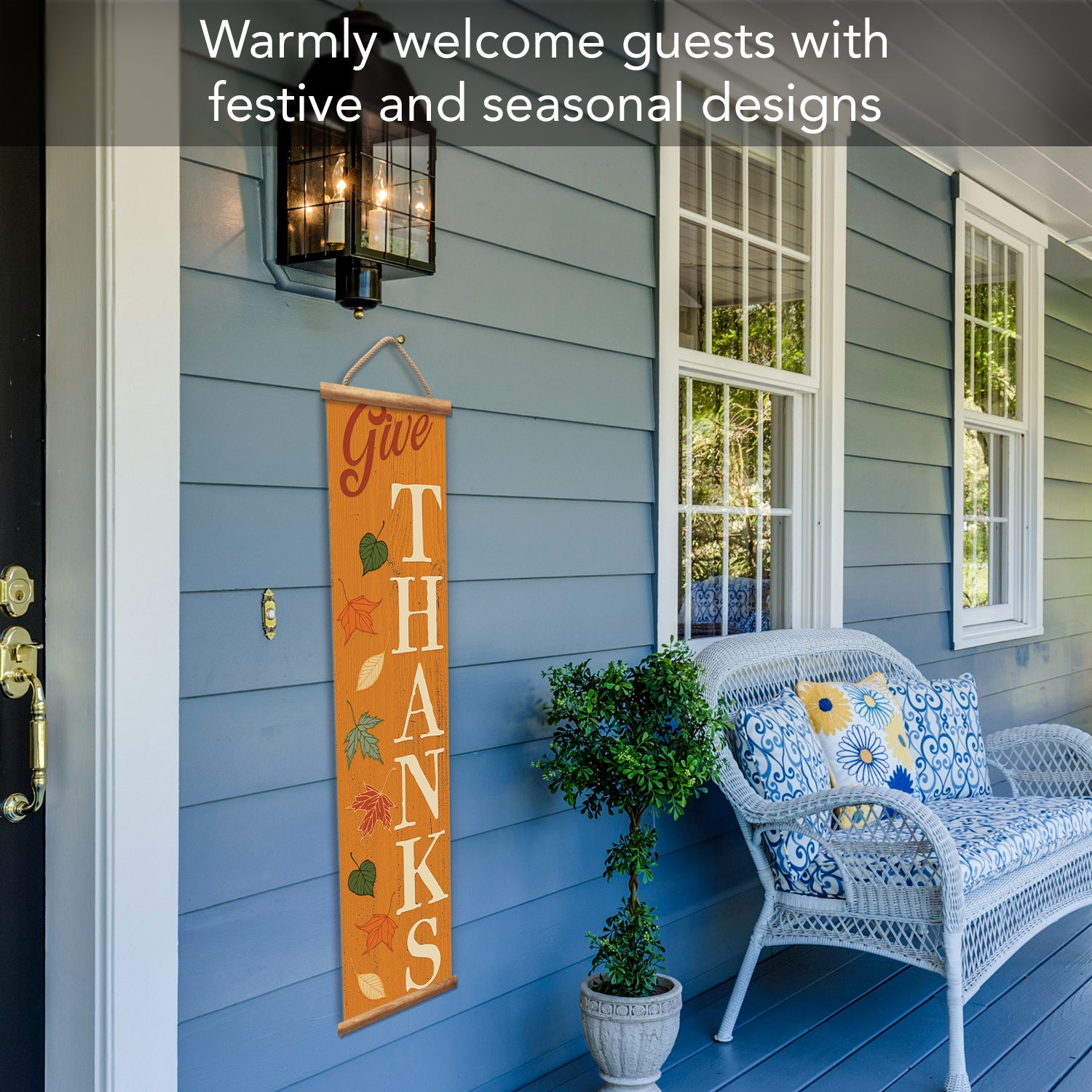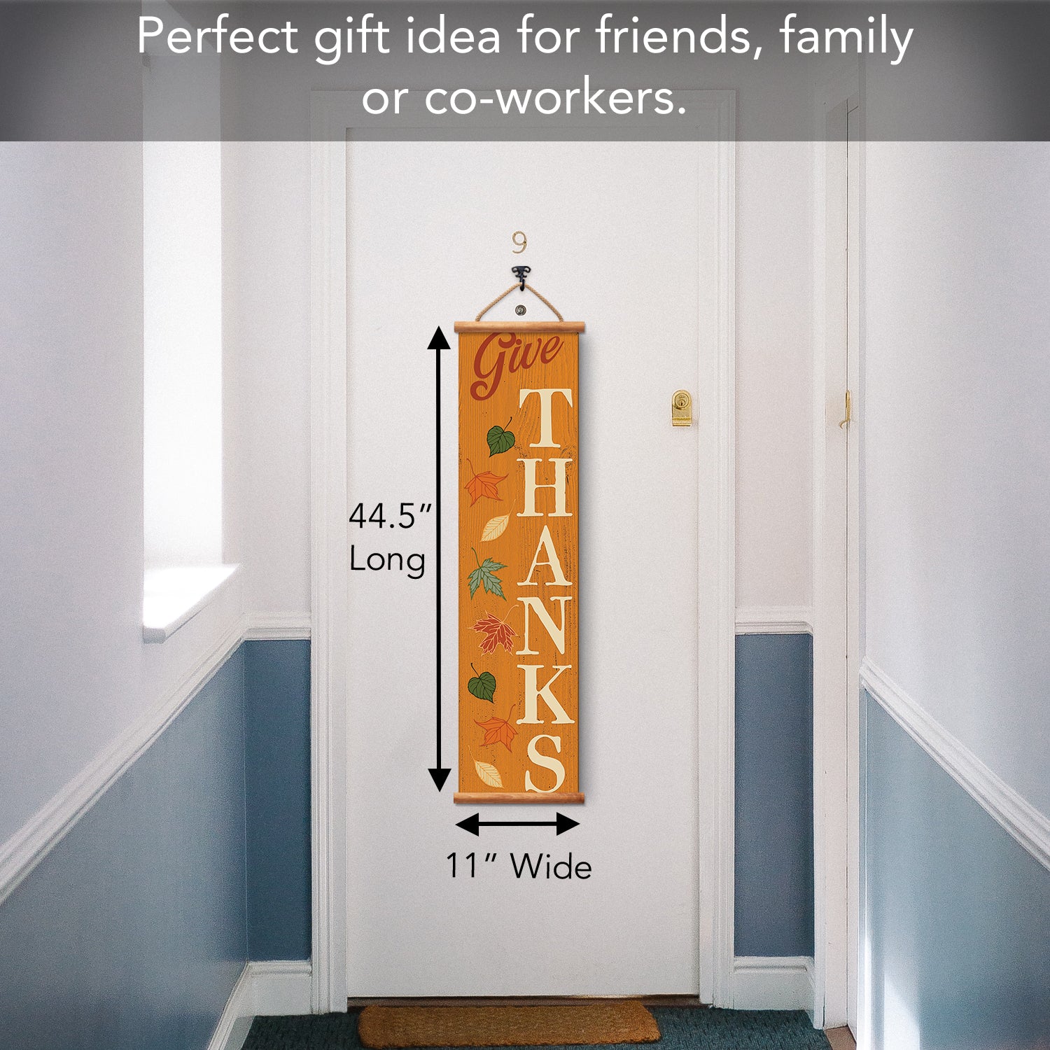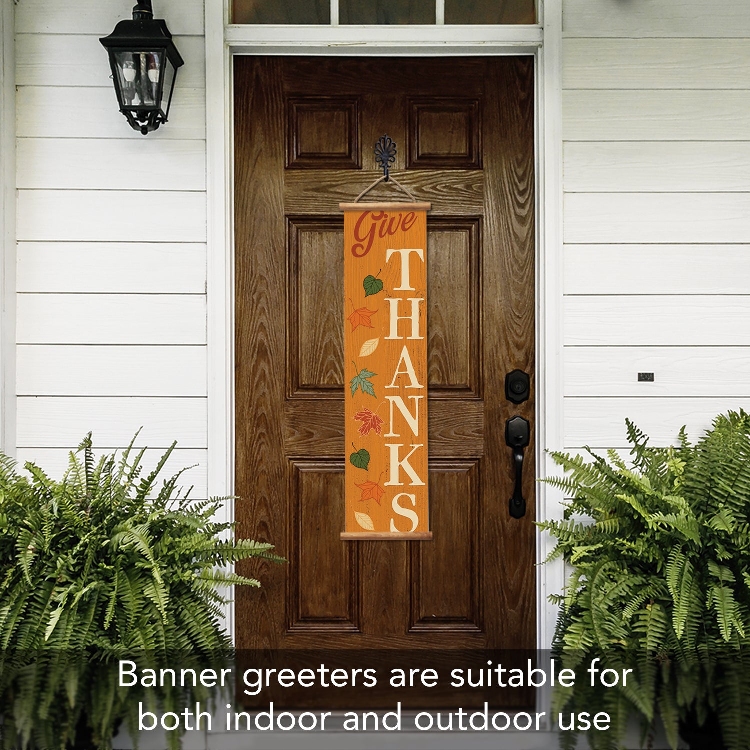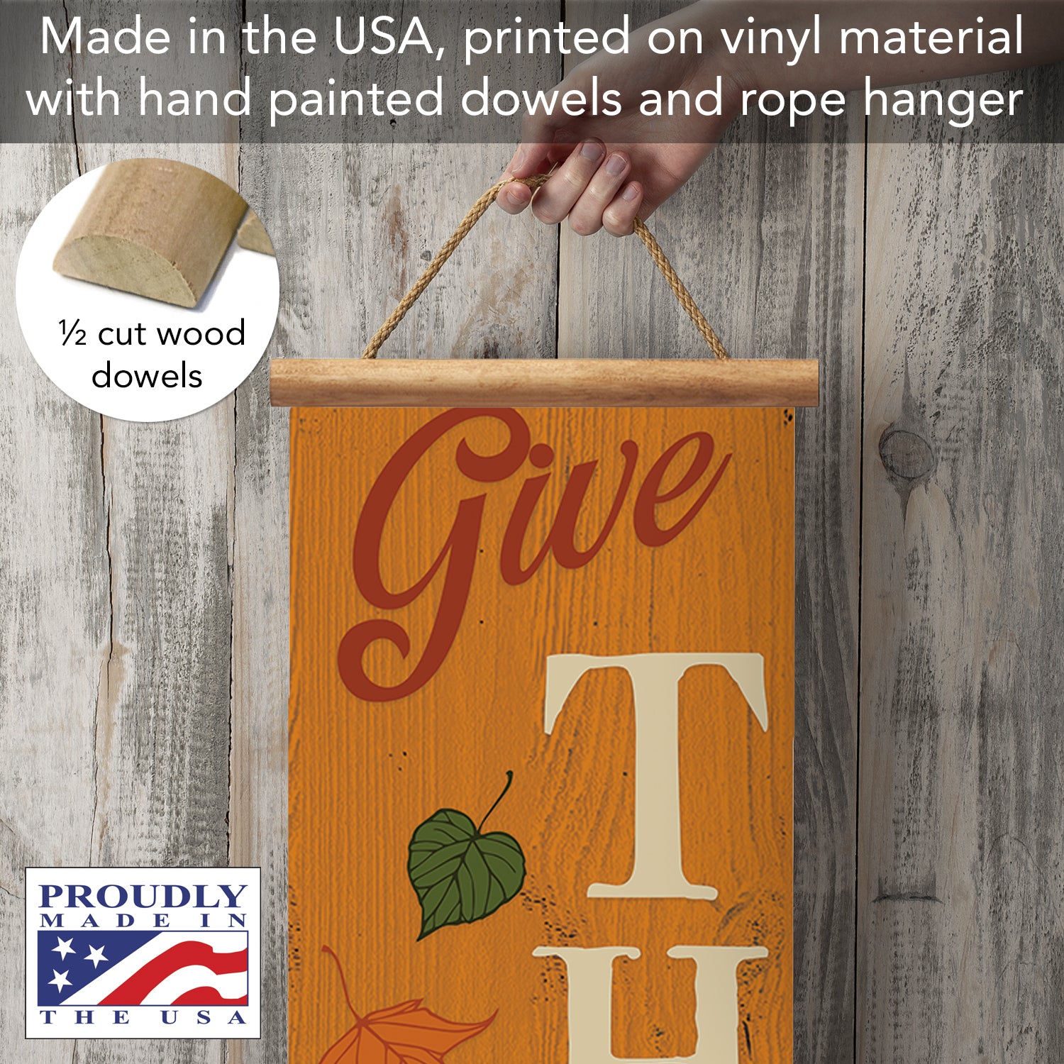 Give Thanks Indoor/Outdoor Vinyl Hanging Entryway Sign Made in the USA Wooden Dowels Stabilize Ends