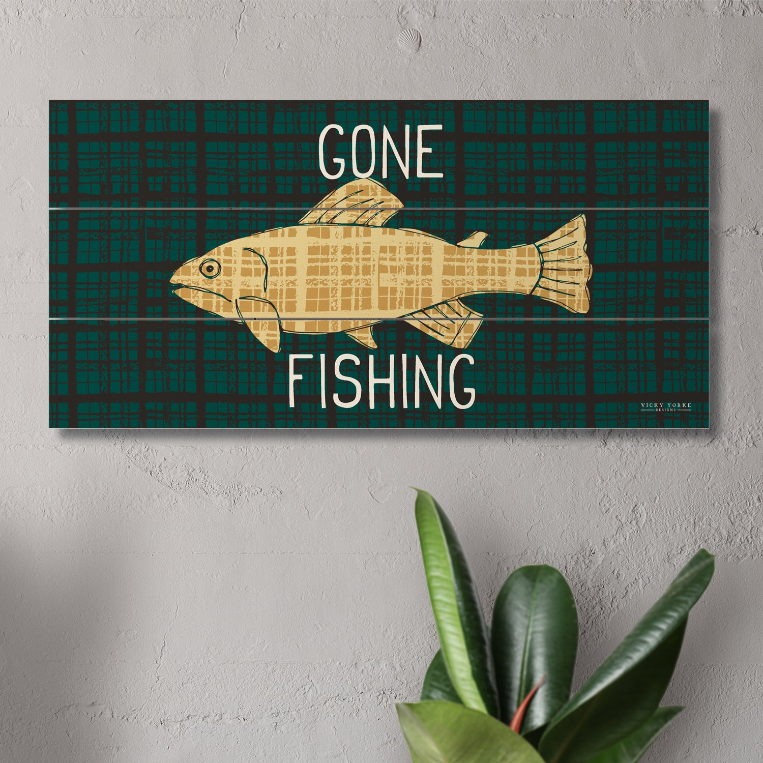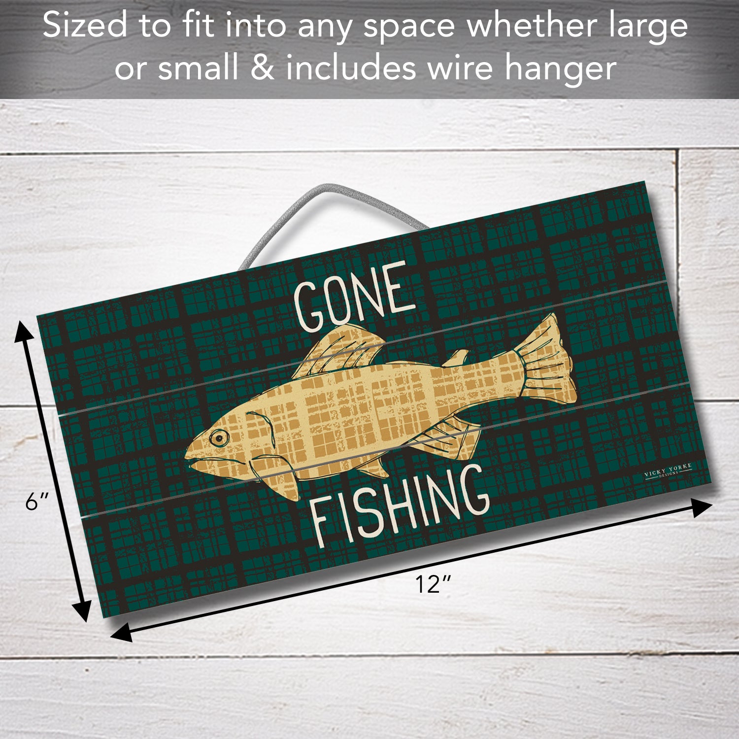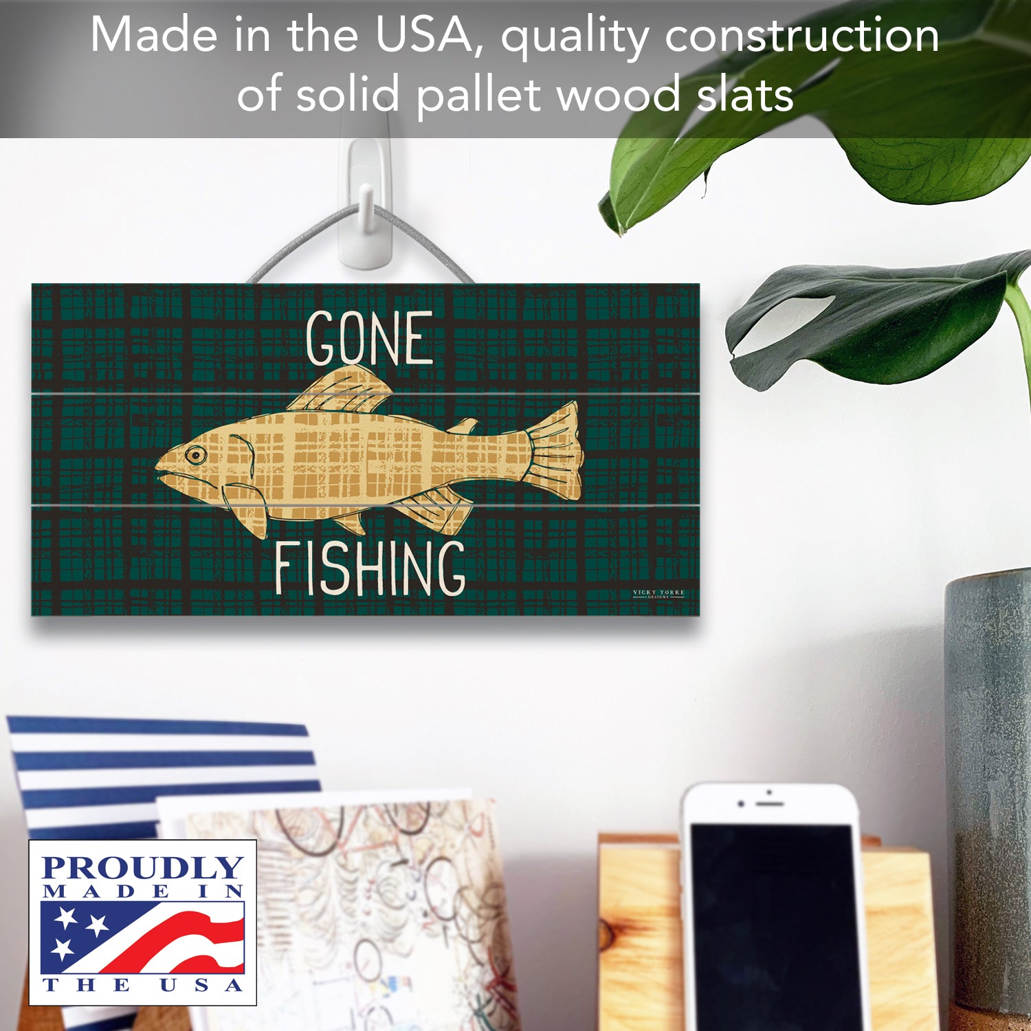 Gone Fishing Decorative Slatted Pallet Wood Sign 12" by 6" Wire Hanger Doubles as an Easel
