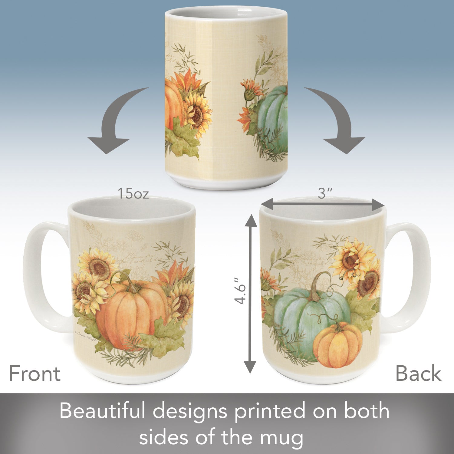 MEASUREMENTS-Mug will hold up to 15 fluid ounces. Dimensions 5” x 4.75” x 3.5”. Look for our coordinating coasters for your home or office.