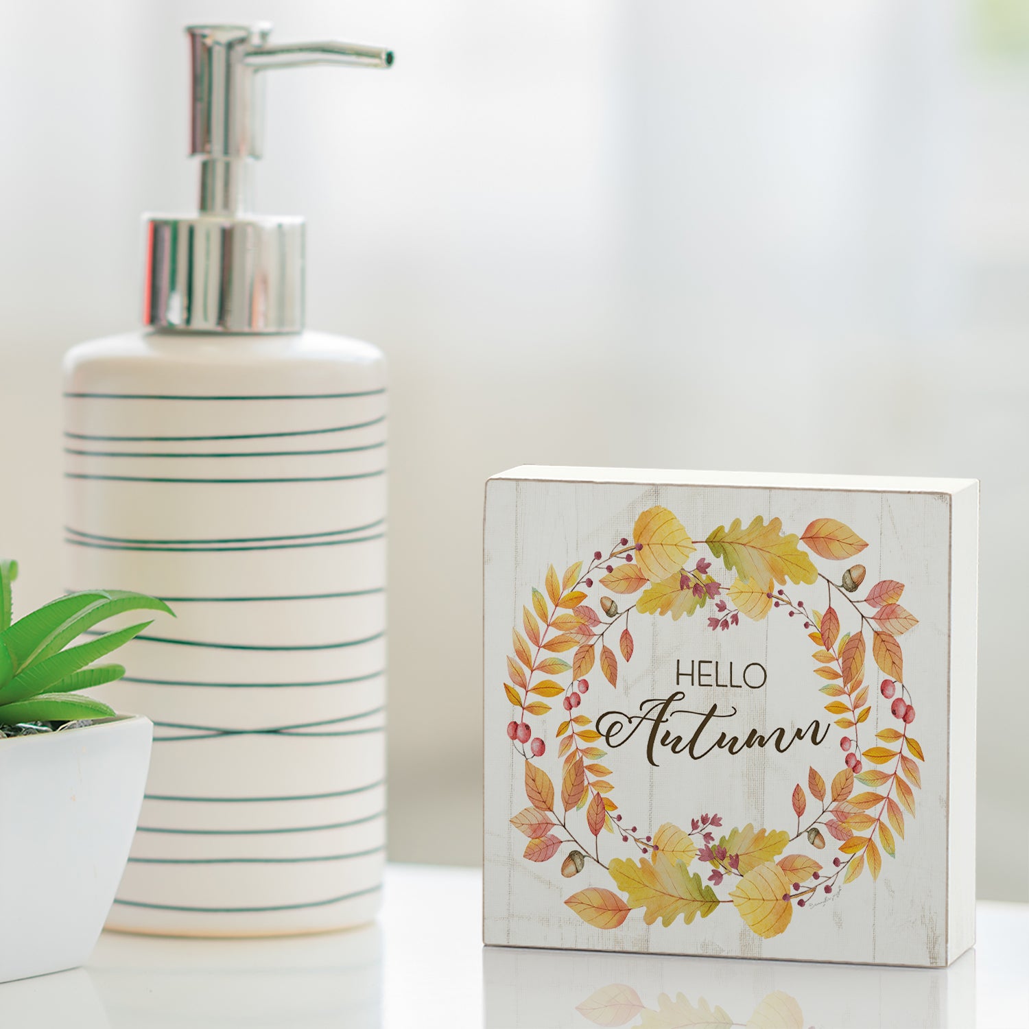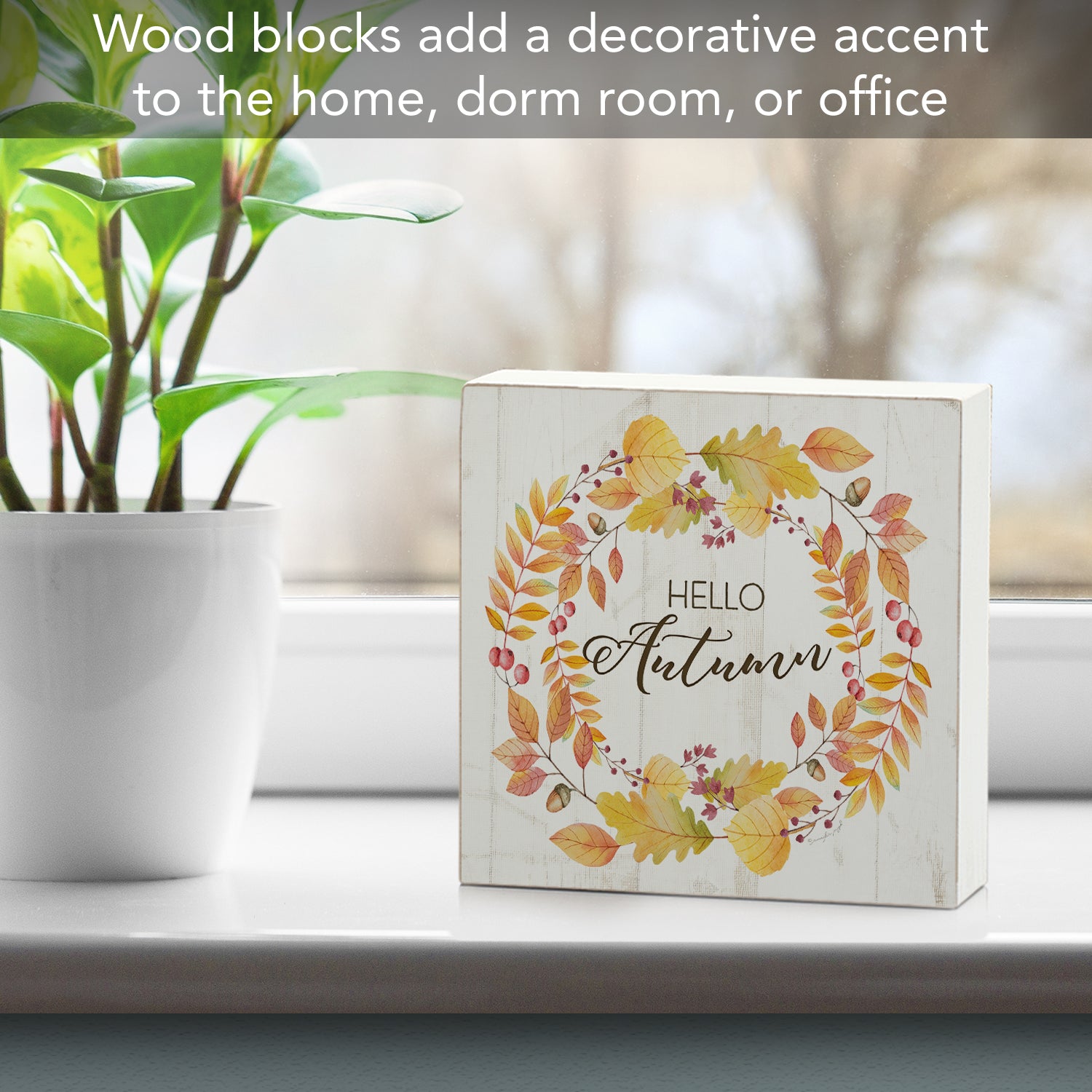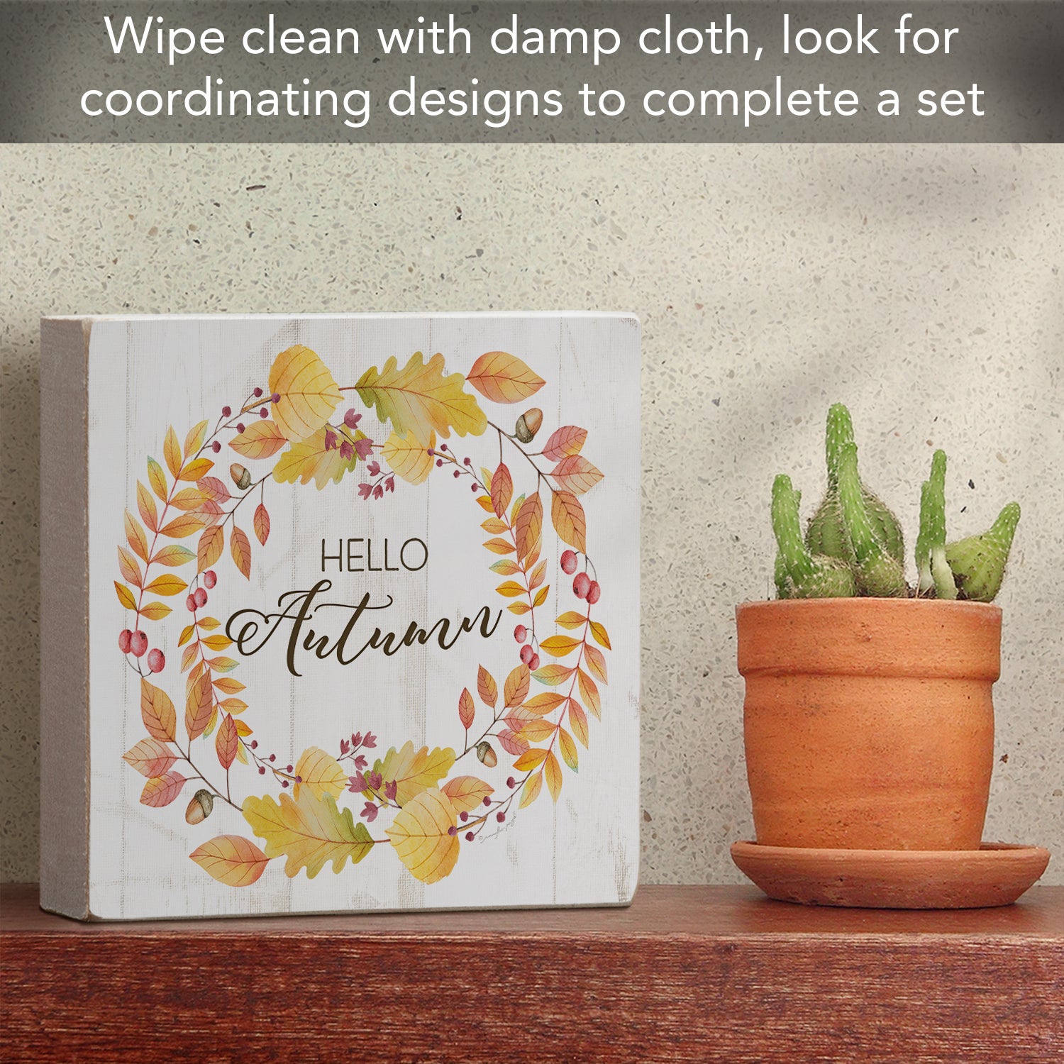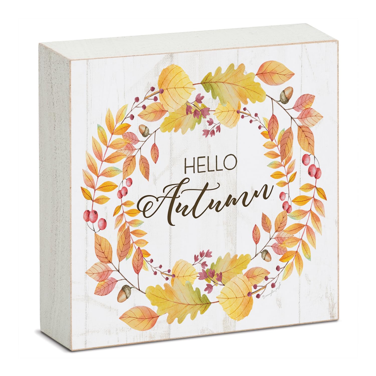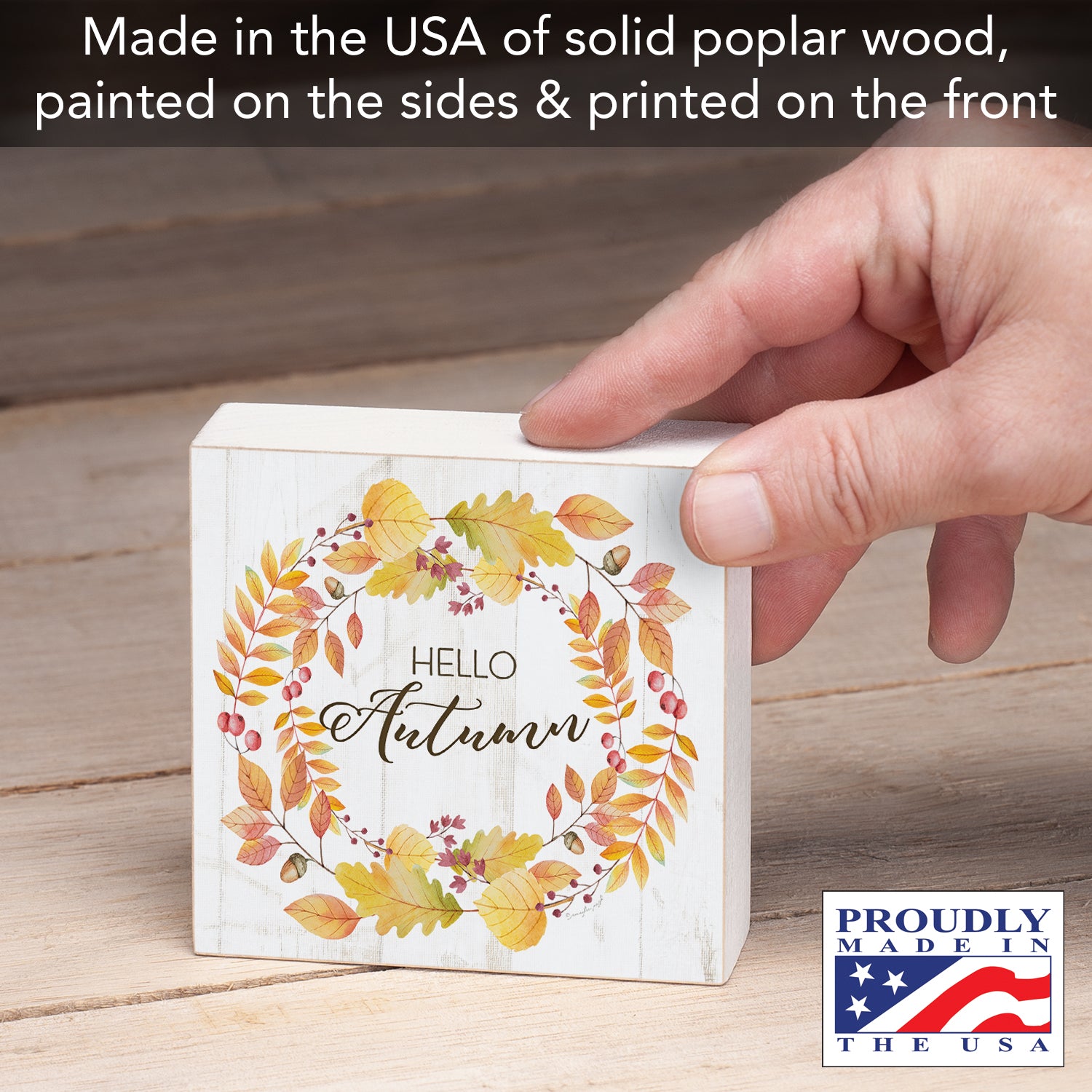 Hello Autumn Artistic Freestanding Solid Wood Block Sign Made in the USA 3.75” Square