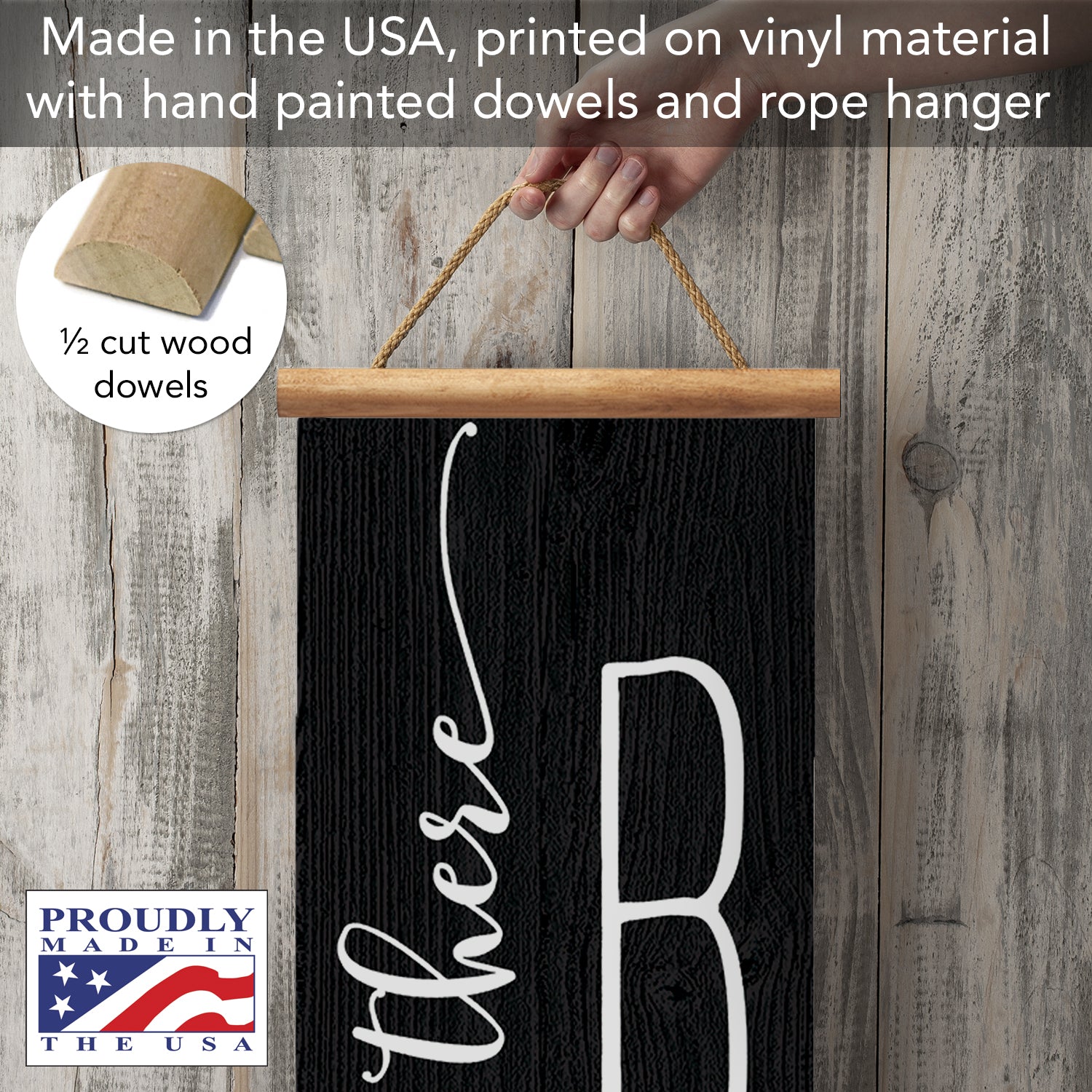 FEATURES-Each Sign features a wooden dowel at the top and bottom to stabilize it when in place. Vinyl rope hanger makes it easy to hang in that perfect spot you want to fill.