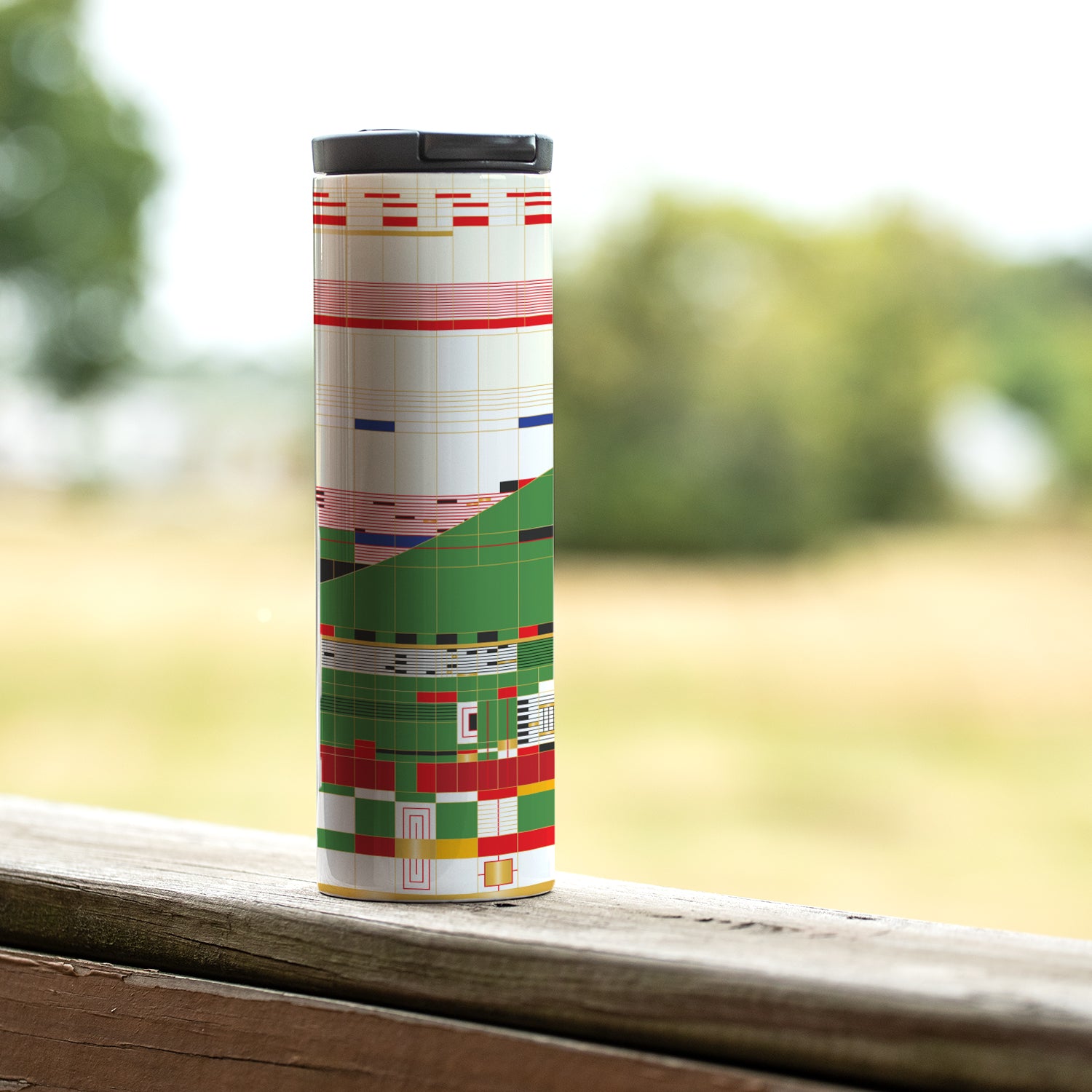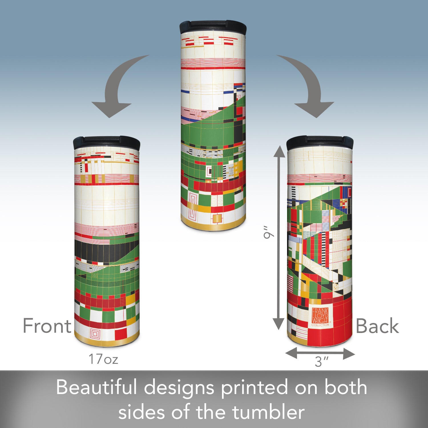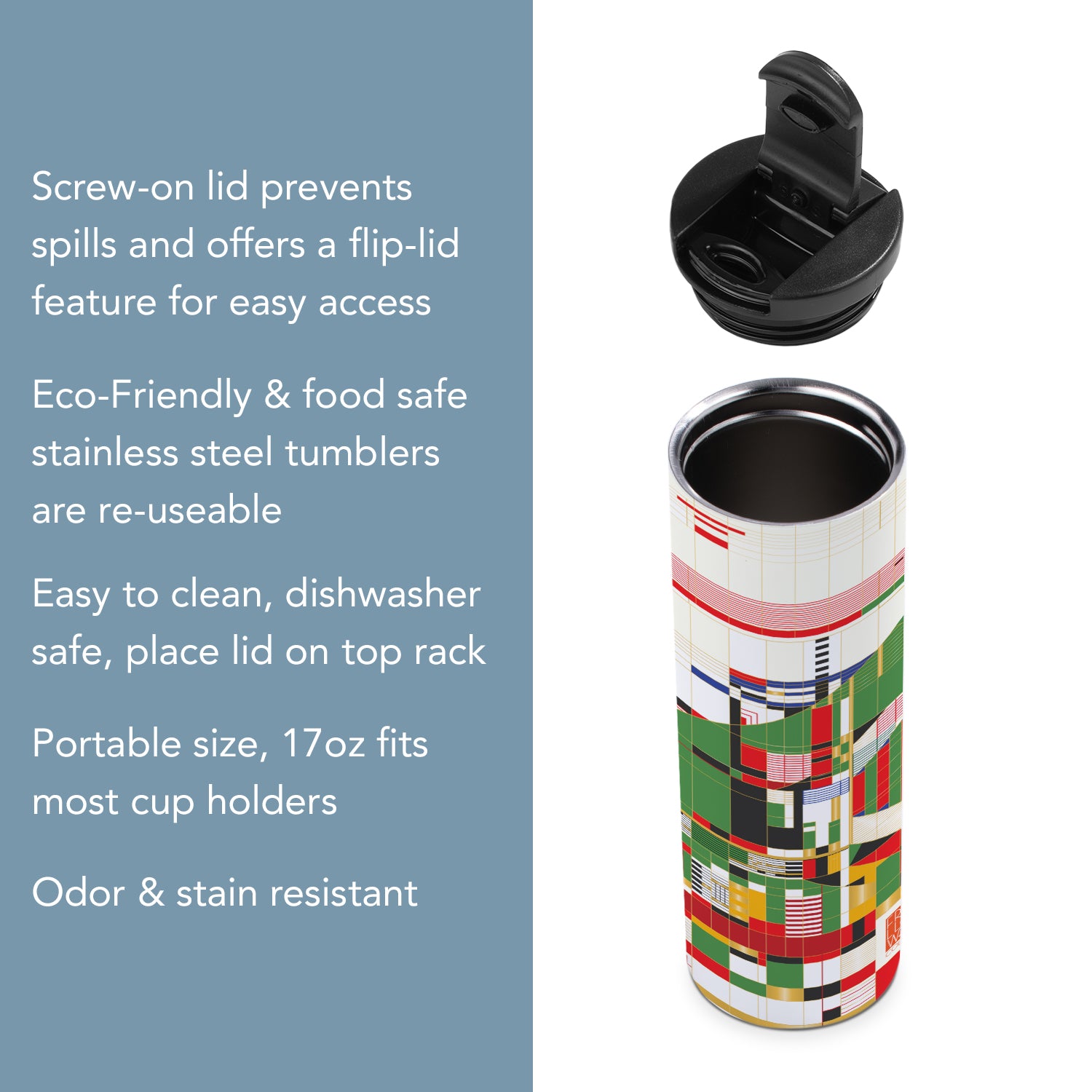 Frank Lloyd Wright's Hillside Curtain Design on 17 Ounce Insulated Stainless Steel Tumbler Manufactured in the USA