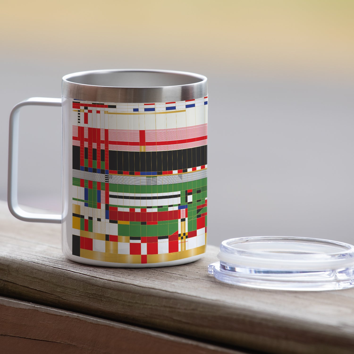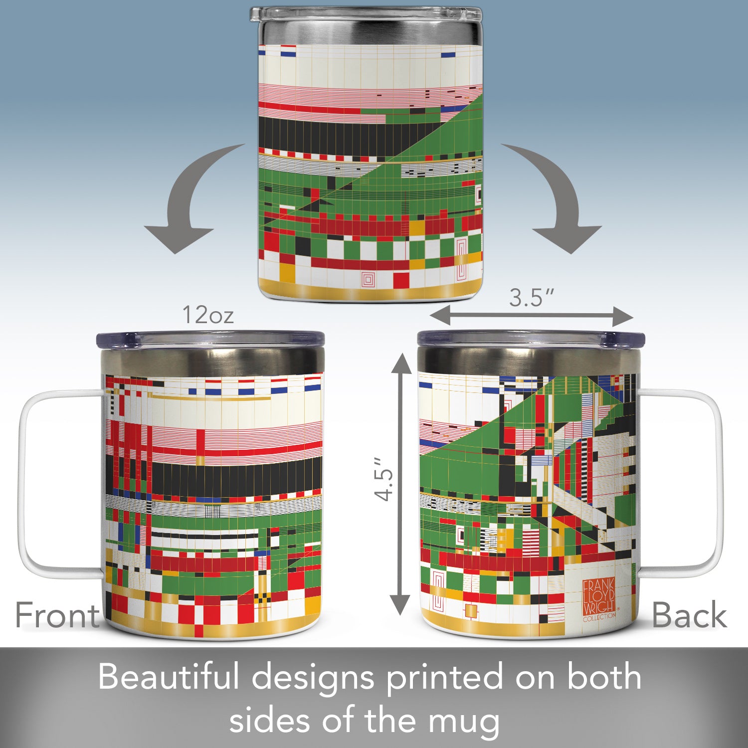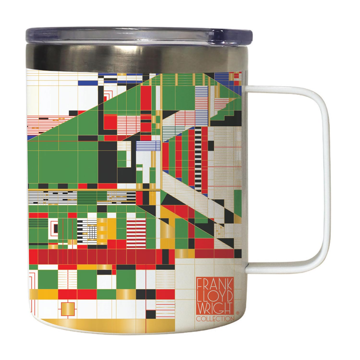 Frank Lloyd Wright's Hillside Curtain Design on Stainless Steel Mug with Lid 12 oz. Manufactured in the USA