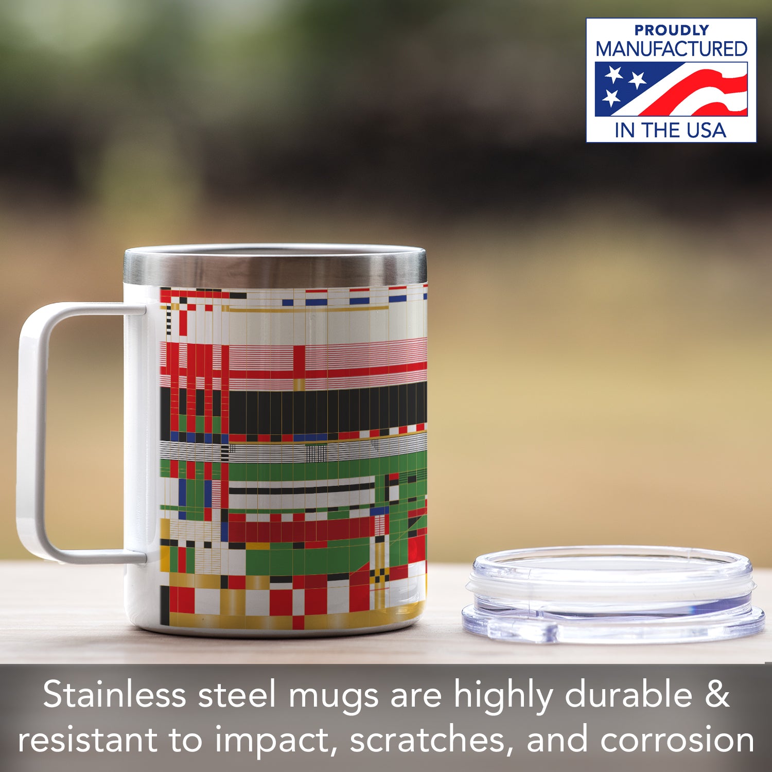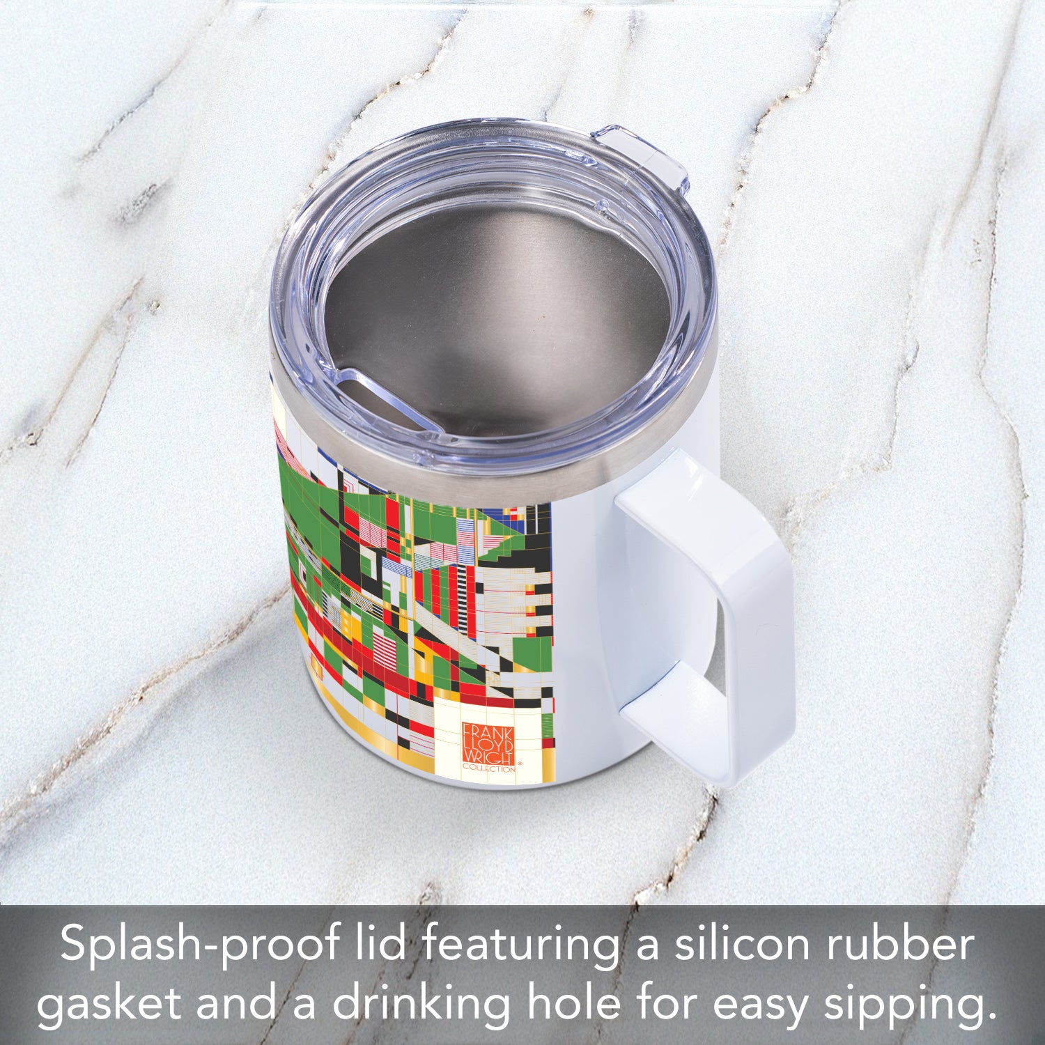 FEATURES-Mug features a full-size handle for a comfortable and safe grip. Includes lid that secures with a rubber ring. Non-porous surface prevents staining. Mug is dishwasher safe.
