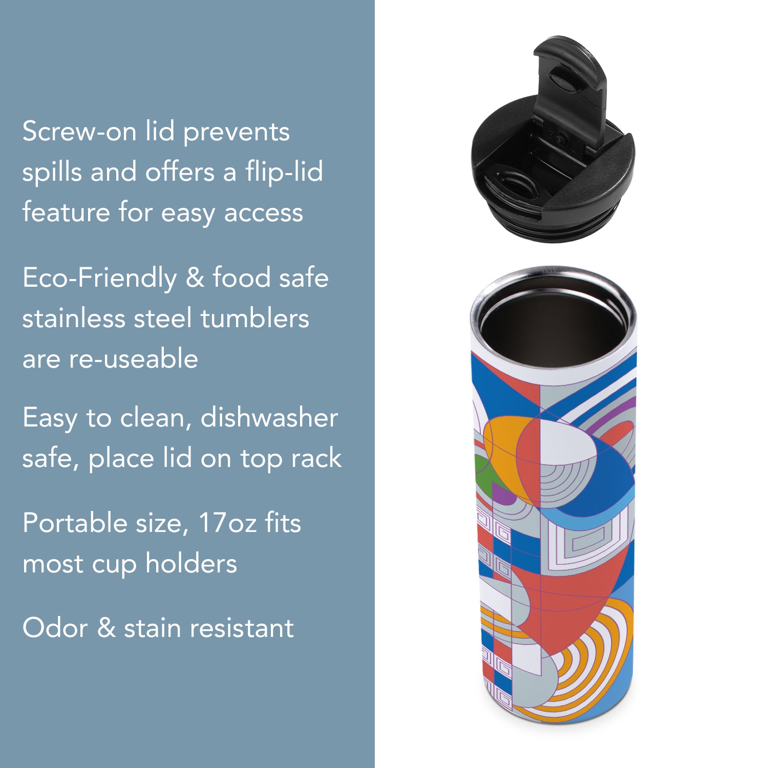 CAPACITY-Tumbler will hold up to 17 ounces. Will fit into most car cup holders for easy transport.