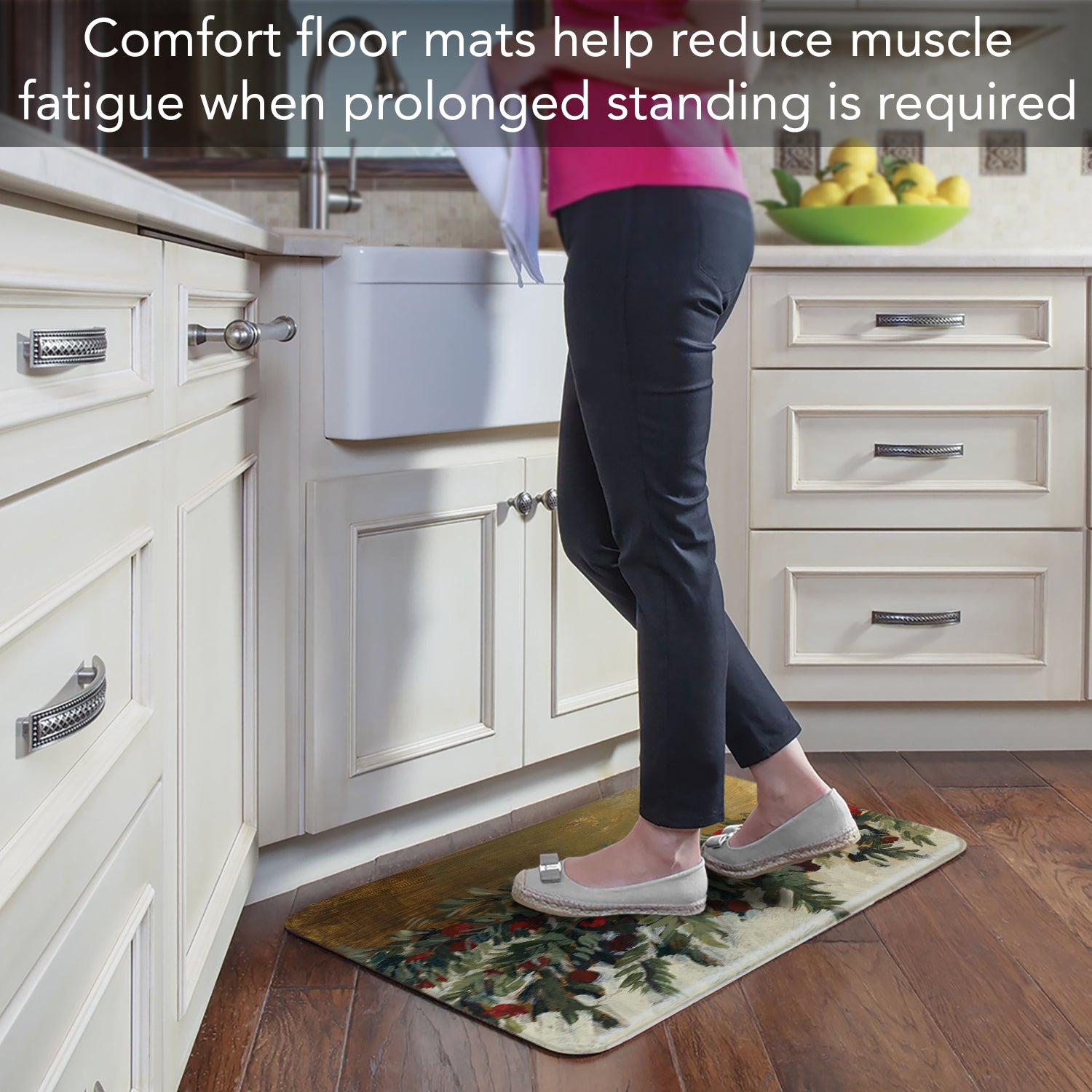 ALL FLOOR TYPES-Vinyl textured backing allows the Floor Mat to be placed on any type of floor, whether it be tile, wood, or carpet. These Comfort Mats are easy to maintain. Wipe with damp cloth or spray off lightly with garden hose and lay flat to dry.