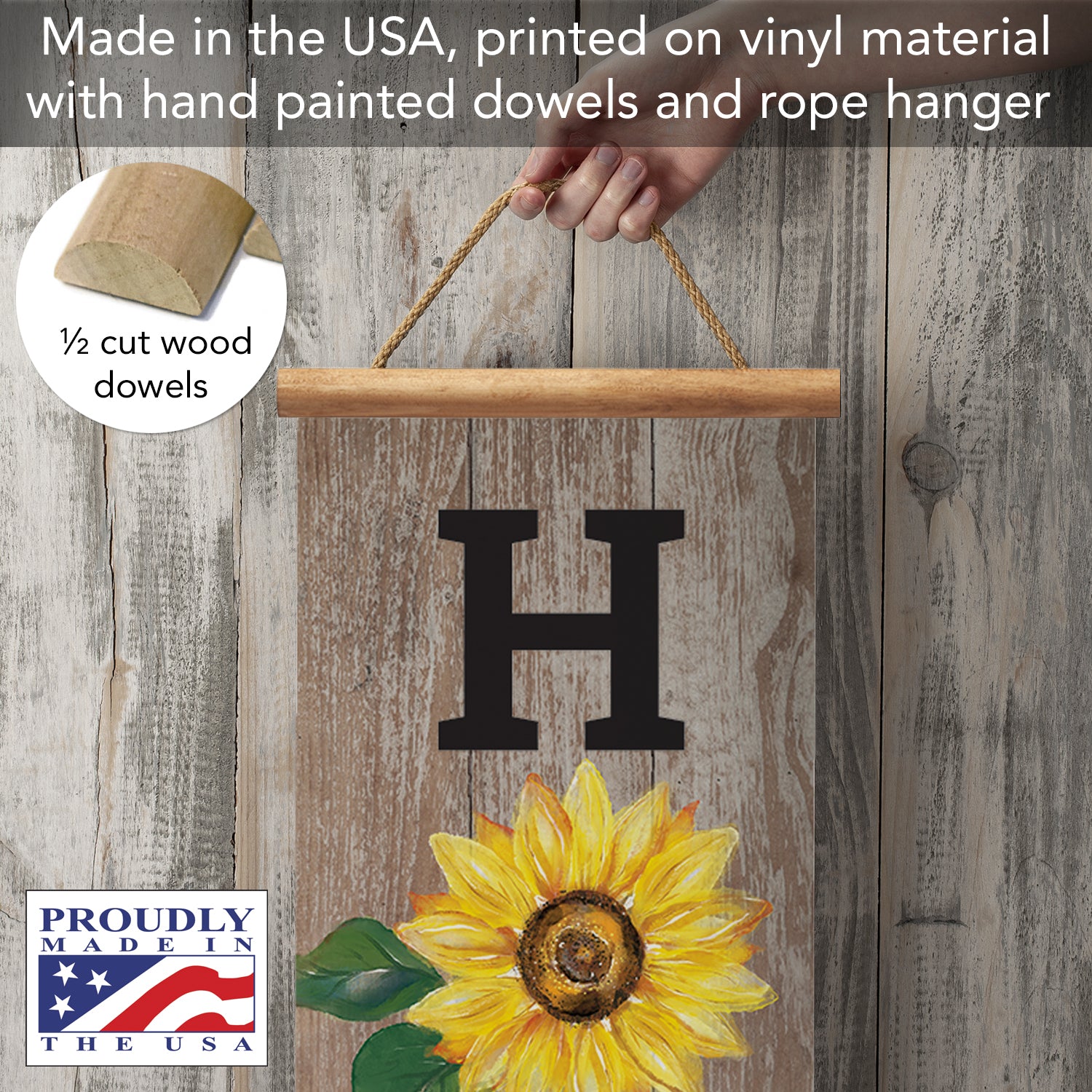 FEATURES-Each Sign features a wooden dowel at the top and bottom to stabilize it when in place. Vinyl rope hanger makes it easy to hang in that perfect spot you want to fill.