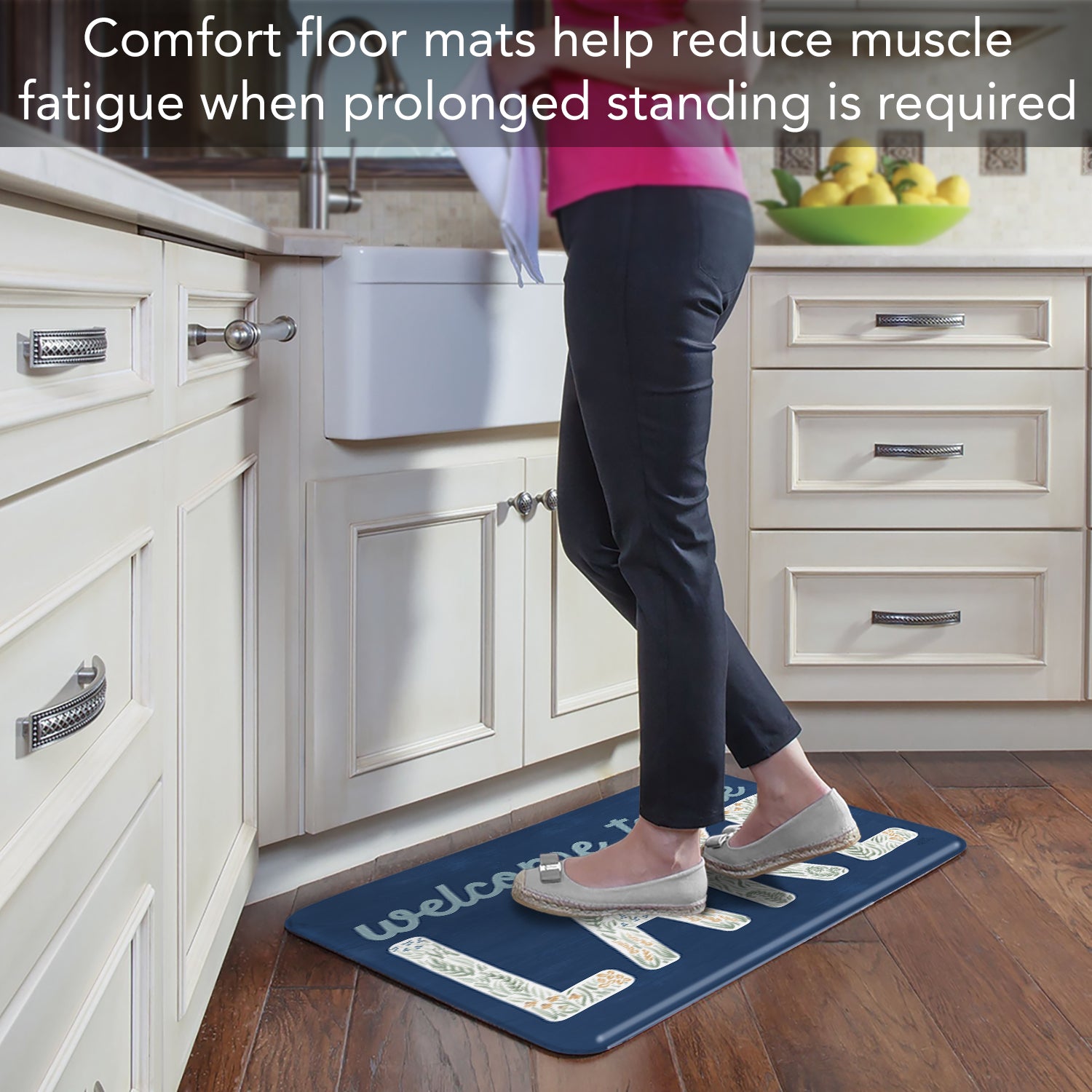 ALL FLOOR TYPES-Vinyl textured backing allows the Floor Mat to be placed on any type of floor, whether it be tile, wood, or carpet. These Comfort Mats are easy to maintain. Wipe with damp cloth or spray off lightly with garden hose and lay flat to dry.