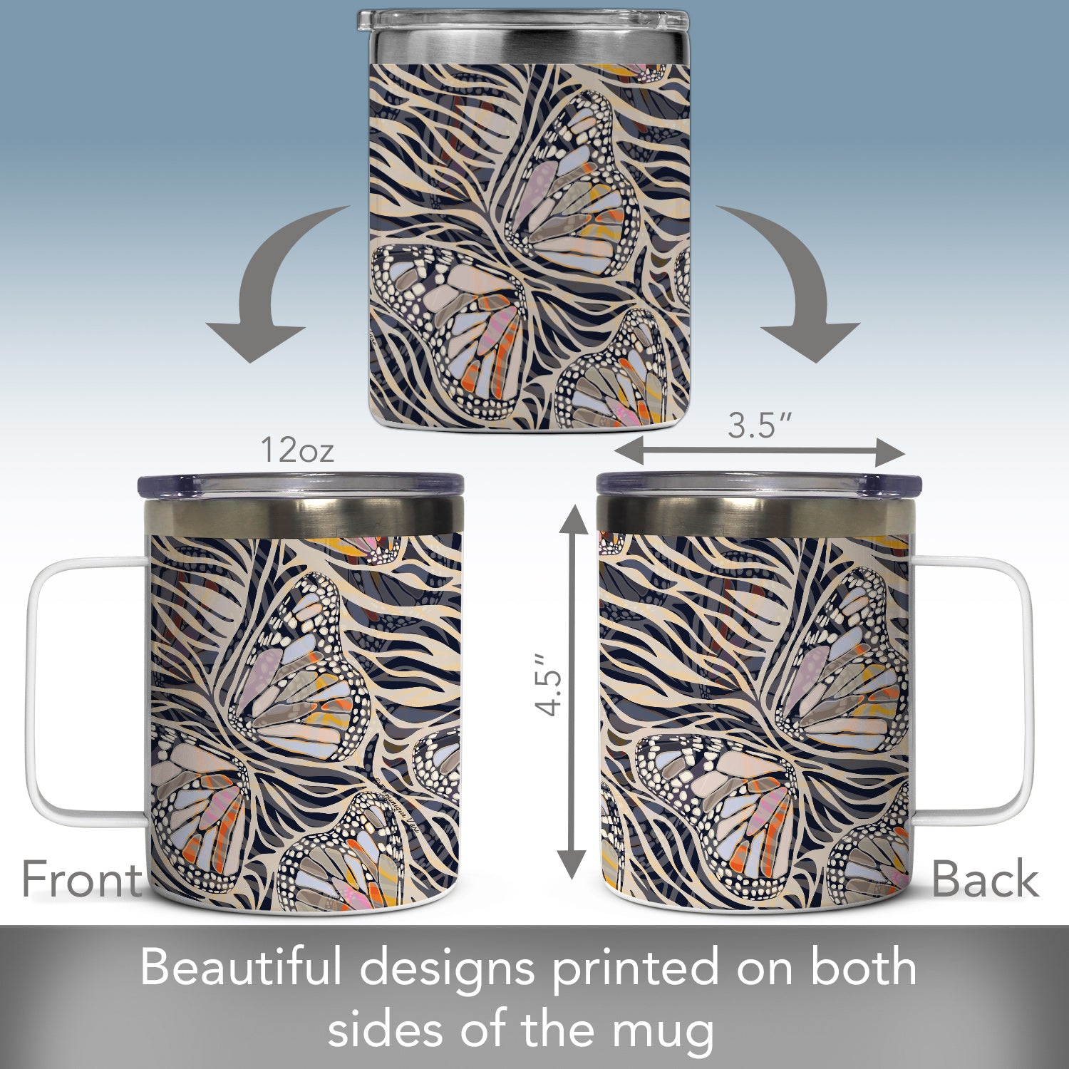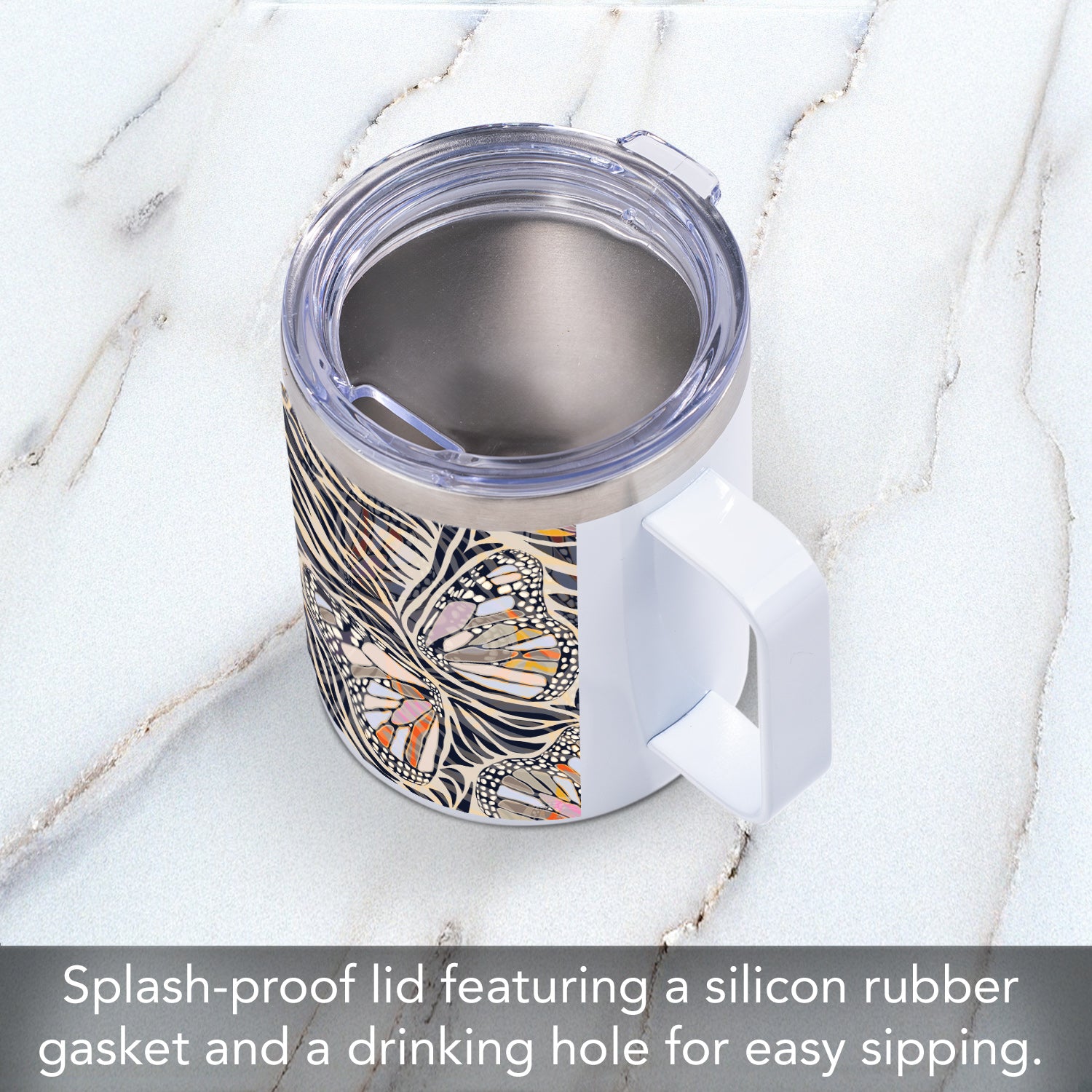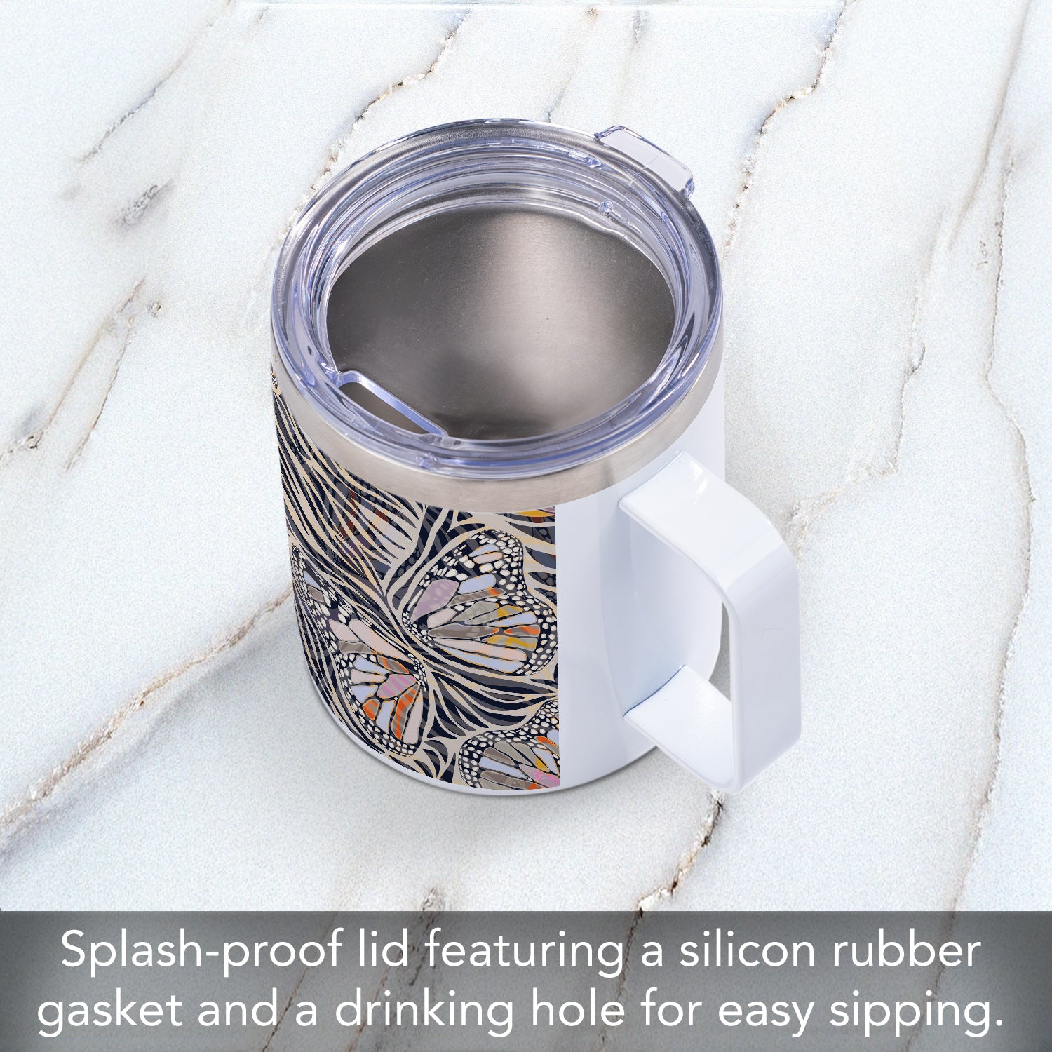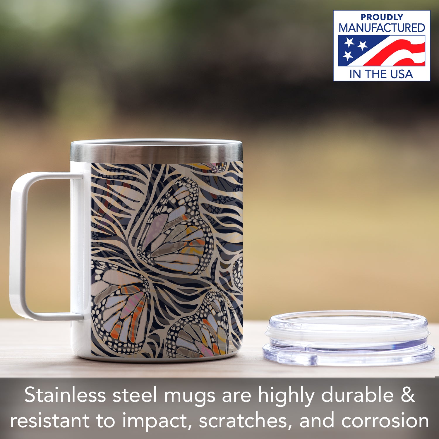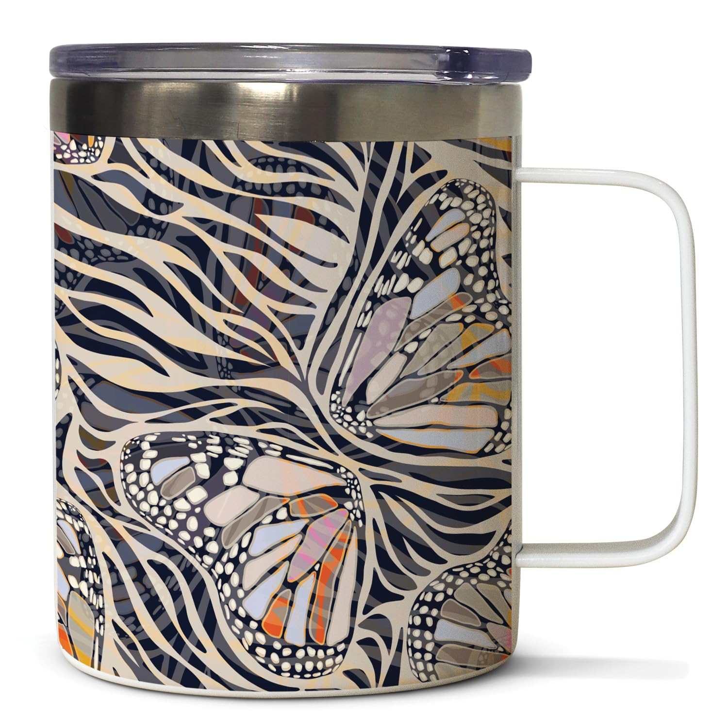 Zebra Butterflies Decorative Stainless Steel Travel Mug with Lid 12 oz. Manufactured in the USA