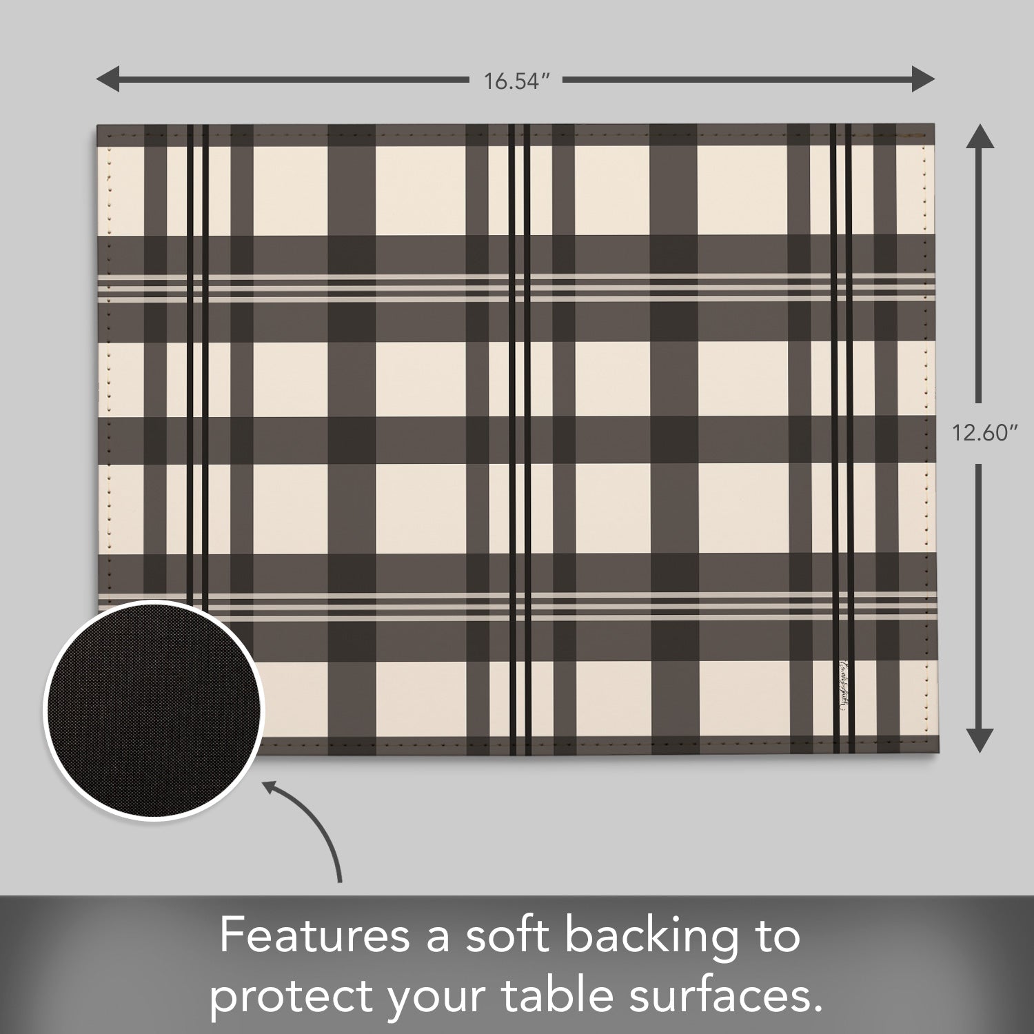 MEASUREMENTS-Each Placemat measures 16.54” x 12.6” x 0.5” and is rectangular in shape. Size allows Plate, Utensils, and Drink to all fit on the Placemat.