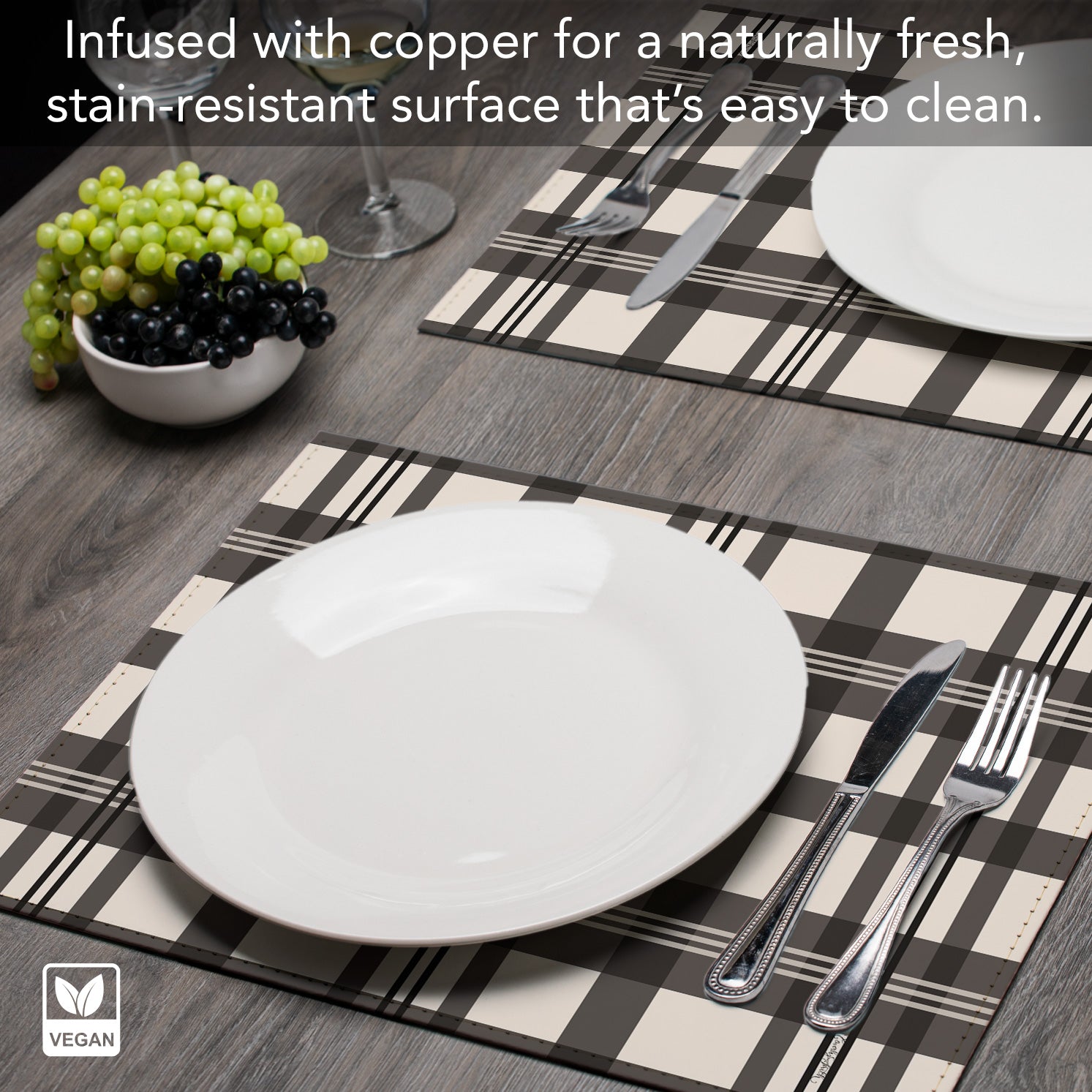 COPPER INFUSED-Infused with Copper for its natural protective properties. Placemats are also Phthalate Free. Vegan Leather Placemats can easily be wiped clean with a damp cloth and mild detergent. Then dry with a towel or microfiber cloth.
