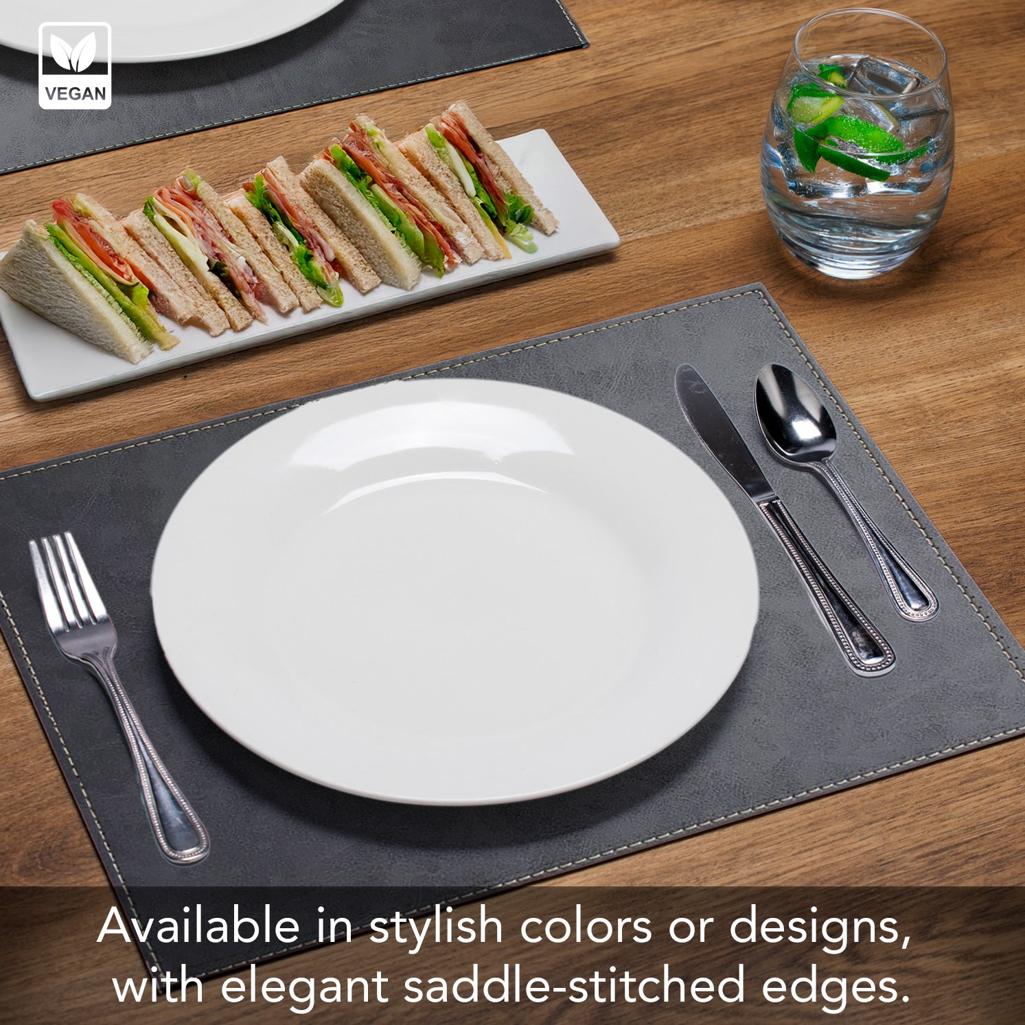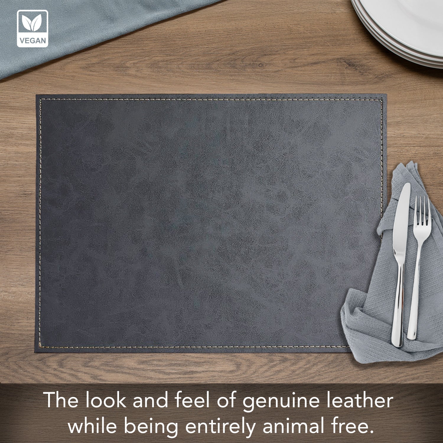 CONSTRUCTION-Vegan Leather Placemats offer the luxurious look and feel of genuine Leather while being entirely animal-free and environmentally conscious. Each Placemat features saddle stitched edges and a soft polyester backing to protect your table surfaces. Firm Inner Core keeps the edges from lifting.