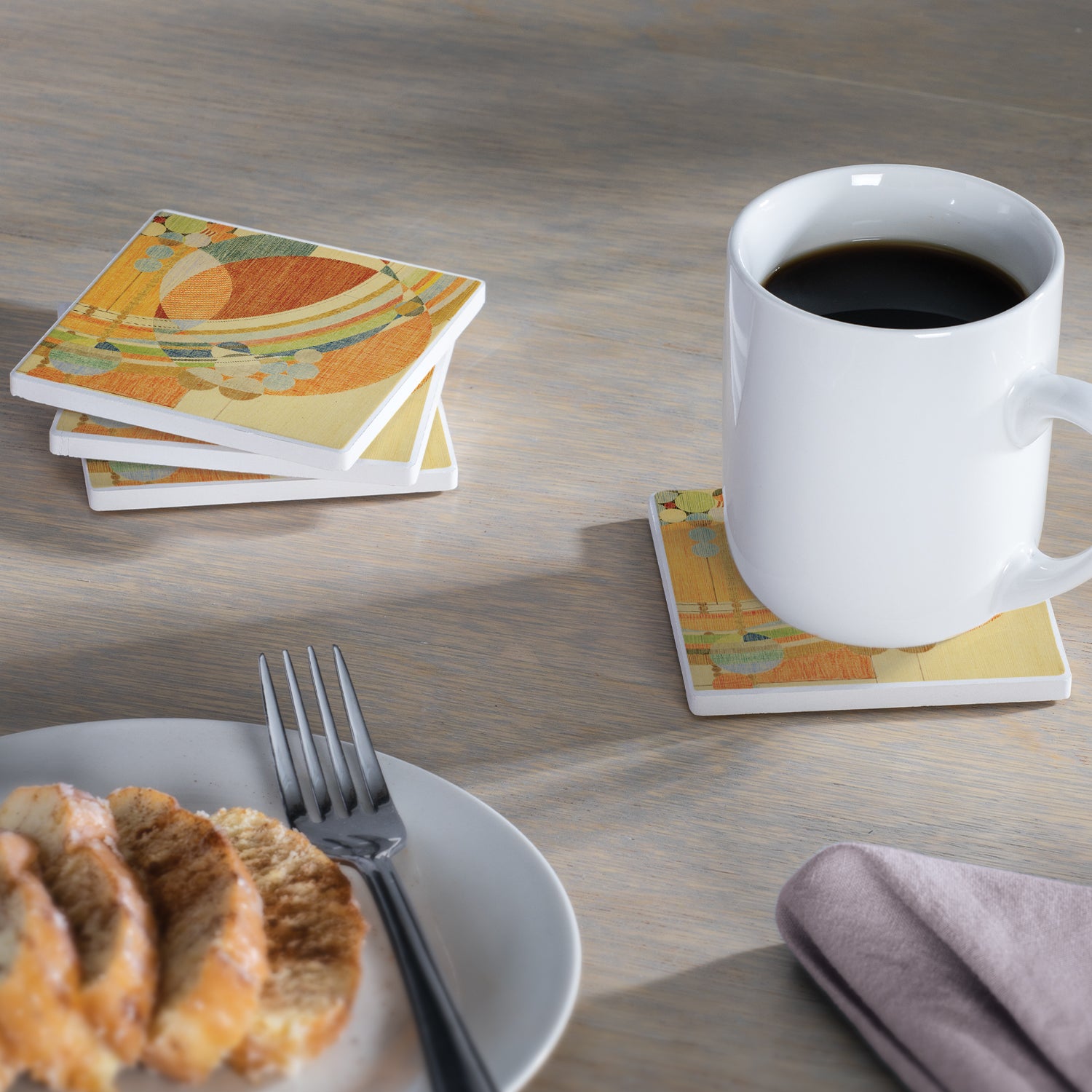 MEASUREMENTS-Each Coaster measures 4” x 4” x .25”. Size allows for a larger glass or cup to be placed on them.