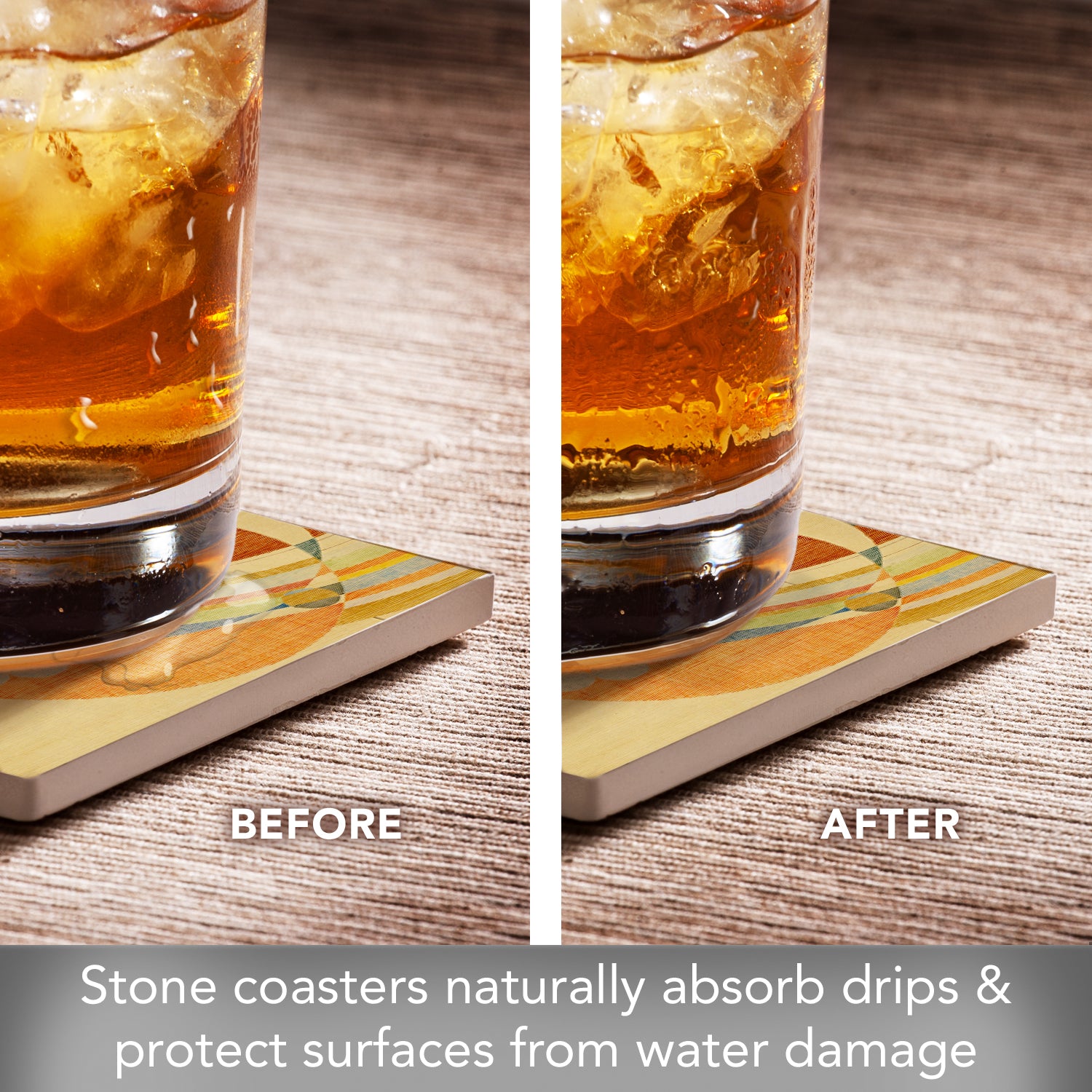 ABSORBENT STONE-Set of 4 natural absorbent stone coasters. Constructed of absorbent stone that absorbs drips and condensation. Absorption prevents rings and stains.