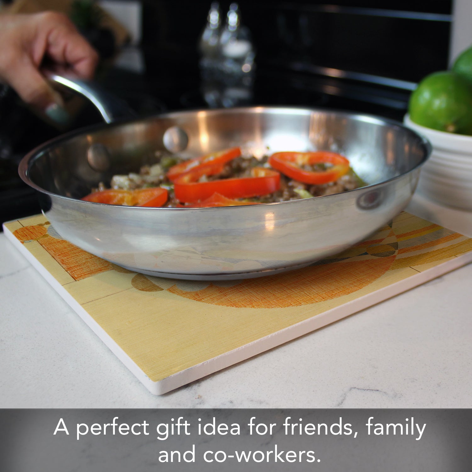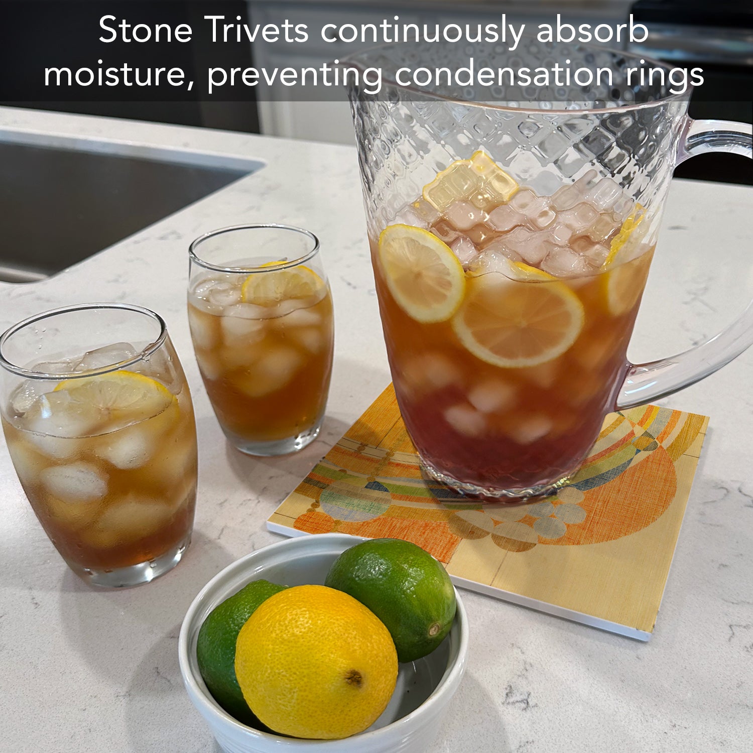 DURABLE-Trivet is made from strong durable ceramic stone. Stone absorbs heat and distributes it throughout the Trivet to keep from damaging your favorite pots and surfaces.