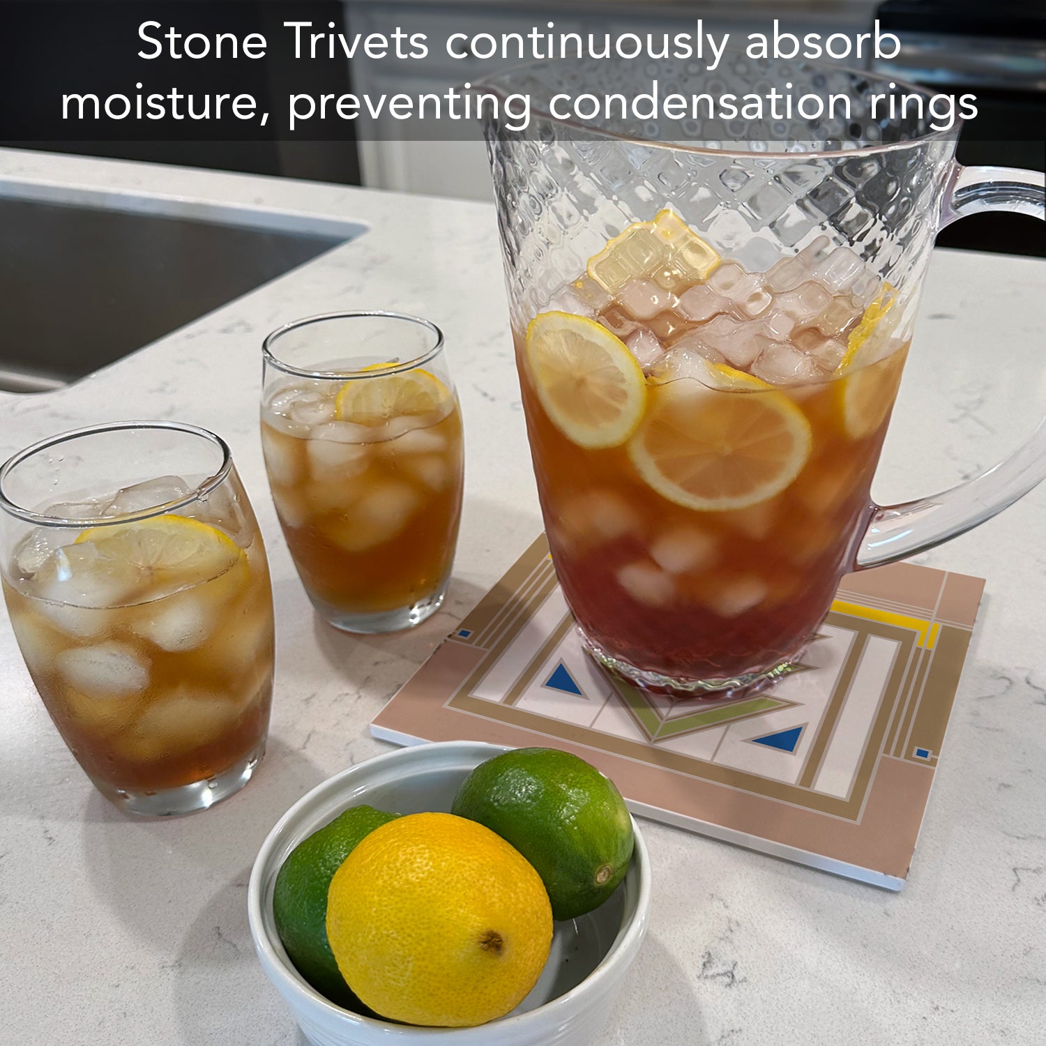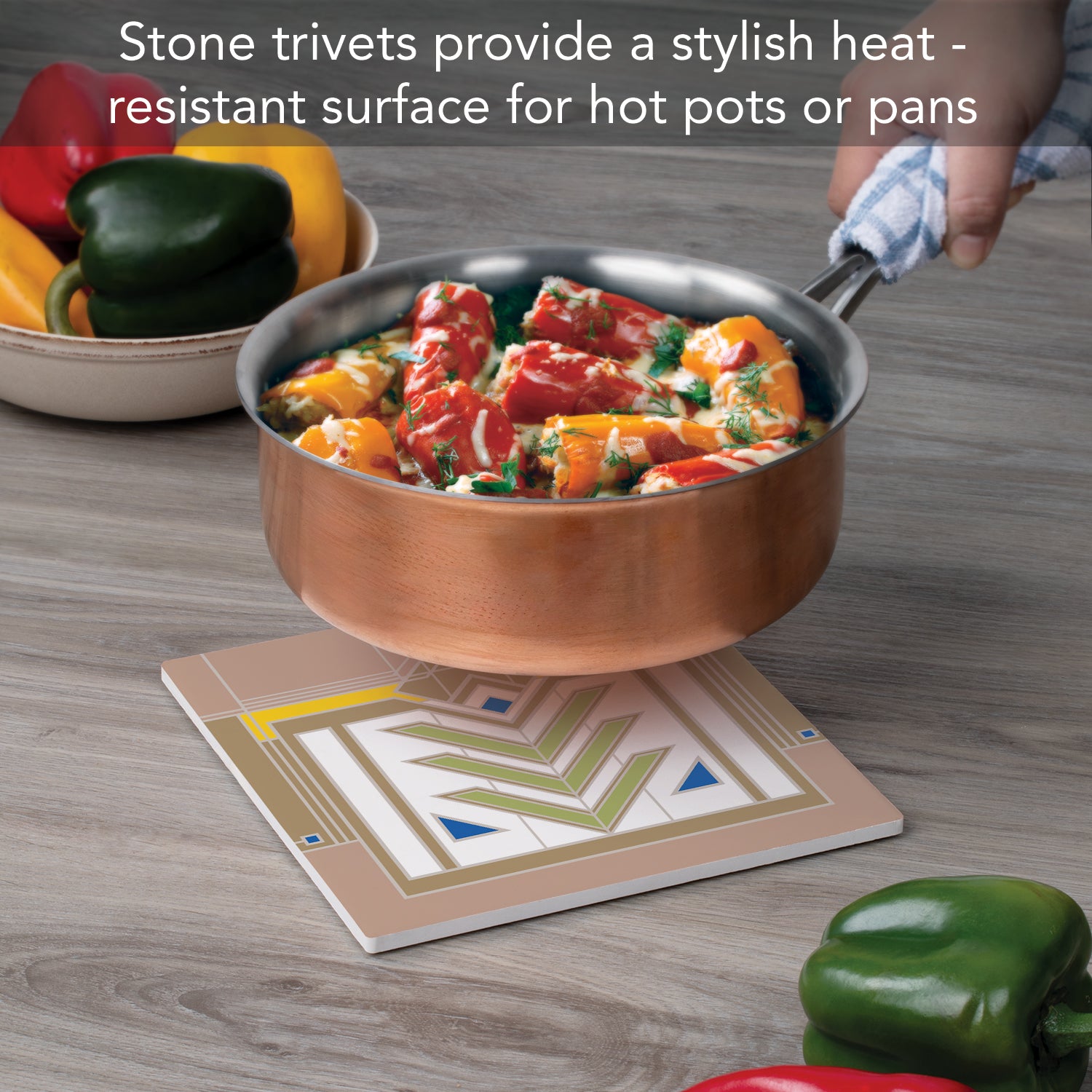 DURABLE-Trivet is made from strong durable ceramic stone. Stone absorbs heat and distributes it throughout the Trivet to keep from damaging your favorite pots and surfaces.