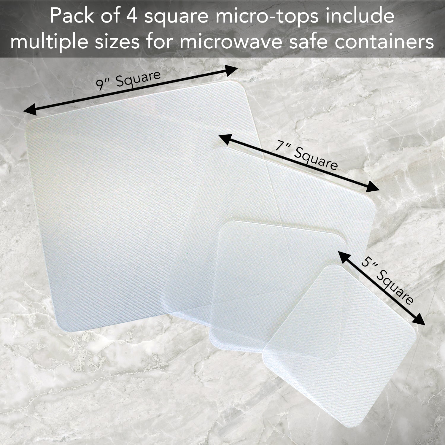 - PACK OF 4 SQUARE MICRO TOPS INCLUDE one 9 inches, 7 inches and two 5 inch splatter guards.