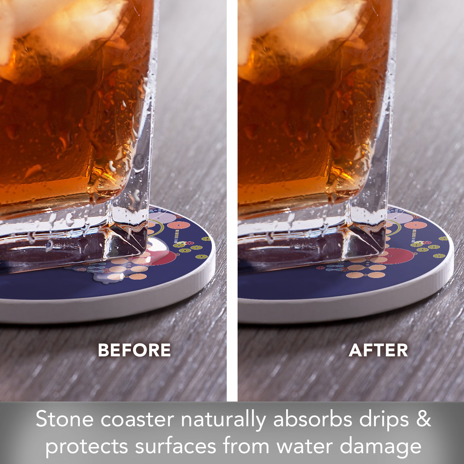 ABSORBENT STONE-Coasters arrive as a set of 4 Coasters. Each Coaster is constructed of absorbent stone that continuously absorbs drips and condensation from your beverages while preventing stains and rings on your furniture.