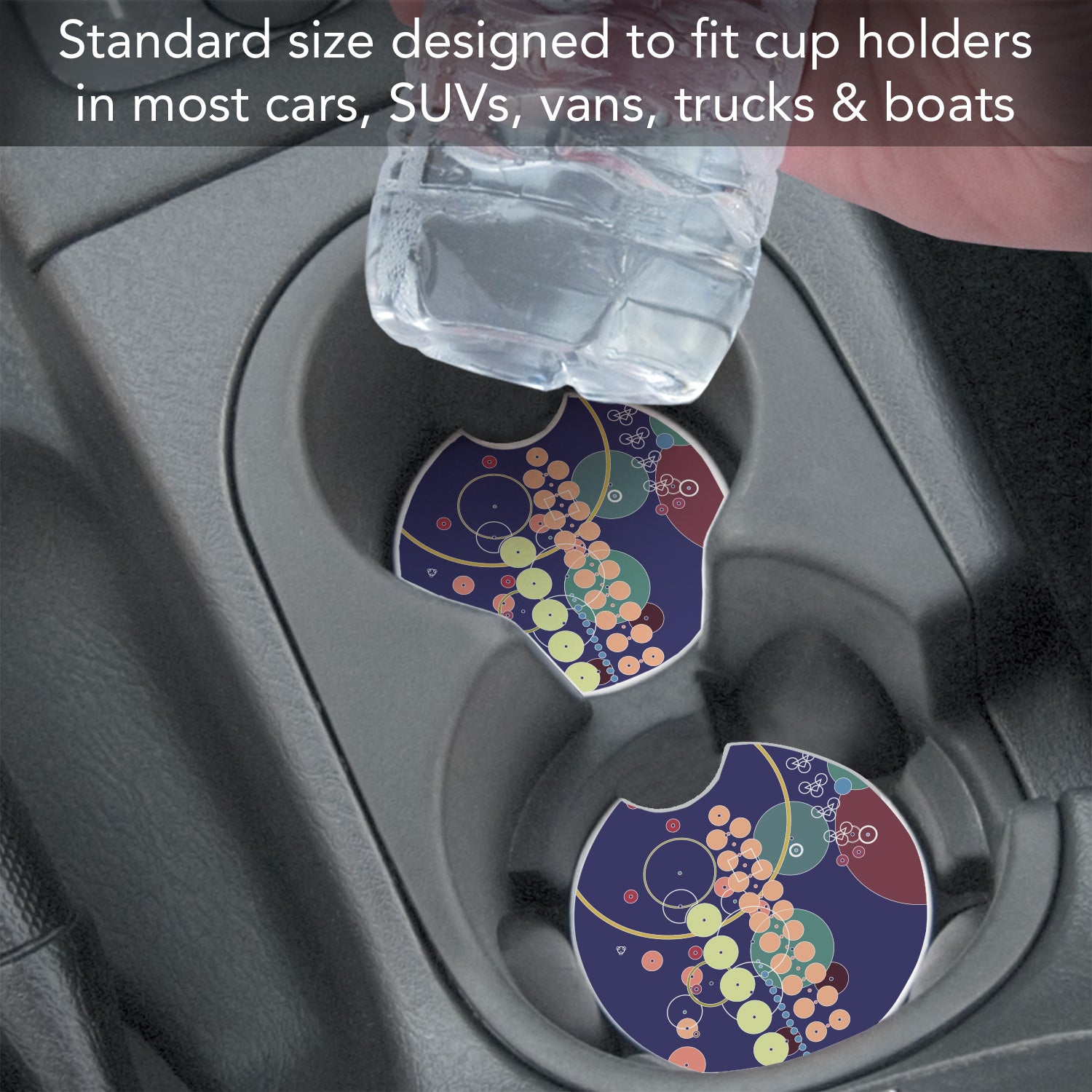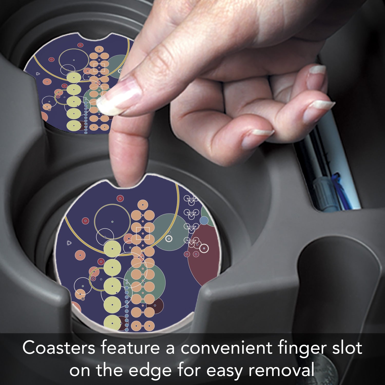 FEATURES-Car Coaster features a convenient finger slot on the edge for easy removal from cup holder. Car Coaster assists in keeping your vehicle cup holder clean and dry. Easy to remove when detailing your car. Designed to fit cup holders in most cars, trucks, or boats.