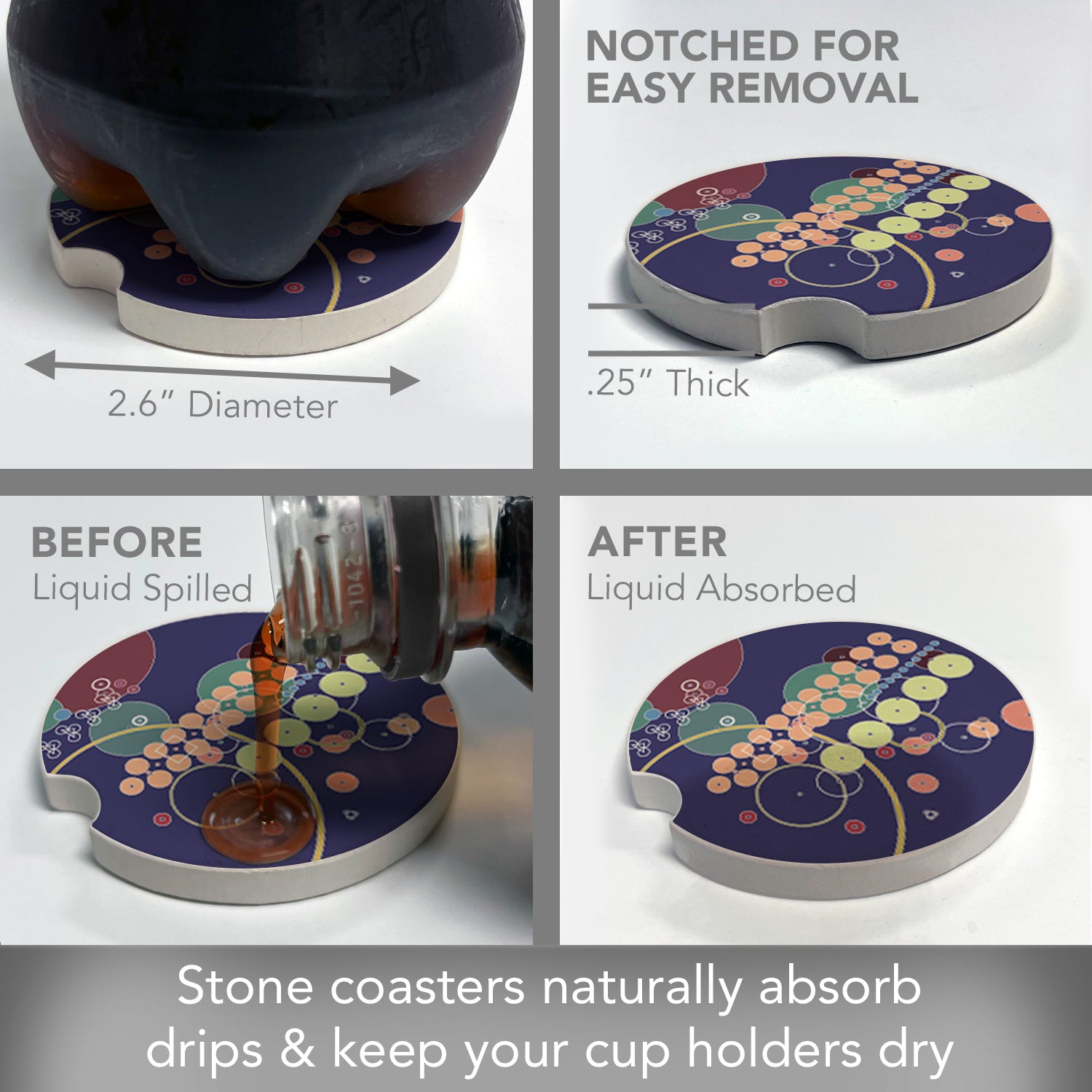 ABSORBENT STONE-Car Coaster is constructed of natural absorbent stone that absorbs drips and condensation from beverages in your vehicle’s cup holder.