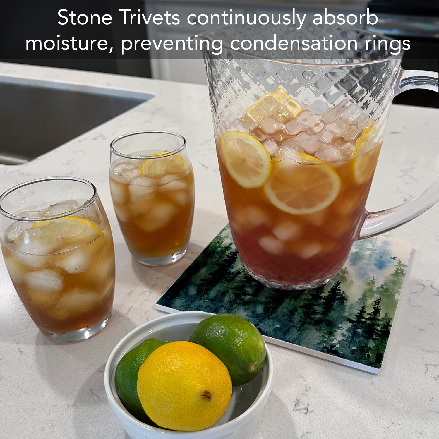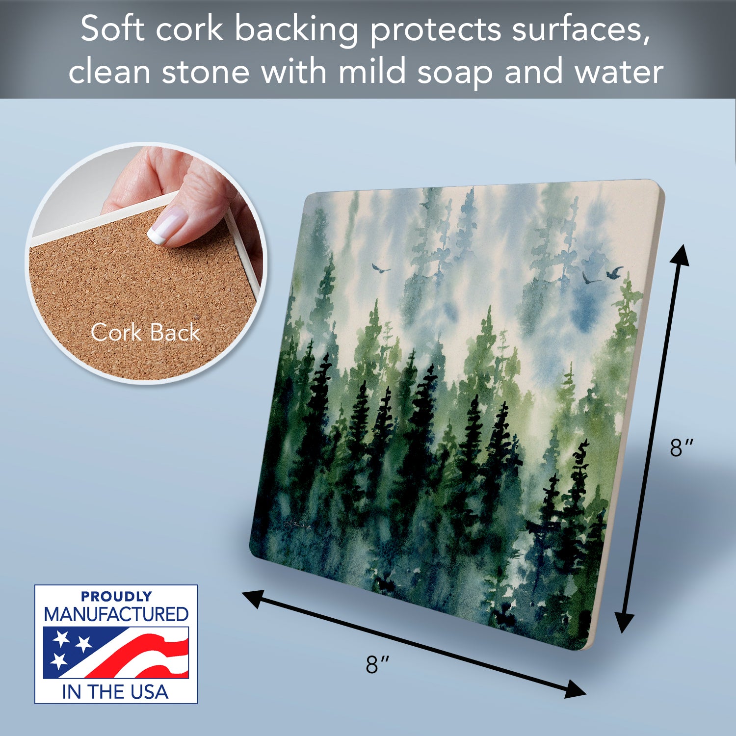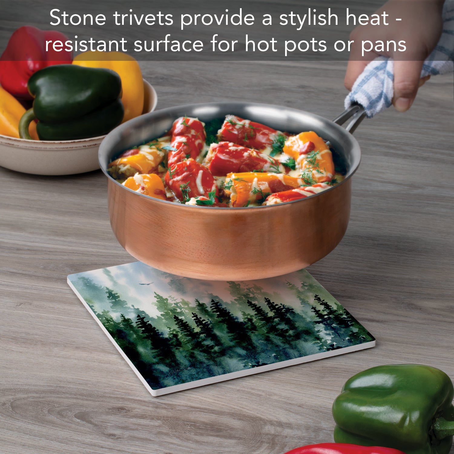 Thirstystone Misty Tree Line Decorative Heat Tolerant Stone Trivet with Non-Skid Cork Backing 8” Square