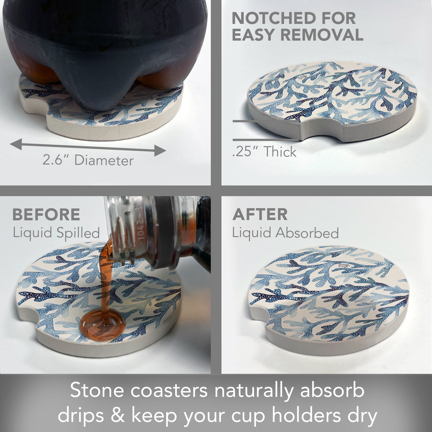 ABSORBENT STONE-Car Coaster is constructed of natural absorbent stone that absorbs drips and condensation from beverages in your vehicle’s cup holder.