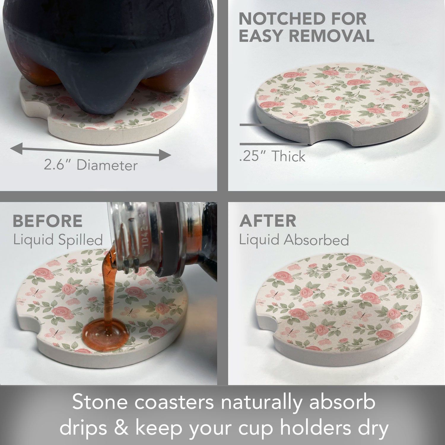 ABSORBENT STONE-Car Coaster is constructed of natural absorbent stone that absorbs drips and condensation from beverages in your vehicle’s cup holder.