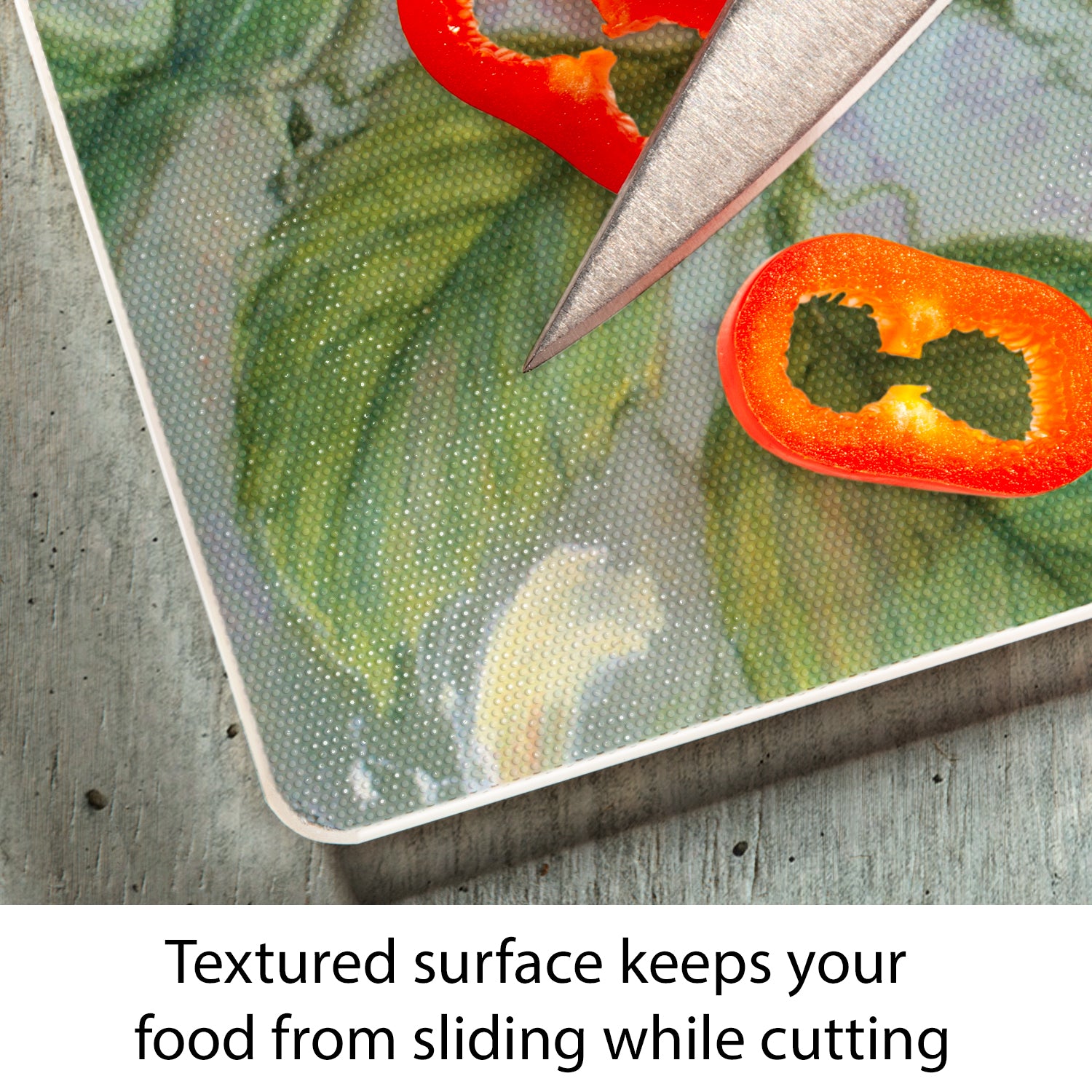 - FEATURES-Surface of Cutting Board is slightly textured to help keep foods stable as they are being chopped and diced. Rubber Non-Skid feet on bottom of the board protects your surfaces from scratches and stains.
