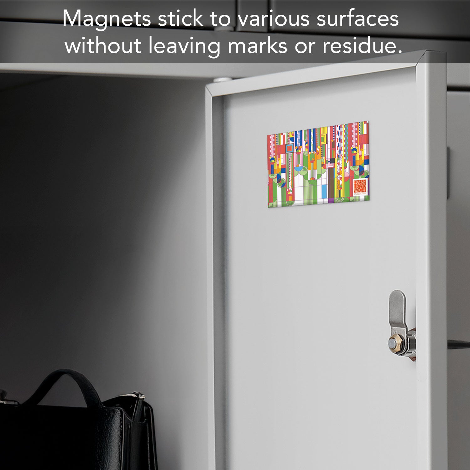 MEASUREMENTS- Magnet measures 3.5” x 2.5” x 0.10”. While the Magnet has a compact size, they possess a strong magnetic force, making them ideal for securing items to your fridge, file cabinets, or other metallic furniture.