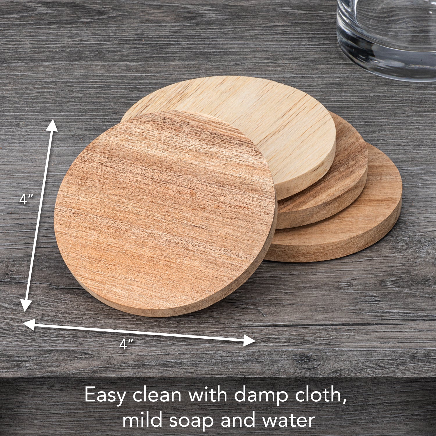 MEASURES- Each Coaster measures 4” x 4” x 0.31”. Acacia Wood Coasters are easy to clean with a damp cloth or sponge, making them a low-maintenance option.