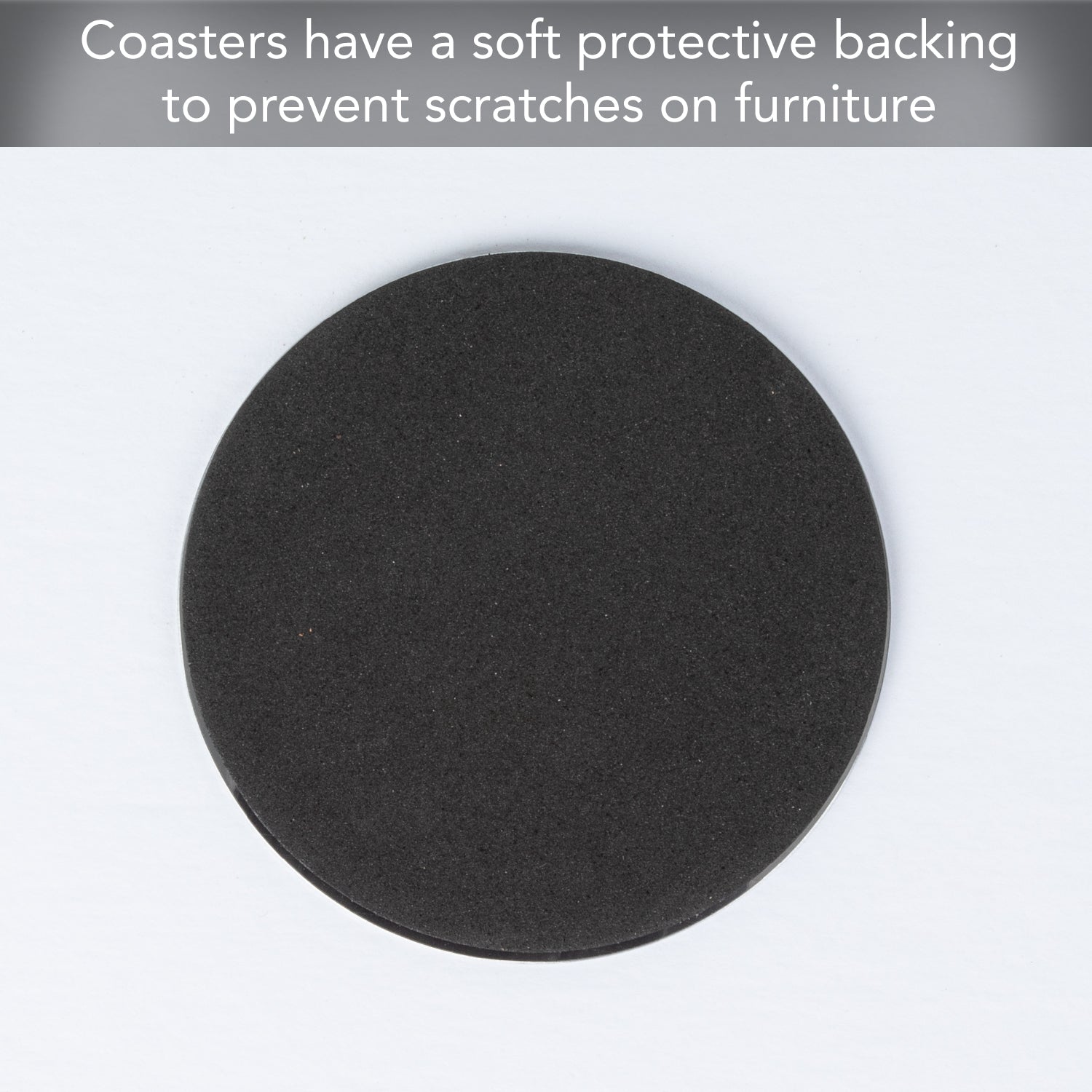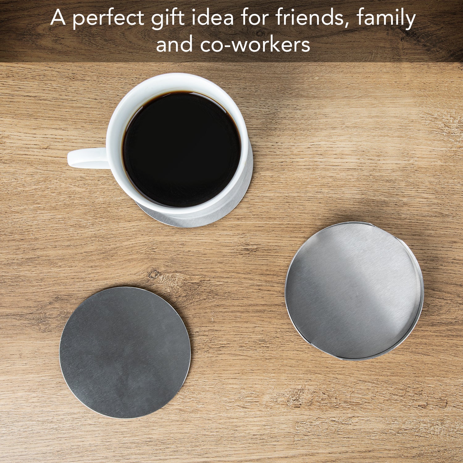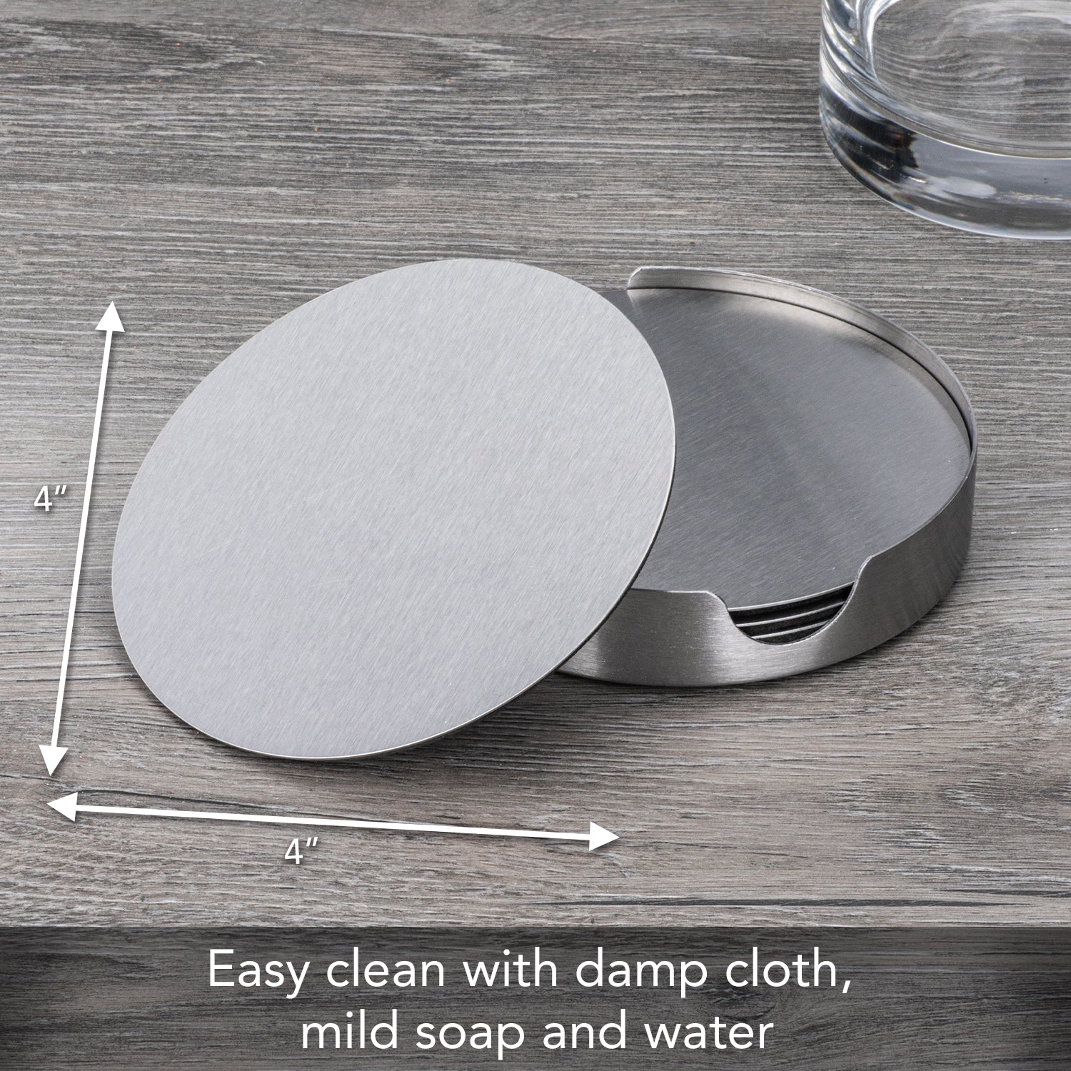 LOW MAINTENANCE- Stainless Steel Coasters are easily cleaned by wiping with damp cloth or sponge. Each Coaster measures 4” x 4” x 0.43”.