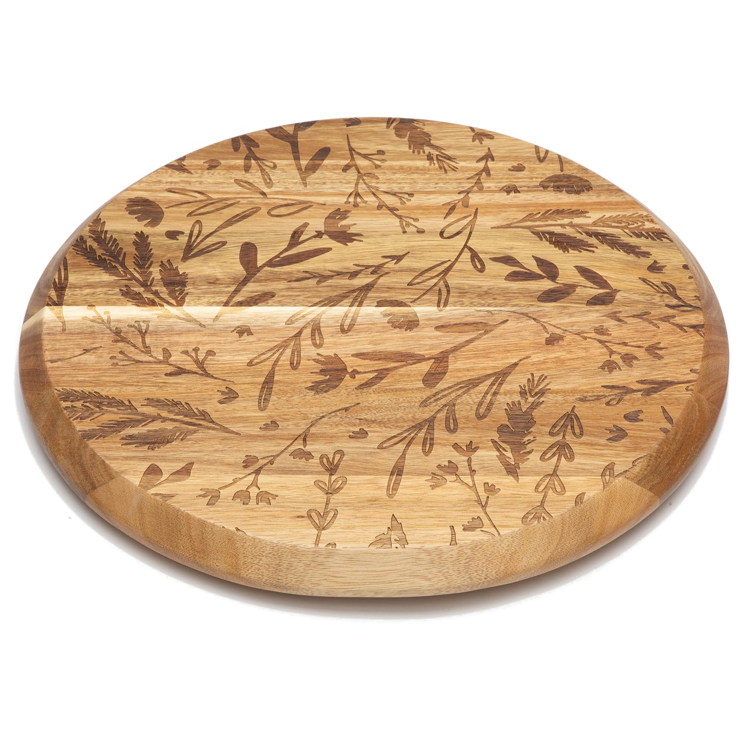 Acacia Wood Lazy Susan, Round Turntable for Serving, Kitchen Organizer & Rotating Platter - Meadow with Etched Floral Design