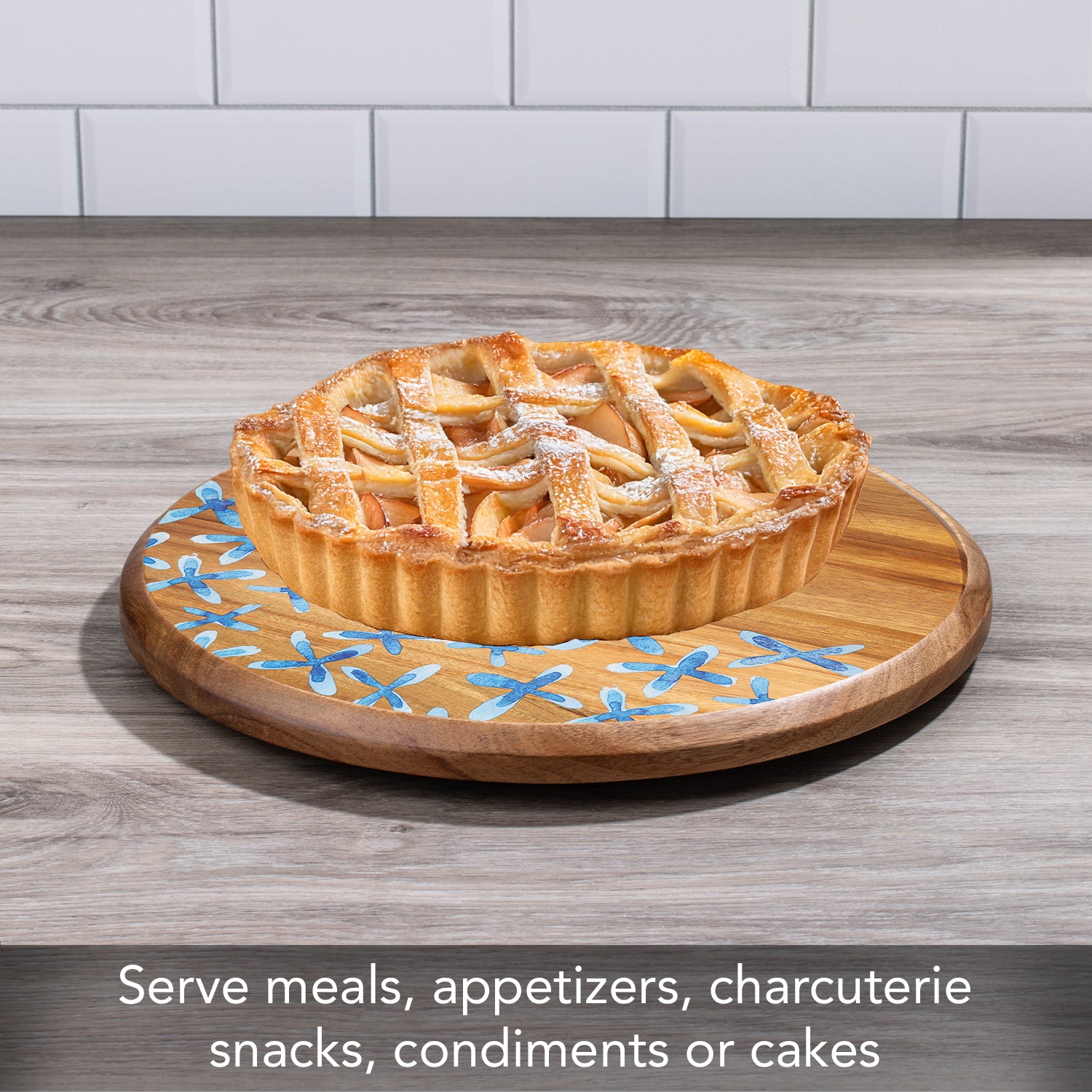 Acacia Wood Lazy Susan Turntable with Decorative Blue Floral Design 14" Diameter Condiment Caddy, Server, Kitchen Organizer