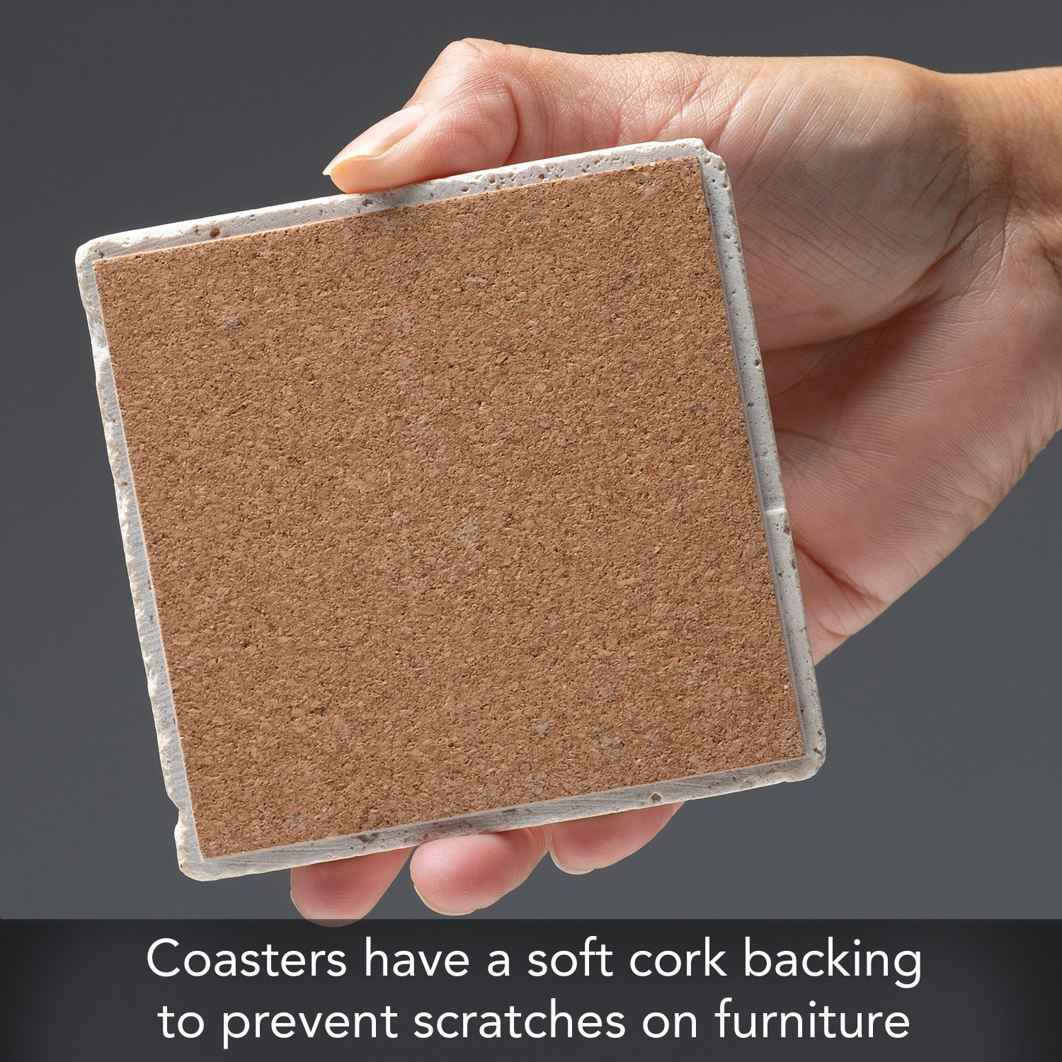 AUTHENTIC TRAVERTINE STONE-Each Coaster is made from authentic natural Travertine that is mined in the mountains of Turkey. We then import this natural stone and manufacture the Coasters in the USA. Travertine Stone is a form of terrestrial limestone that is deposited around mineral springs. Travertine Stone is known to be very durable and absorbent. Travertine Stone has a distinctive striking appearance.